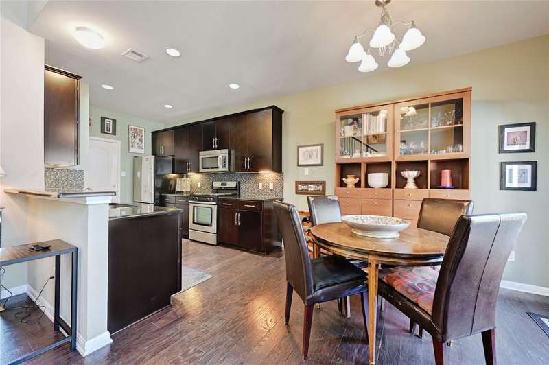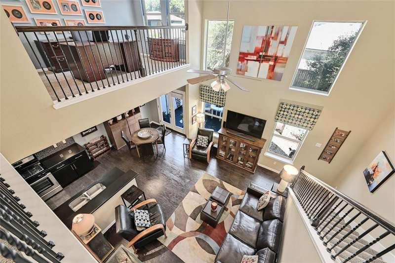 Beautifully maintained end-unit, 2 story condo in a small South Austin Community offering 3 bedrooms, 2.5 baths and two living areas. Bright, open floor plan with wood floors in the entry, living, dining and kitchen. The living area features a soaring two-story ceiling and is open to the dining room and kitchen with granite countertops, glass tile backsplash, breakfast bar, great cabinet space and pantry. The Primary suite is on the main level and includes a window seat, ceiling fan, walk-in closet and tiled walk-in shower. Upstairs offers two spacious bedrooms with walk-in closets and a second living area, full bath and laundry room. Private fenced patio and deck with eastern exposure - perfect for morning coffee or relaxing evenings. One-car attached garage with opener and keypad entry. Community pool located just across the the street. The HOA maintains the landscaping and pool for easy lock-and-leave living. Conveniently located near Armadillo Den, Moontower Saloon, South Austin Beer Garden and Canterbury Trails Neighborhood Park . HEB is less than 2 miles away. Google Fiber Available.