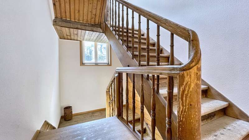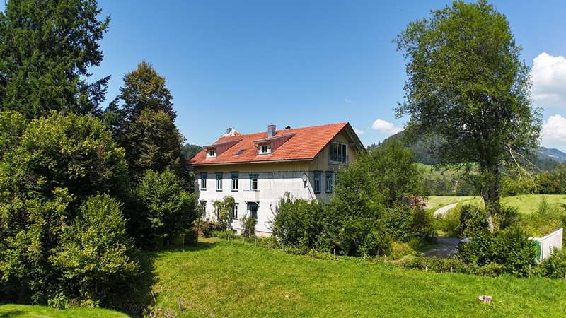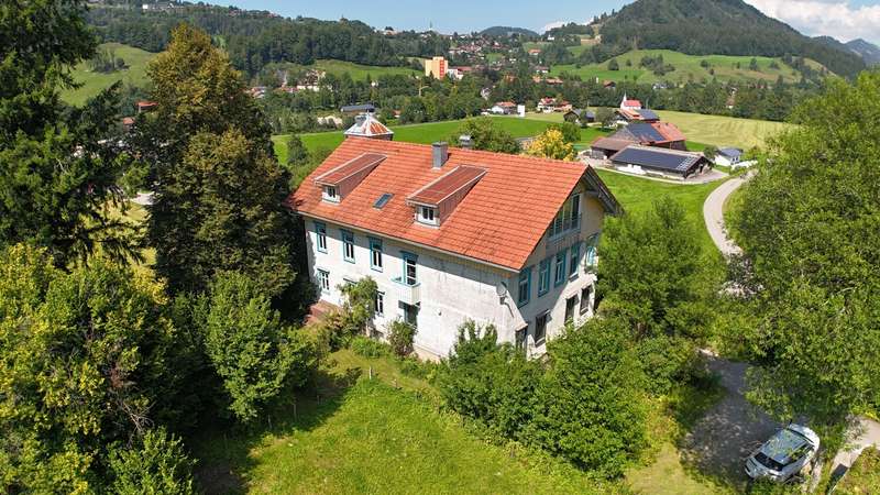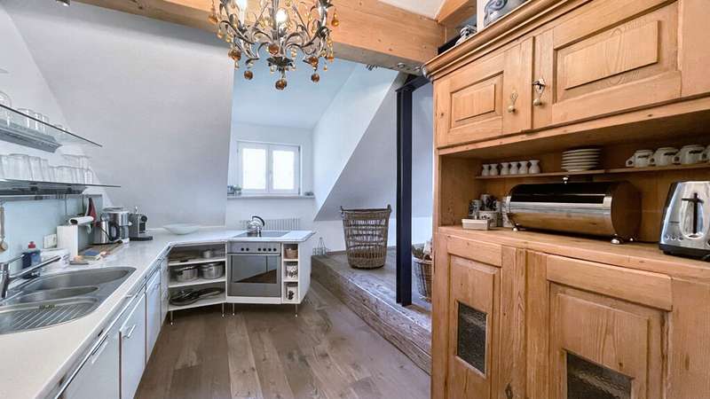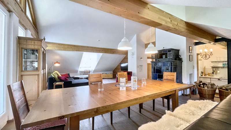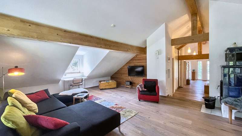 Welcome to a very special living environment - high up in the attic of Oberstaufen's historic schoolhouse. This striking building has dominated the outskirts of the village since the end of the 19th century and has been carefully maintained and renovated over the decades. Its history can still be felt today: when you enter the house, you are greeted by a beautifully preserved staircase made of solid wood, whose steps and banisters tell of craftsmanship and tradition. At the same time, you can enjoy the comfort of an apartment that was built in 2000 as part of a completely new loft conversion. The architecture was designed to allow plenty of light and air into the rooms: open roof beams, numerous dormers and large windows create a homely and bright ambience. The room layout is spacious and inviting - perfect for retreats or receiving guests. The current owners have carefully laid new floor coverings in recent years and have kept the apartment in a well-kept, harmonious condition. The loggia on the south side is particularly noteworthy: When open, you can enjoy an unobstructed view of the surrounding hills and meadows; when closed, it transforms into a cozy conservatory for quiet hours in any season. The elevator, which has been discreetly and stylishly integrated into the façade, takes you up to your floor in comfort - a rare and practical detail in a historic building. A custom-made tiled stove provides cozy warmth, making the living area a comfortable focal point. Another plus is the shared use of the garden, which offers space for many wonderful outdoor moments. Here you can enjoy a barbecue in summer, relax in the sun or simply enjoy the view of the greenery. There is also space for children - whether for a bouncy castle, games on the lawn or short discovery tours in nature right on the doorstep. This apartment is more than just a home: it is a successful bridge between the charm of bygone eras and the comfort of the present. Ideal for anyone who appreciates a special atmosphere and is looking for a living experience that goes far beyond the ordinary.