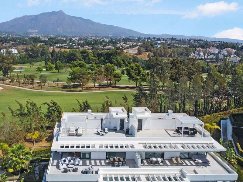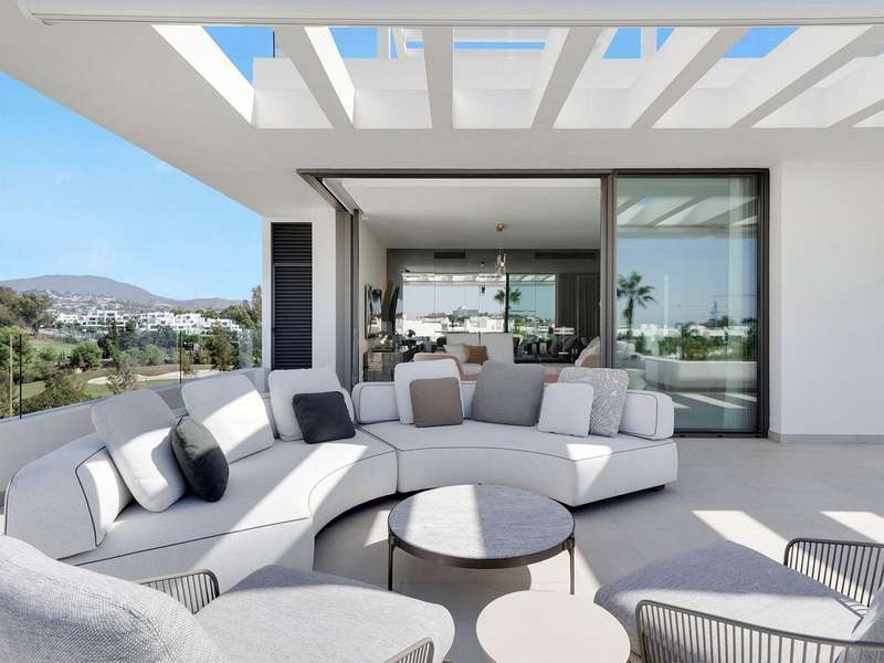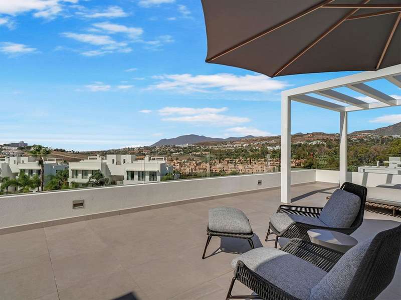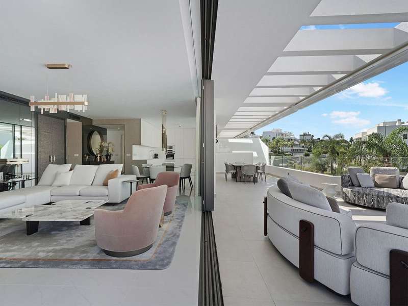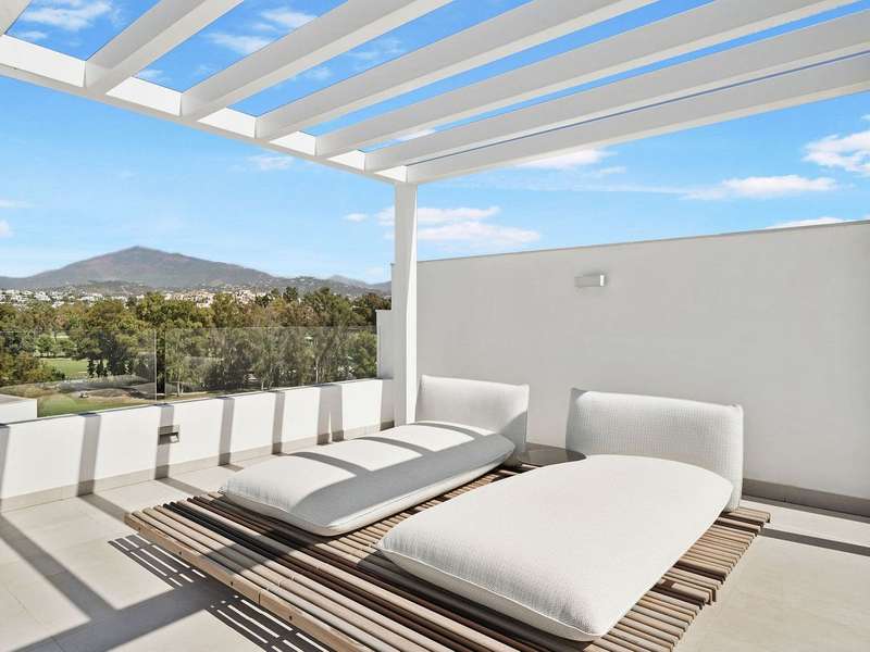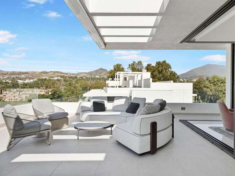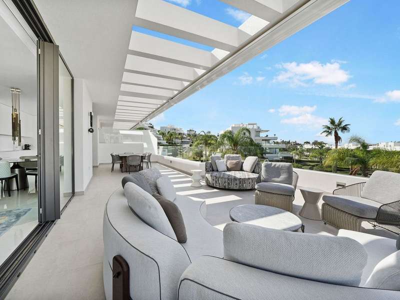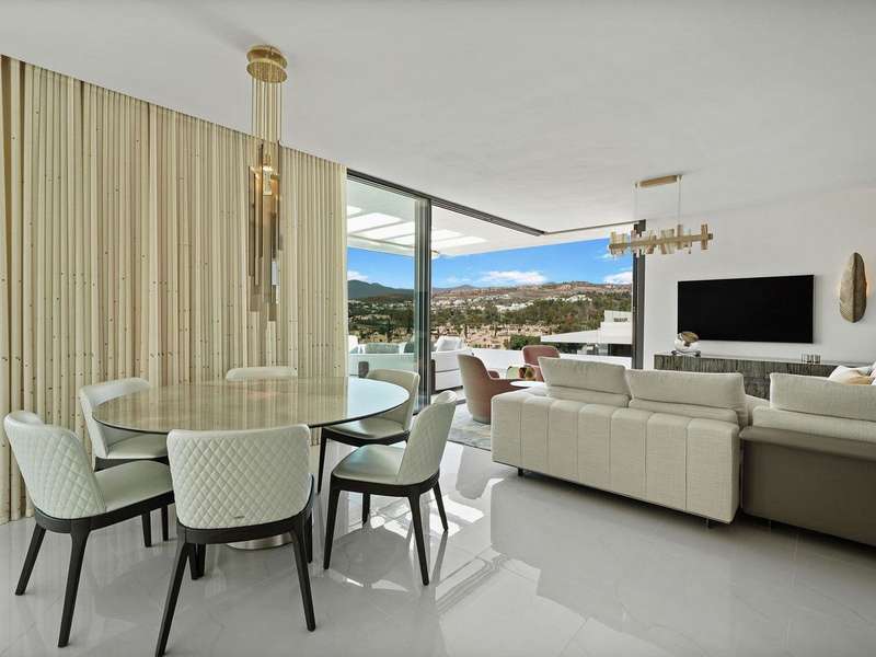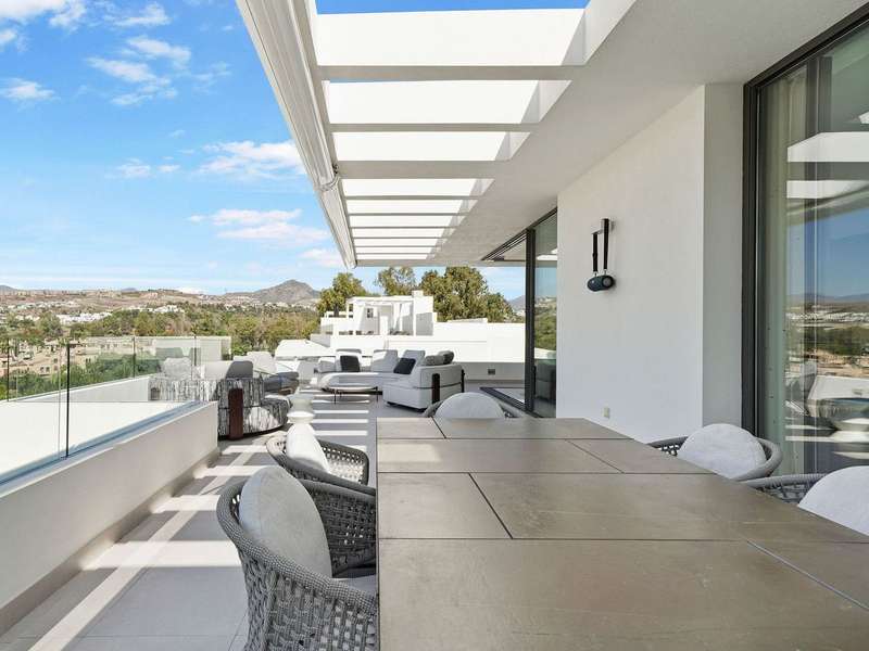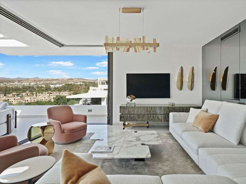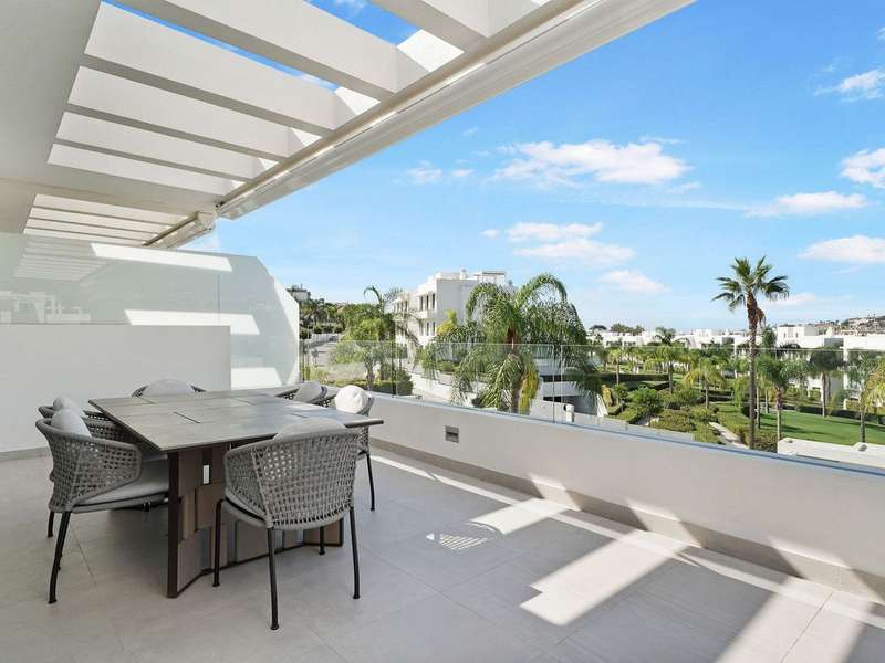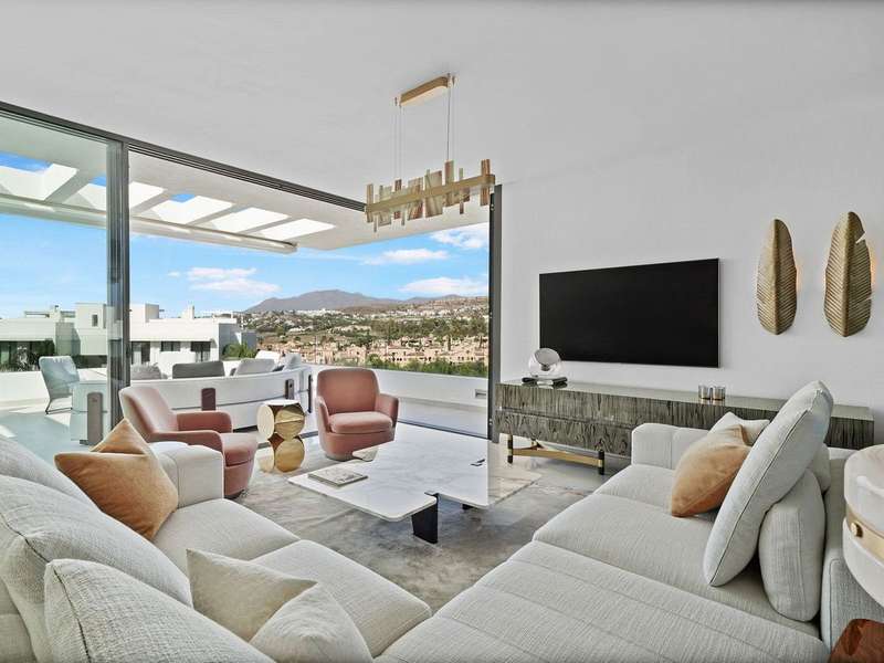 Located in the prestigious Cataleya development in Estepona, just a short walk from Atalaya Golf & Country Club, this exquisite 3-bedroom penthouse offers a perfect blend of modern design, natural light, and high-end comfort. Designed to impress, the apartment boasts a spacious open-concept kitchen, seamlessly integrated with the bright living and dining area. From here, floor-to-ceiling glass doors open onto a generous 79 m² terrace—ideal for effortless indoor-outdoor living. The sleek kitchen is fully fitted with premium Siemens appliances, catering to both everyday life and stylish entertaining. Upstairs, a spectacular 65 m² solarium awaits, complete with an outdoor shower and panoramic west-facing views—perfect for soaking up the Costa del Sol sunsets in total privacy. The property includes three elegant bedrooms and two contemporary bathrooms. Every space has been thoughtfully designed with both function and beauty in mind. Sold fully furnished, this duplex penthouse showcases