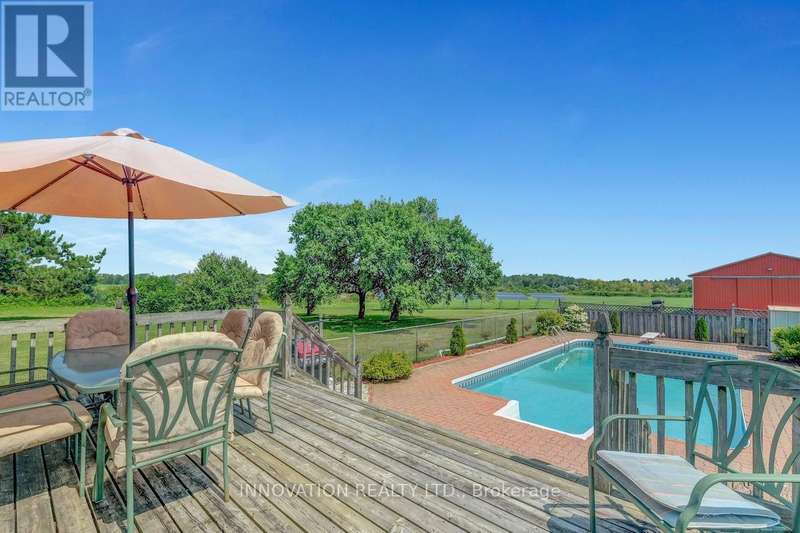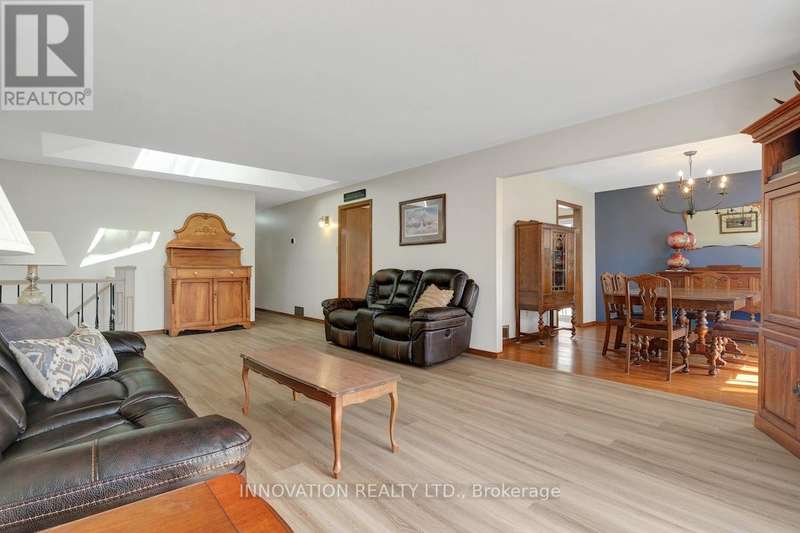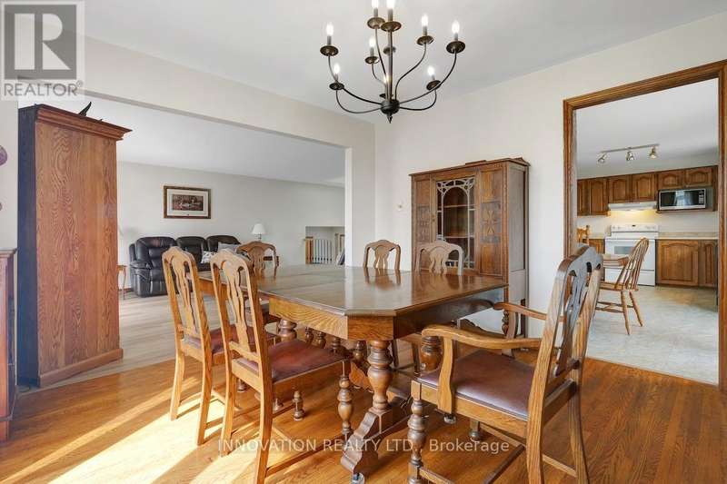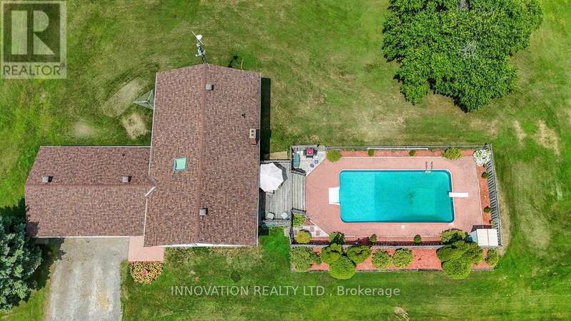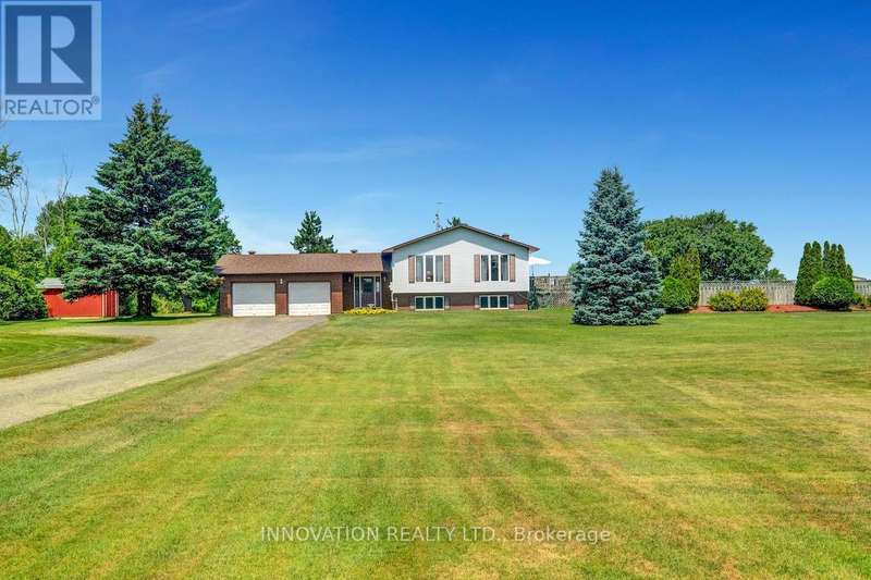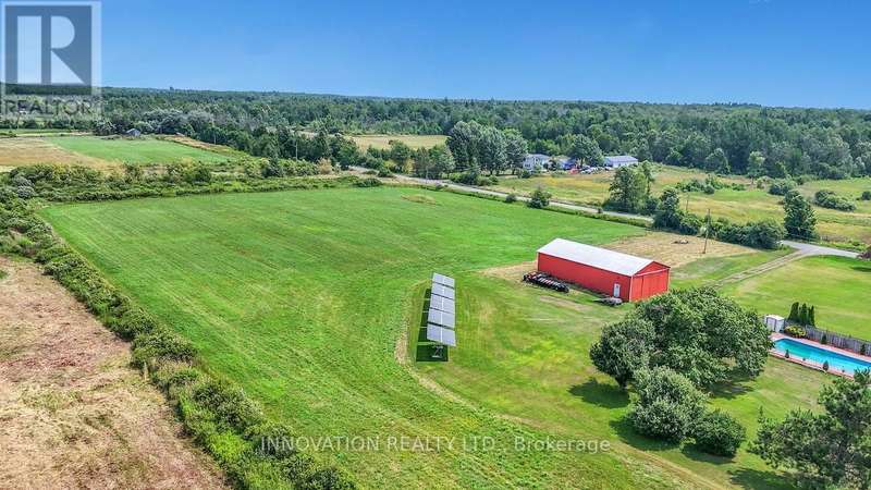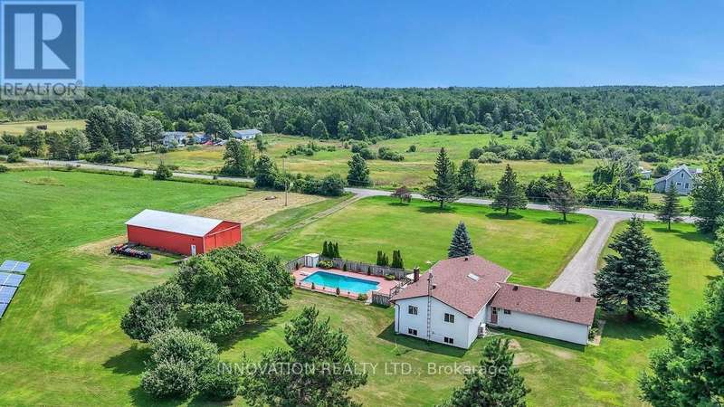 Welcome to this one-owner, custom-built raised brick bungalow, offering over 3,100 square feet of living space, perfectly situated on 6.5 acres of landscaped grounds w/mature trees, gardens & manicured lawns. Built in 1985 w/exceptional craftsmanship, this home is constructed w/solid floor joists on 12" centers, ensuring lasting durability. A spacious foyer w/dual closets & convenient half bath provide direct access to the backyard & oversized, insulated, heated double garage (23' x 22'). Upstairs, a bright open-concept living & dining room features vaulted ceilings & skylight that fills the space w/natural light. The large eat-in kitchen offers solid oak cabinetry & opens to a deck overlooking the expansive backyard. Three generously sized bedrooms & full 4-piece bath w/separate toilet & tub area complete this level. The lower level is designed for flexibility, w/fourth bedroom, extra-large family room, & dedicated laundry/storage area. Outdoors, enjoy summer in the fully fenced 18' x 36' in-ground pool, renovated in 23 & surrounded by an interlock patio. A massive 30' x 60' outbuilding w/its own driveway provides endless possibilities for contractors, hobbyists, or a home-based business, bonus additional 12' x 14' storage shed. A major highlight of this property is its solar panel system under the Ontario Hydro MicroFIT program, generating approximately $1,000 per month w/about 5 years remaining on the transferable contract (Buyer to confirm). Average hydro costs of just $250/month, the solar income significantly offsets household expenses making this not only a home, but also an exceptional investment opportunity. Recent updates include shingles (23), skylight (20), furnace & heat pump (24), as well as fresh paint, new laminate flooring in the main living areas (24). Located just 5 minutes south of Kemptville w/quick access to Highway 416, this property offers the perfect blend of peaceful country living, modern efficiency, & convenient city access. (id:6509)