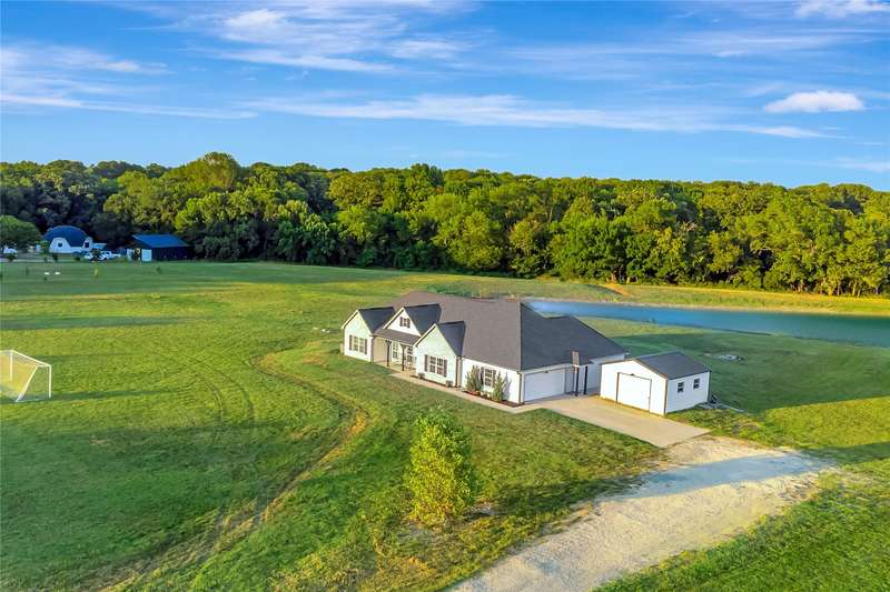 Selling all 10.12 acres at 1.2M MLS 21033629 or this beautifully designed 2020 custom home on over 5.14 acres; 4-bedroom, 2-bath, 2391 sqft. This home boasts an open-concept floor plan with nail-down hardwood floors throughout the main living areas and a cozy fireplace that adds warmth and charm.The spacious kitchen features a large island with ample seating and storage, complemented by sleek quartz countertops throughout the home. The oversized owners suite offers his-and-her walk-in closets and a luxurious ensuite bath complete with dual vanities, a soaking tub, and a separate shower.Enjoy peaceful outdoor living with a private pond shaded by mature trees and bordered by the East Fork of the Trinity Riverproviding unmatched privacy and tranquility. A 16x20 detached building is perfect for extra storage or lawn equipment.Conveniently located just 2 minutes from Preston Road, close to 75 and the upcoming Dallas North Tollway, this property blends quiet country life with easy access to town.