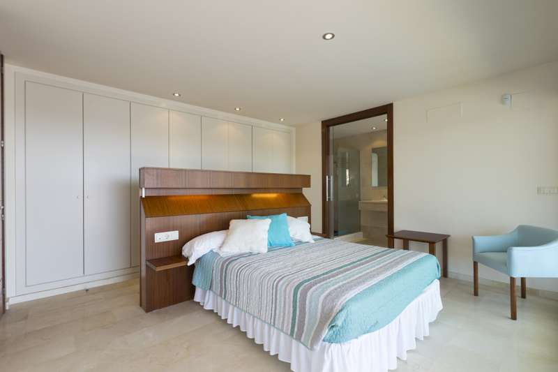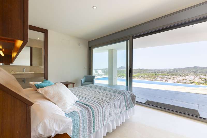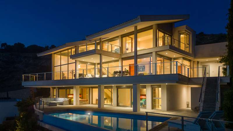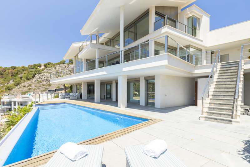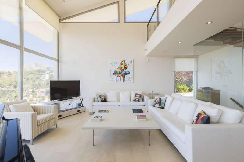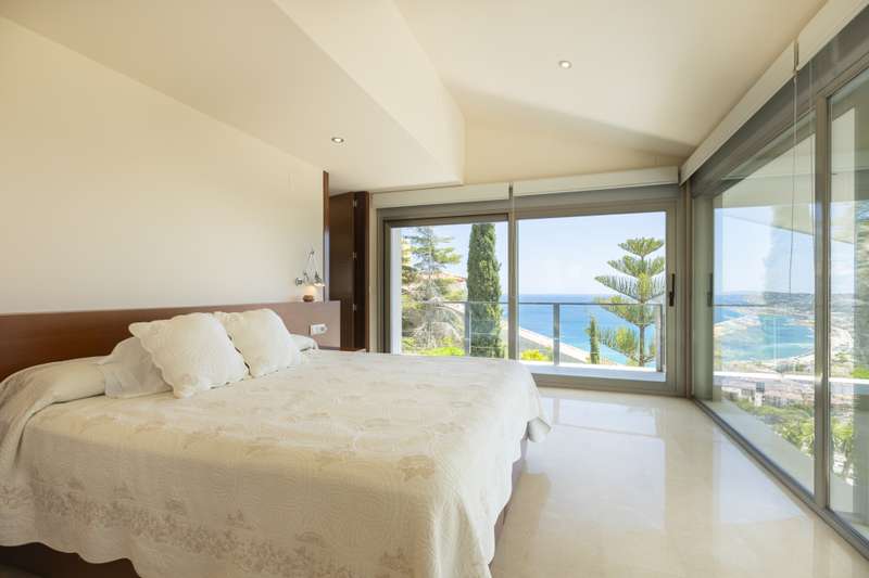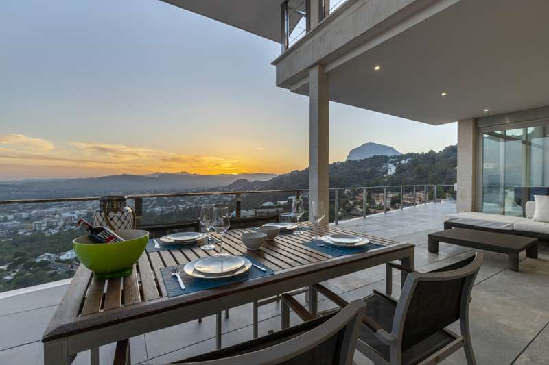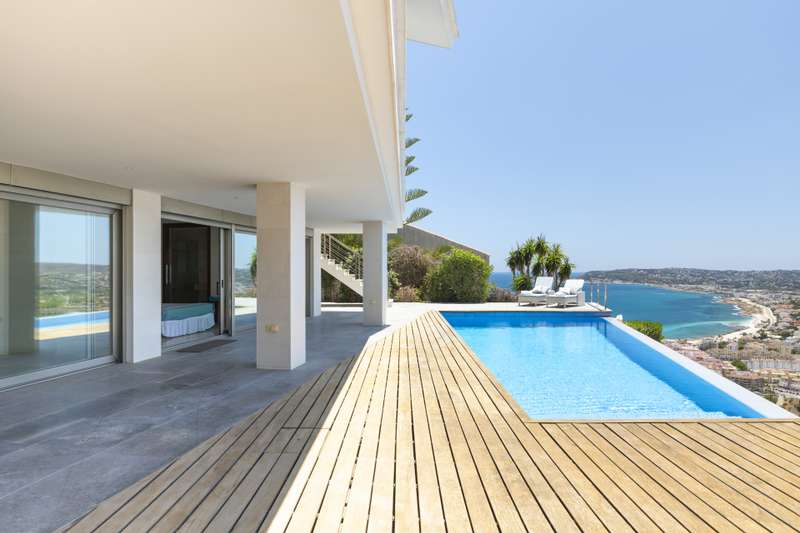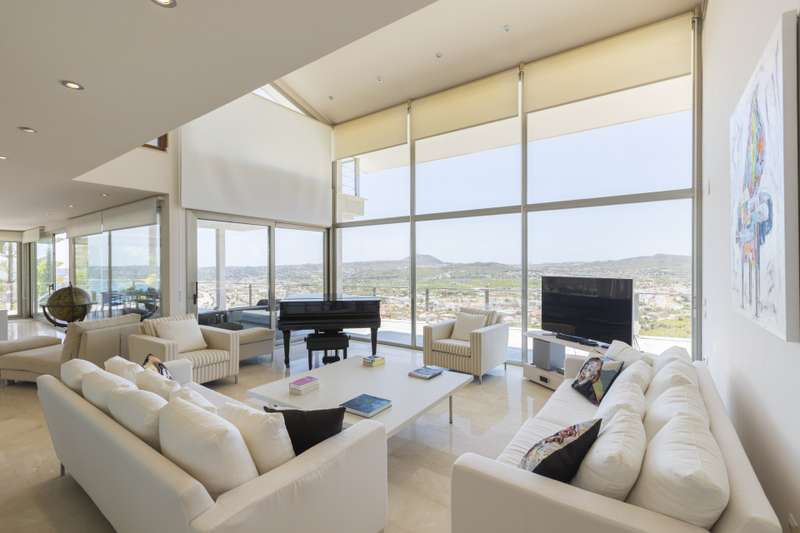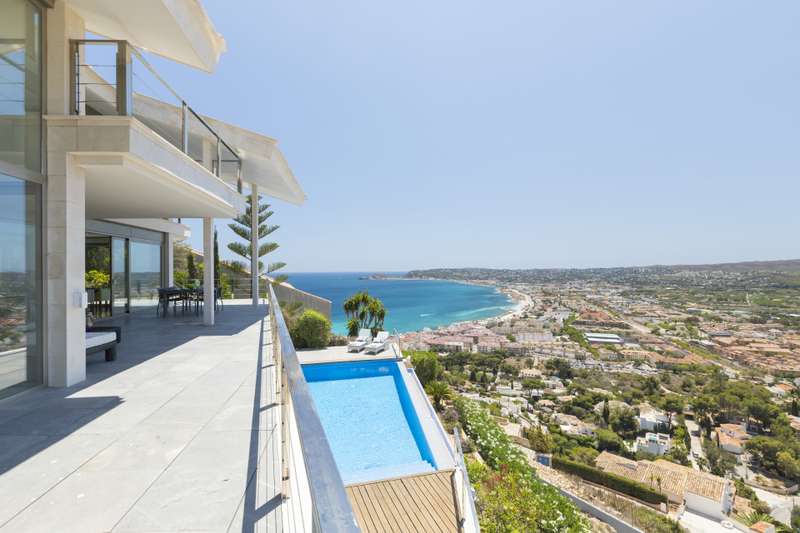 An imposing villa of modern architectural design set in a stunning living environment with unforgettable views. This avant-garde home makes use of modern materials and styles to create a truly impressive living environment. Large panoramic windows and expansive terraced areas with wood decking and a drop away infinity pool that merges with the sea, bring the outside in, ensuring a lifestyle enriched with unforgettable views over the beaches, resort areas and marinas of Javea Bay, as well as the rocky Mediterranean coastline and open sea beyond. Set in the exclusive hillside area of La Corona, private and secluded yet within a short distance from the facilities and diversions of vibrant Javea, the home is within close range of golf courses, marinas, luxury restaurants and spas, and a coastline full of peaceful beaches and coves. Inspired by minimalist modernism, the villa has been designed to be both impressively stylish and comfortable, using a combination of glass, natural stone and ceramic tiles to create a home of true distinction in which design and the outdoors feature strongly. Modern technologies and building techniques are employed to maximize open spaces while offering the latest array of home luxuries and features. Split over three floors, in which the volumes are masterfully manipulated, the ground level contains two luxuriant bedrooms with large fitted wardrobes and modern designer bathrooms. As in all rooms, open sea views are a permanent feature, whether enjoyed from within the bedrooms or their adjoining terraces. The main living area, with a spacious, stylish lounge, dining room, ultramodern kitchen with laundry and pantry, and double bedroom/office with full bathroom, is located in the intermediary level. From here, steps that are a design feature in themselves lead up to the top floor, where the main entrance to the property can be found. Built along the natural slope of the land, the property's top floor connects with the residential road that offers access, through a remote controlled gate, to the villa's driveway. From the entrance to the top floor at road level, which contains a main bedroom suite with dressing room, large bathroom and some of the best views in the home, the property flows downwards through the living areas towards imposing stone-clad and wood-decked terraces that culminate in an exotic infinity pool whose drop-away edge merges with the horizon and colours with the changing hues of the day. In short, a beautifully sculpted modern villa in an inimitable setting overlooking the Mediterranean Sea.