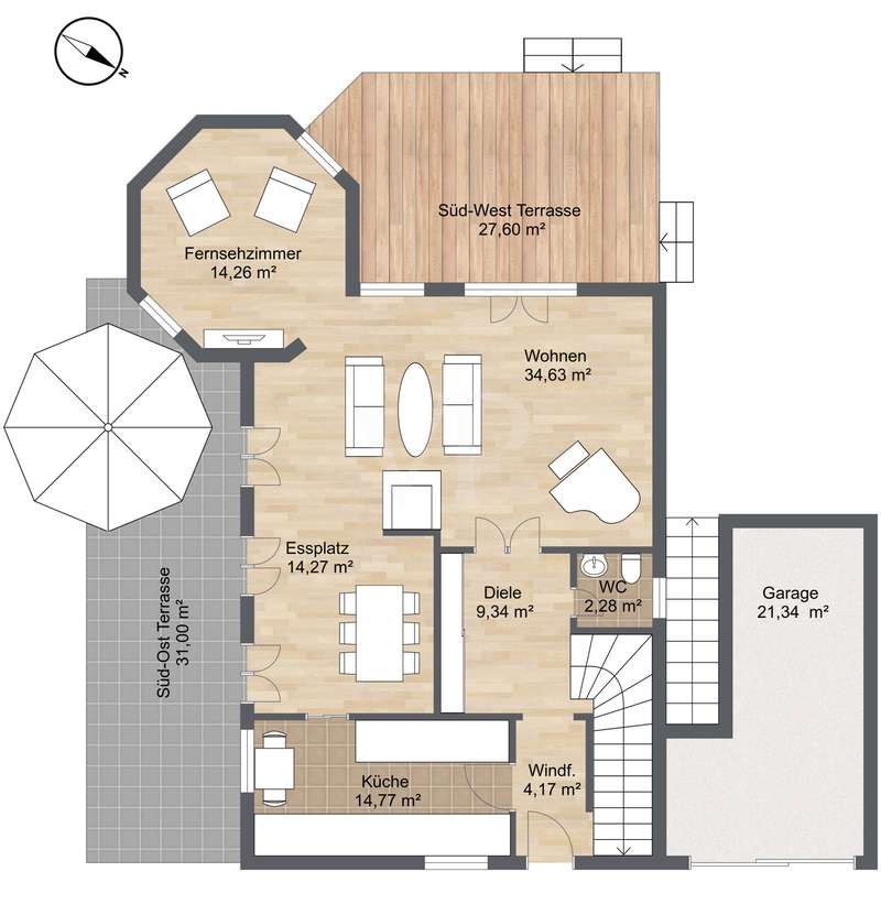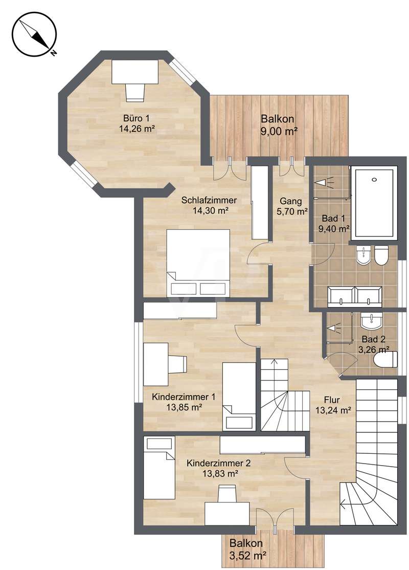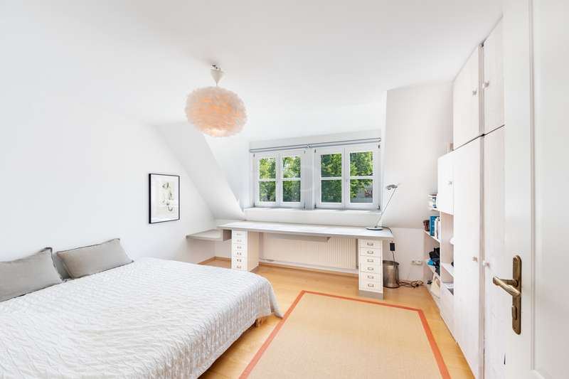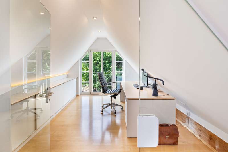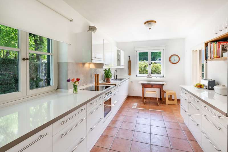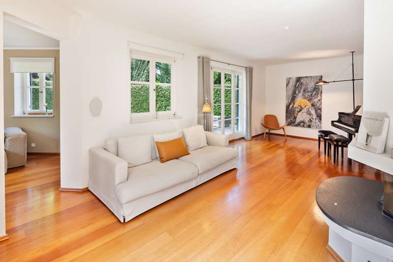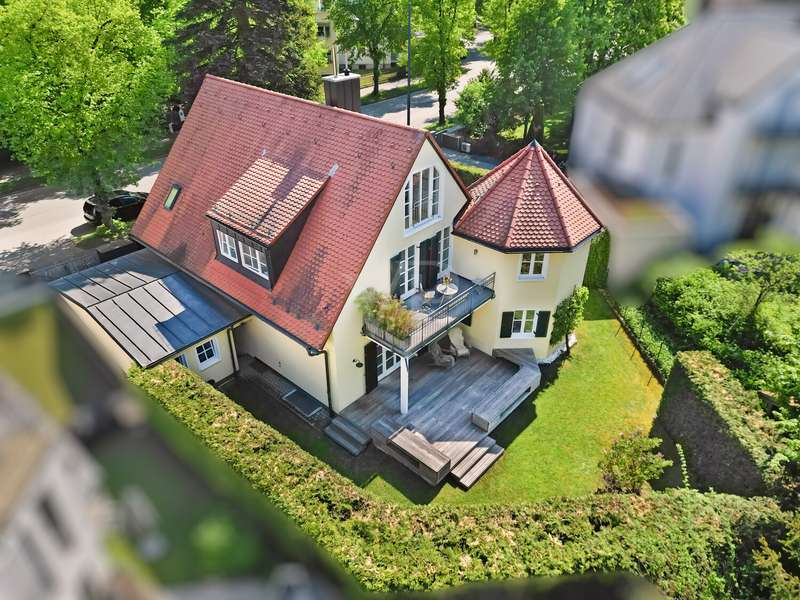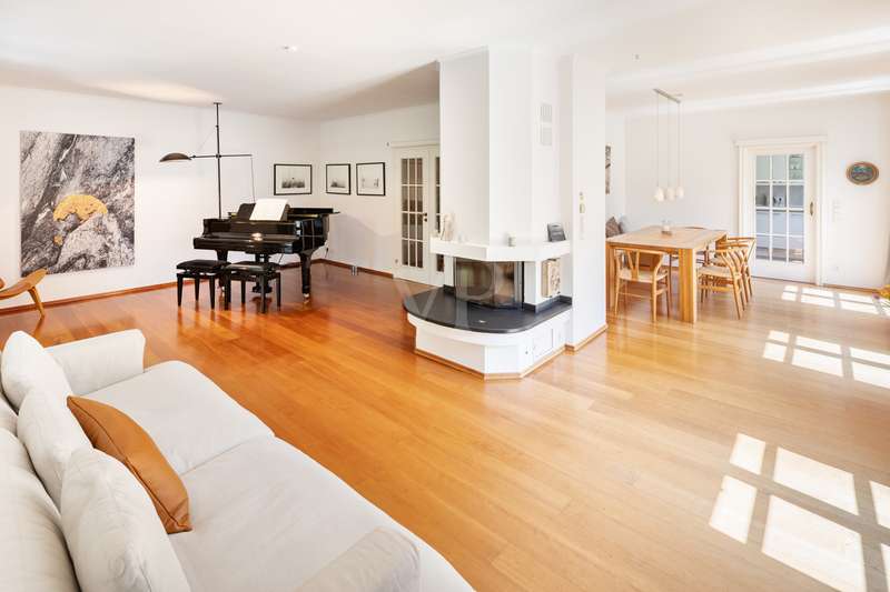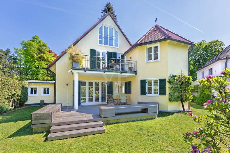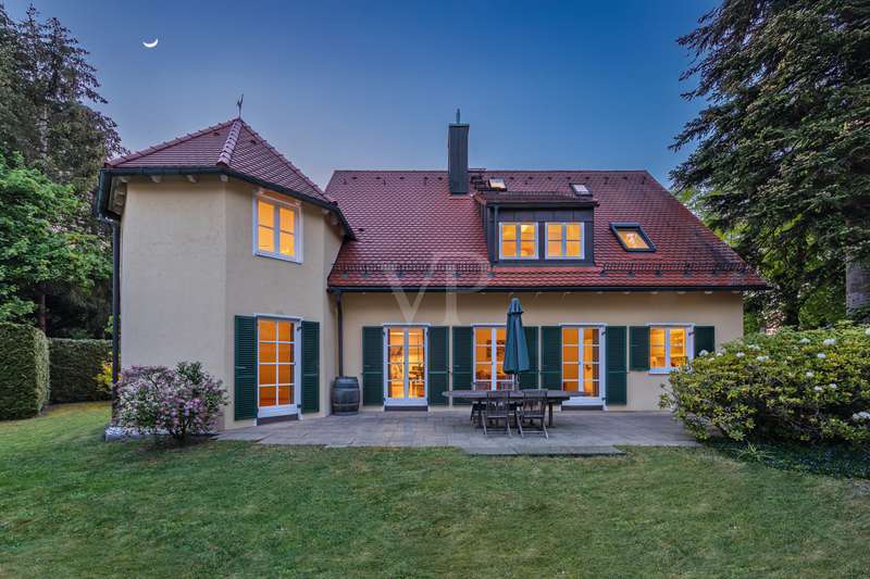 In the prestigious Villa Colony II, this charming property presents itself as a rare opportunity for families who demand space, style and quality of living. Originally built in 1957, the house with its historic flair was extensively renovated in 1997 and continuously modernized. On a generous living space of approx. 245 m² and a sunny plot of approx. 561 m², the house offers an ideal combination of classic living comfort and contemporary furnishings. Thanks to numerous windows, the entire house is flooded with light and conveys an open, inviting atmosphere. A particular architectural highlight is the striking tower on the building, which gives the house its unmistakable character. Two large terraces facing south-west and south-east as well as two balconies create attractive outdoor retreats and provide a view of the lovingly landscaped garden with garden shed. Inside, the house impresses with high-quality features such as fine cherry wood parquet flooring in all living areas, ceramic tiles in the kitchen and bathrooms and a stylish fitted kitchen that meets the highest standards both functionally and visually. The spacious living area is complemented by an elegant fireplace, which creates a cozy atmosphere on cooler days. A combination of underfloor heating and radiators ensures a pleasant indoor climate in the various areas of the house. A modern bathroom with a bathtub and a separate shower room provide comfort in everyday life. The converted top floor houses the popular open-plan lounge and the beautiful home office with south-west orientation and floor-to-ceiling windows. There is plenty of storage space in the basement of the house, which offers practical benefits for the residents. A hobby room or fitness room also allows for a variety of uses and rounds off the offer perfectly. This spacious property combines stylish living with historic charm - a rarity in this prestigious and family-friendly residential area. Immediate occupancy is possible.