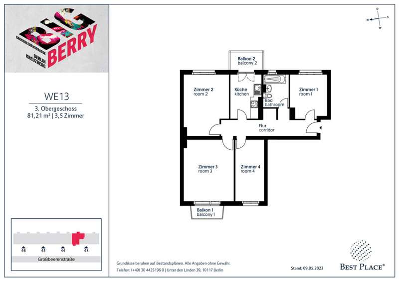 Your investment in the centre of trendy Kreuzberg: with this efficiently designed 3.5-room flat, you are investing in a place where young people, professionals and families want to live. The flat with approx. 81 sqm is located on the 3rd floor of the six-storey residential building. It has two beautiful balconies, one facing the garden courtyard to the east and one on the opposite side facing Großbeerenstraße. The bathtub in the bathroom provides a wellness feeling. Thanks to its practical layout and size, the flat is ideal for families, couples and singles. Our coveted Big Berry investment project offers investors solidly rented flats in one of Berlin's most sought-after neighbourhoods. The six-storey residential building with four storeys was built in the 1950s and a new top floor was added in 2023. It has 76 flats with one to four rooms and approx. 26 to 108 m². A lift was added as part of the loft extension, which also benefits the existing flats. Big Berry also includes an idyllic garden courtyard and 17 car parking spaces.