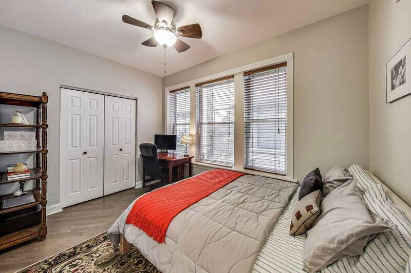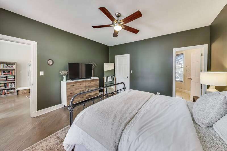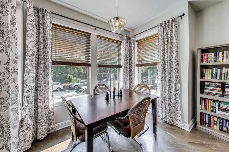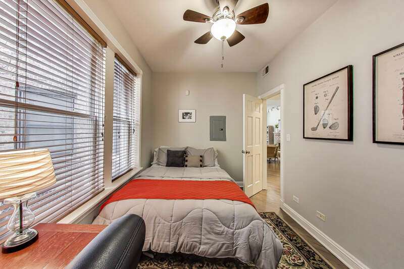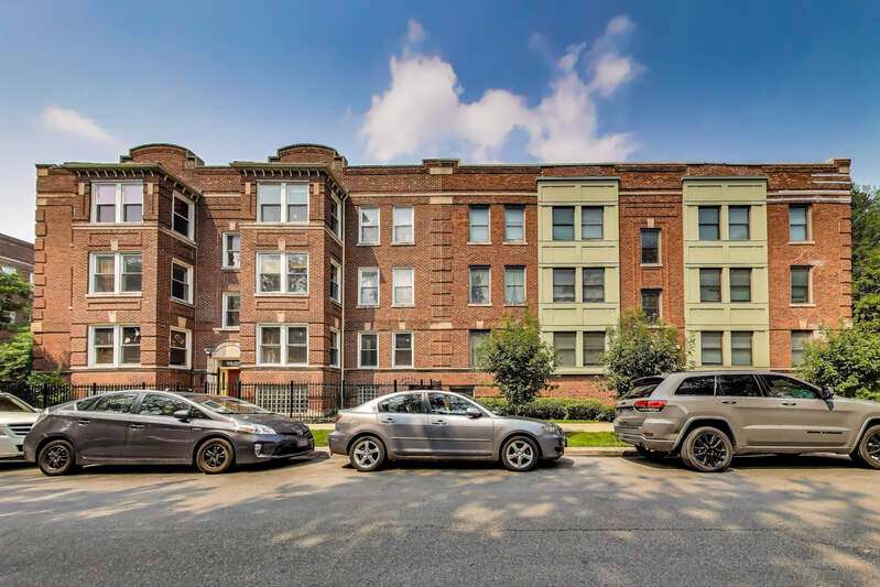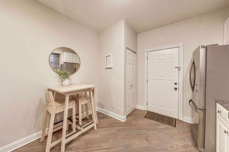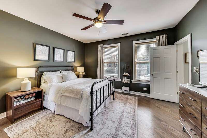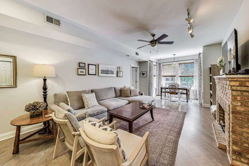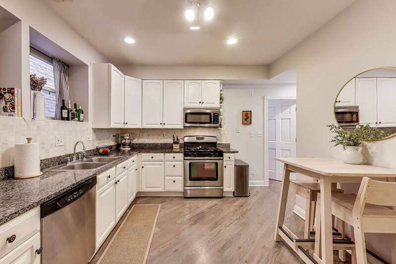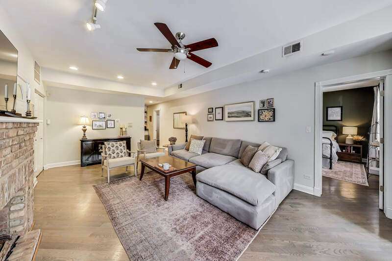 Light & bright high first floor condo in PRIME Logan Square location! Beautifully upgraded. Hardwood floors throughout. Large living room and dedicated dining space. Brick fireplace. Eat-in kitchen with white cabinets, granite, backsplash, and SS appliances. Large primary suite w/attached bathroom & professionally organized walk-in closet. Spacious 2nd bedroom accommodates a bed and office space. Massive storage unit in the basement below the unit has untapped potential. Perfect location- tree lined street- two blocks to the Blue line and minutes to the square, shopping and restaurants.
