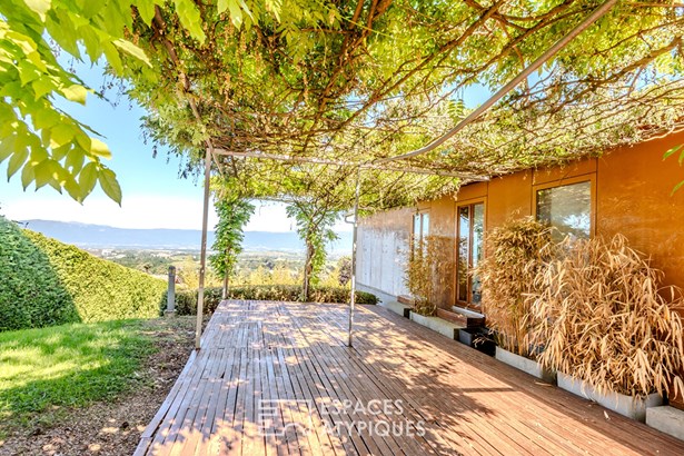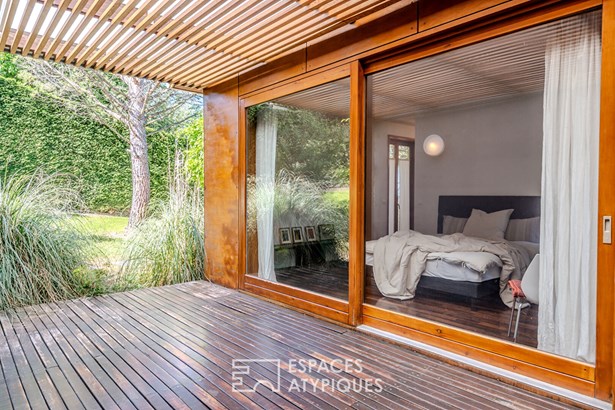 The discovery of this property begins with a discreet, almost confidential access revealing only a modern and refined carport backed by a workshop that integrates perfectly into the environment and allows a junction that elegantly conceals this superb house.