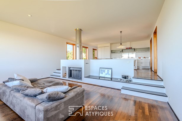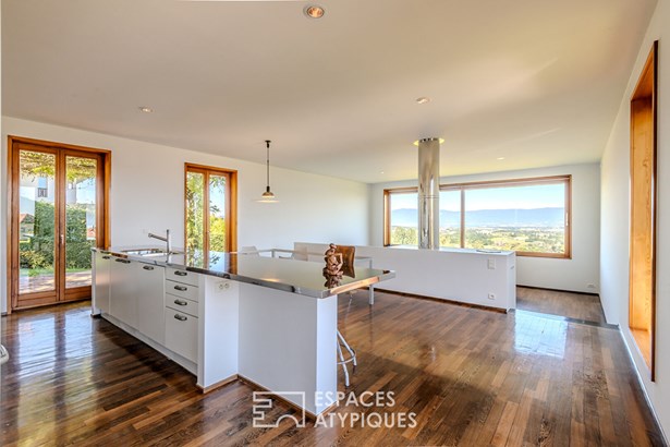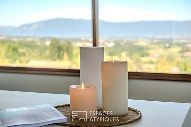 Inspired by the dominant position of the location, the architect who designed this unique living space imagined a habitat open to the exceptional panorama that surrounds it. The breathtaking view of the Genevois gives the sensation of being suspended with only the visual limits, the Jura massif, Lake Geneva and the unmissable Geneva water jet.