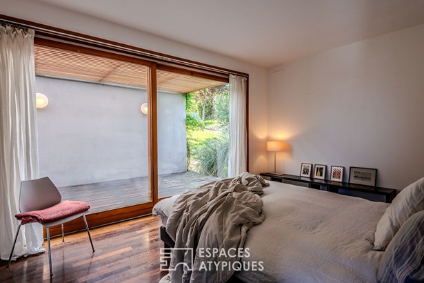 This level also offers a beautiful master suite with private bathroom intimately connected to the patio structured with openwork for a perfect balance between cozy interior and enveloping nature.