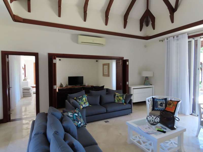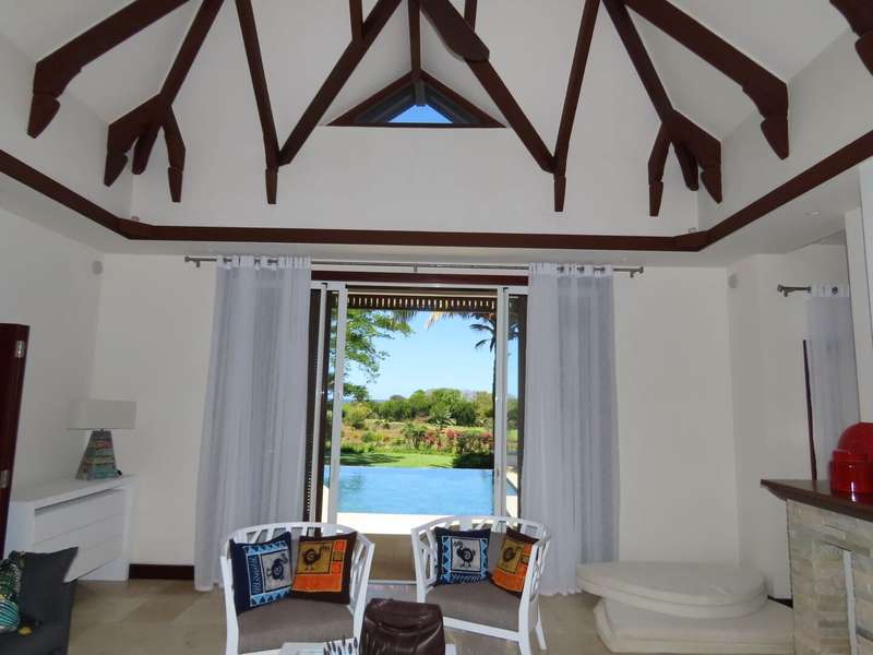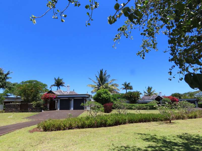 Outside, this single storey family home rises above the private 18 holes golf course, part of the Villas Valriche IRS Golf and Lifestyle Estate. It bears open views across a mature tropical garden of 660 m2, plus open land, then the golf course and finally distant sea views. With no close neighbours, this extremely private dwelling of 250 m2 is well-spaced from other villas. It also features a double car garage, plus a golf cart port, The U shape of this house surrounds a 40m2 rim flow concrete swimming pool with slate tile finish and two external showers, completed by a fully built gazebo kiosk, covered terraces, pool deck, bar and solid state barbecue for a total covered area of some 415 m2 and enclosed of 685 m2. Inside, a large gourmet kitchen, fully equipped with island, scullery, laundry room, direct outside and garage accesses, opens onto the 20 m2 dining room. It links to a 35 m2 living area and 25 m2 TV lounge. Both these spaces are separated by plantation shutters. Once opened to create a larger indoor entertainment space, it can also incorporate the bedrooms lobby of 13 m2, featuring a large dome light. The TV lounge has a separate covered terrace and leads to a secluded back garden which also opens up to one bedroom. High ceilings with timber frame and open fire chimney give character to the living room which is under pitched roof. All 4 bedrooms benefit from their private bathrooms. One provides a tub useful for youngsters. The master bedroom adds an en-suite separate dressing. The entrance hall caters for a guest toilet and a separate washbasin.