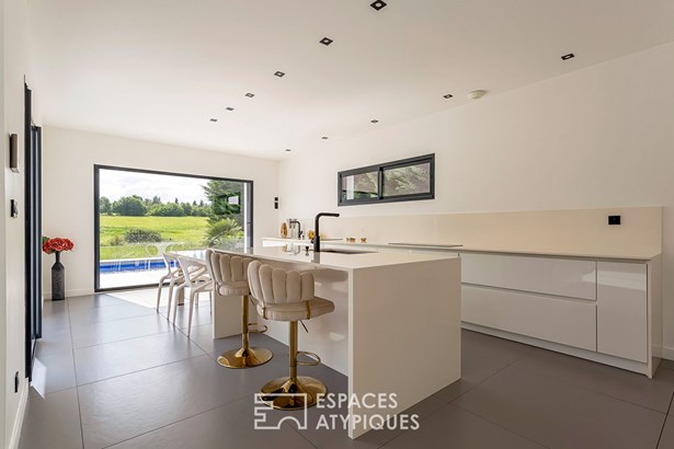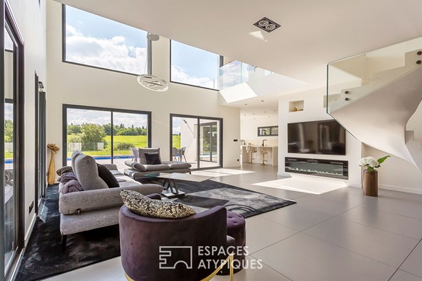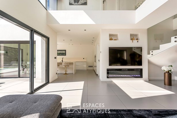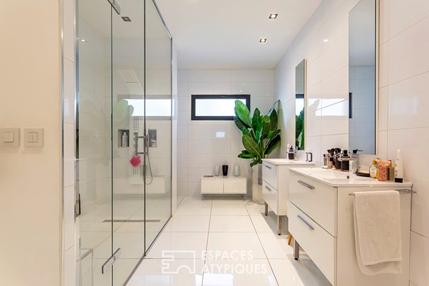 The whole communicates with a large terrace and an elegant swimming pool, perfectly integrated into the garden without any vis-a-vis. The sleeping area accommodates a Master Suite on one level of 37sqm, with private bathroom and access to the outside.