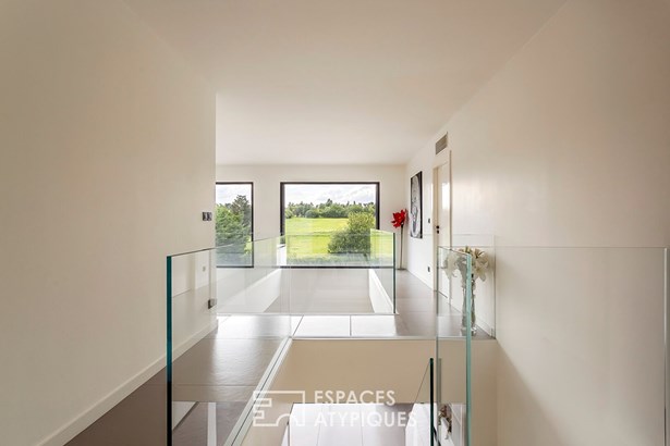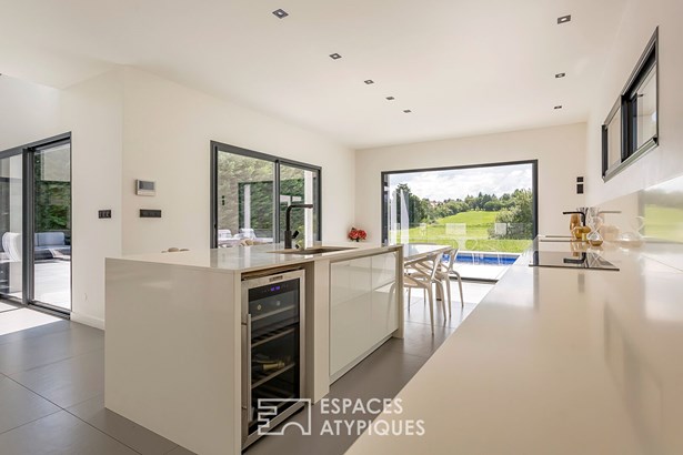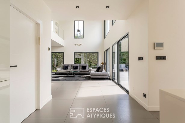 From the entrance, the generosity of the spaces impresses: a vast reception area of 80sqm, is organized around a living room, a dining area and a semi-open and equipped kitchen, all bathed in light thanks to multiple bay windows allowing to admire the view of a rare natural space.