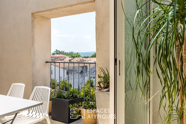 The vast living room with fireplace, extended by an elegant dining room and a terrace offering panoramic views over the rooftops of the town and the Ardeche mountains, promises unforgettable moments of living.