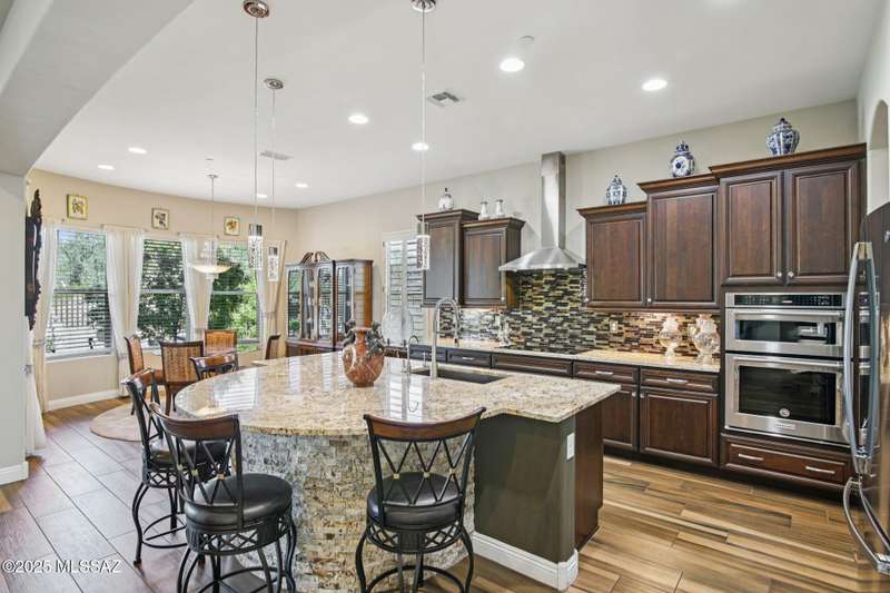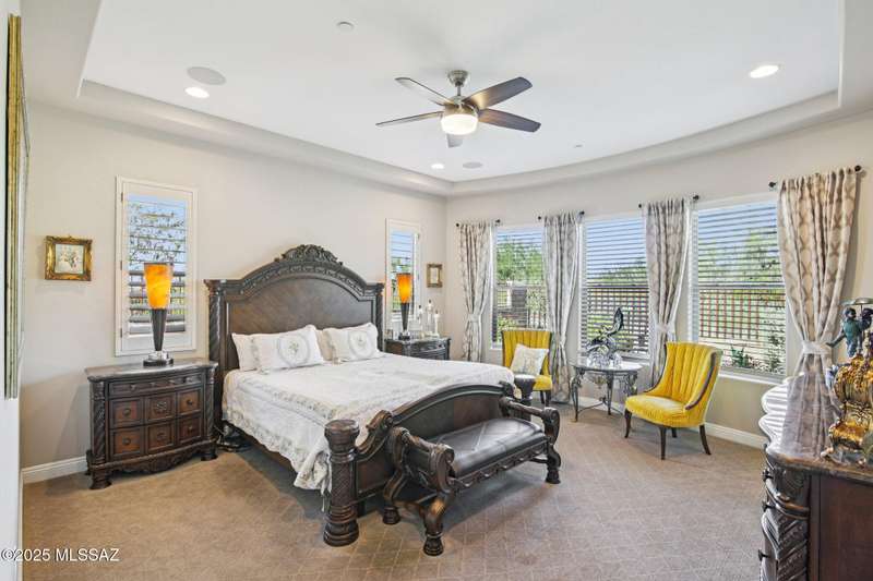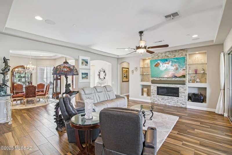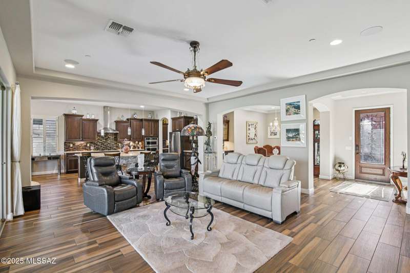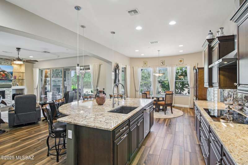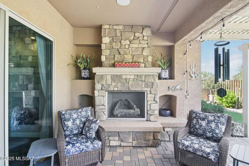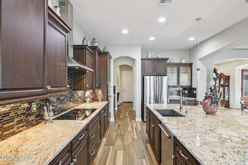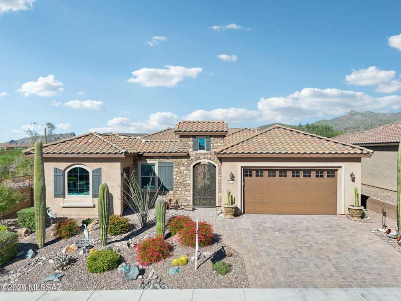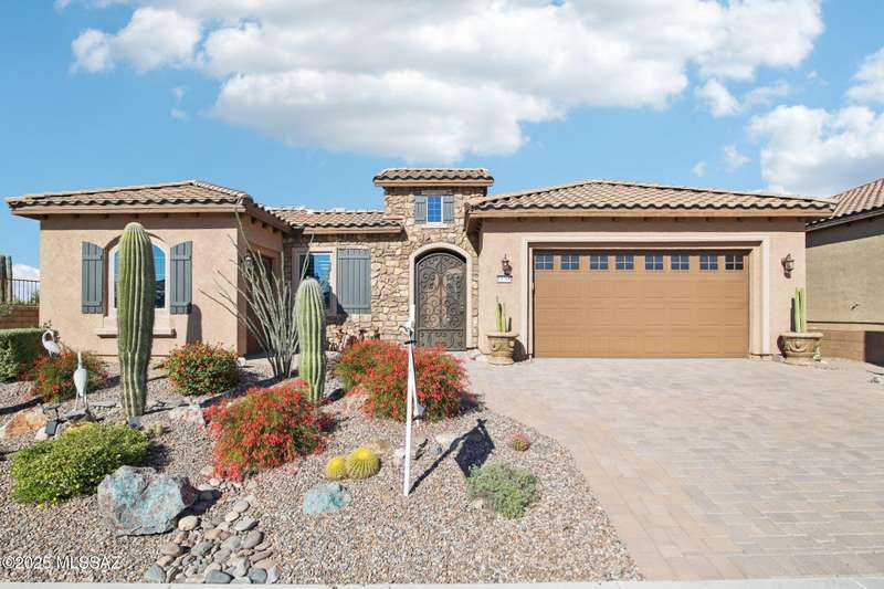 Don't miss this stunning home in Del Webb at Dove Mountain. Gorgeous Journey model features open floorplan with upgrades galore situated on a private corner lot on one of the best streets in the community. A wrought iron door leads to a private courtyard with fountain. Custom entry door with wood/glass welcomes you into an elegant foyer with views straight to the backyard and open space beyond. Large great room features stacked stone fireplace, built in's with glass display shelves and large center slider. Chef's kitchen boasts dark wood cabinetry, Viking induction cooktop, stainless steel appliances, custom glass backsplash, granite countertops, stacked stone on spacious center island with sit up bar plus a butler's pantry. Formal dining room is perfect for entertaining guests with