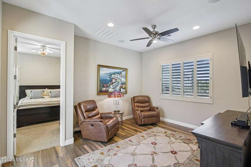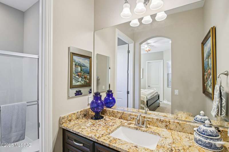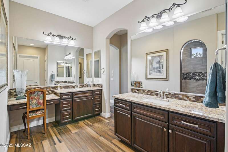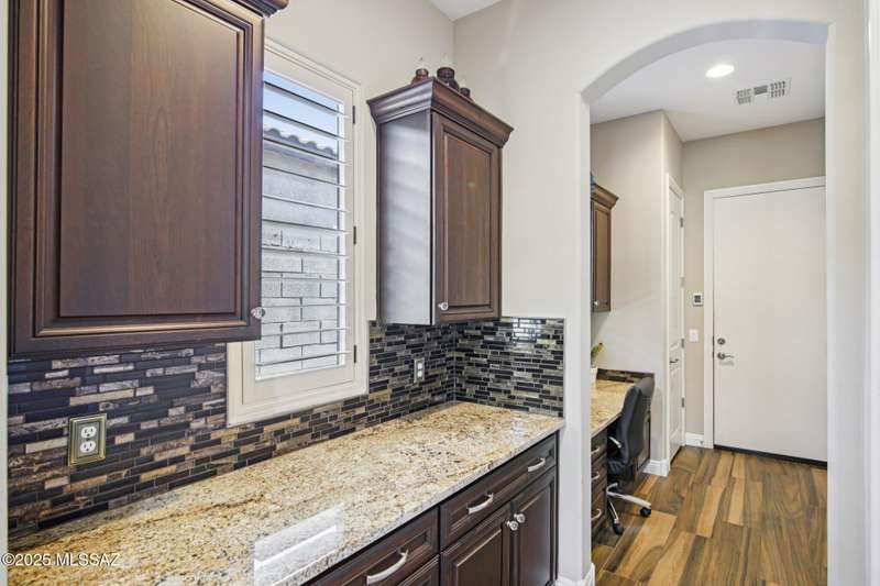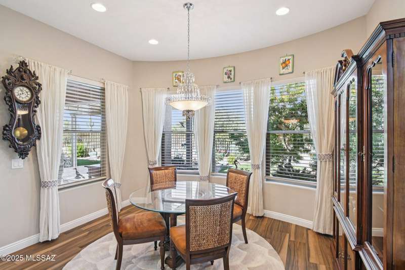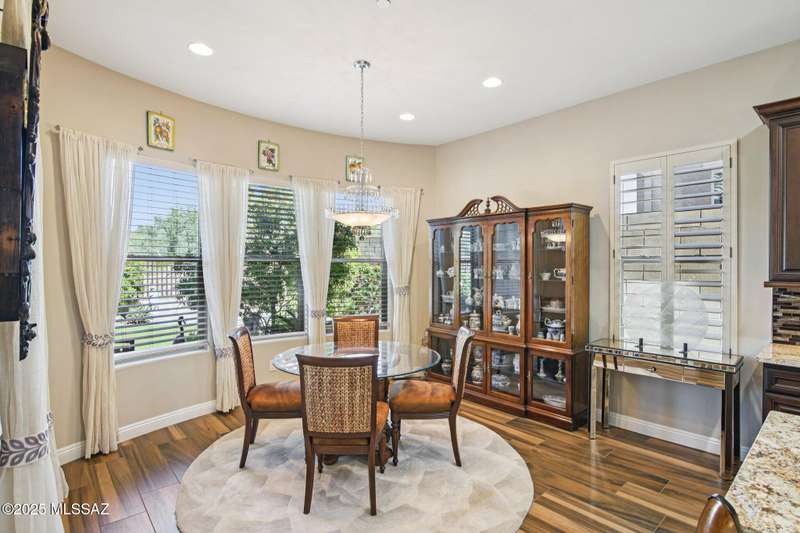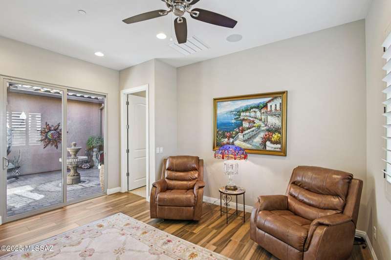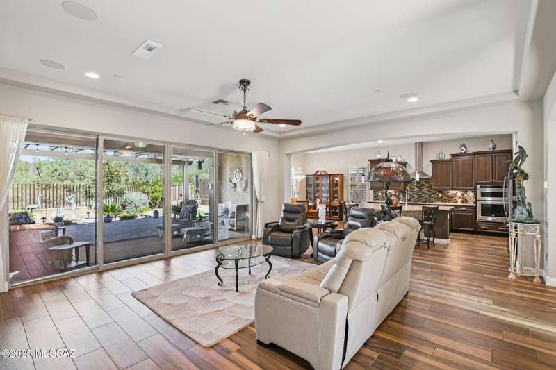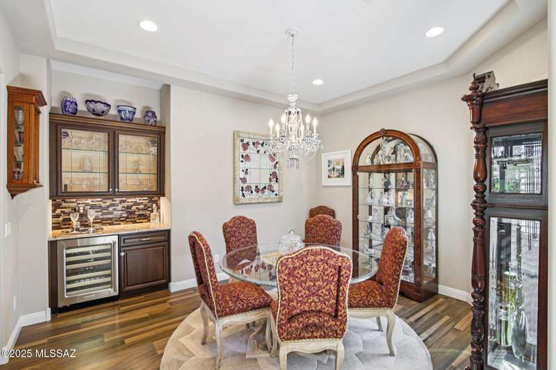 Don't miss this stunning home in Del Webb at Dove Mountain. Gorgeous Journey model features open floorplan with upgrades galore situated on a private corner lot on one of the best streets in the community. A wrought iron door leads to a private courtyard with fountain. Custom entry door with wood/glass welcomes you into an elegant foyer with views straight to the backyard and open space beyond. Large great room features stacked stone fireplace, built in's with glass display shelves and large center slider. Chef's kitchen boasts dark wood cabinetry, Viking induction cooktop, stainless steel appliances, custom glass backsplash, granite countertops, stacked stone on spacious center island with sit up bar plus a butler's pantry. Formal dining room is perfect for entertaining guests with
