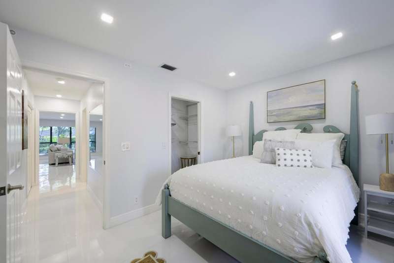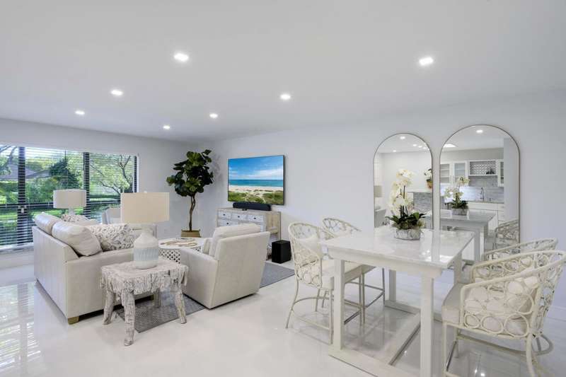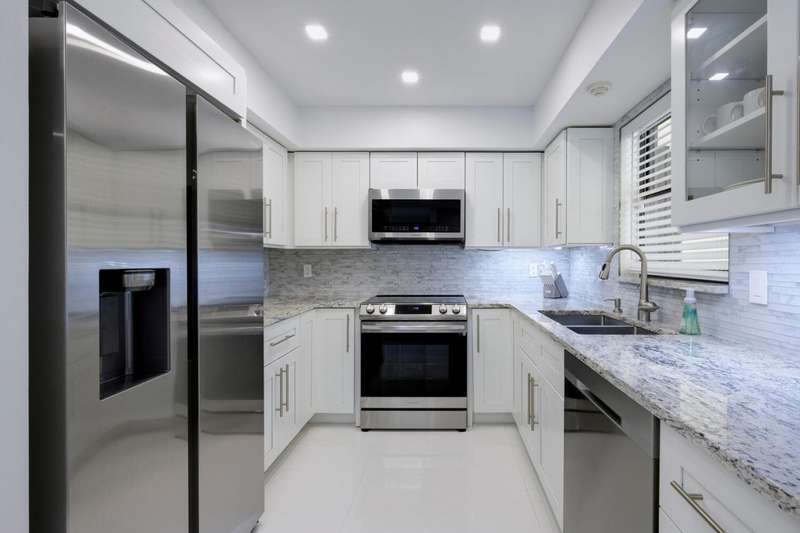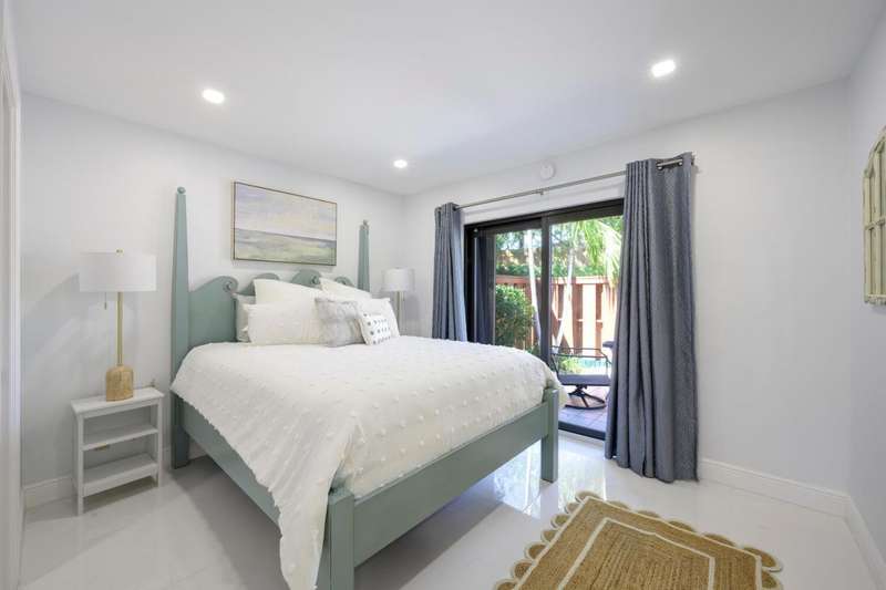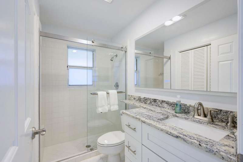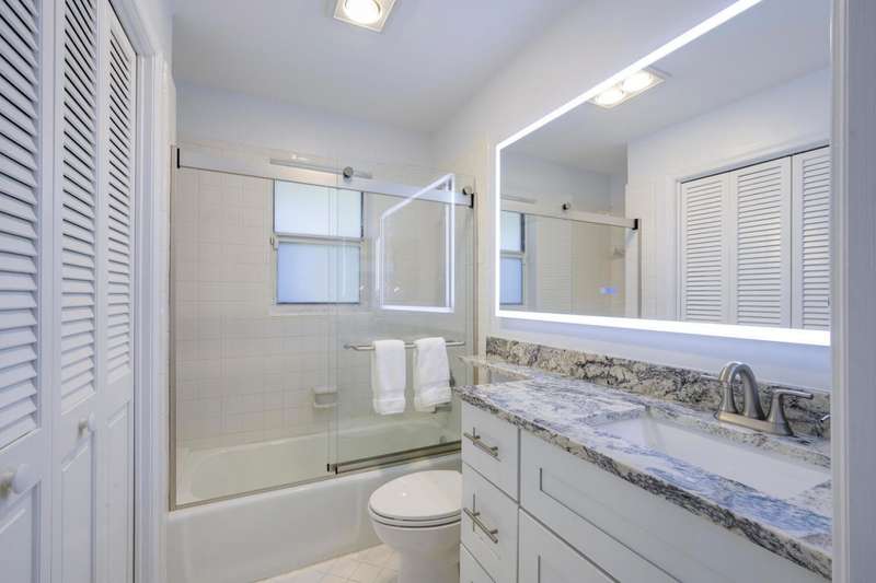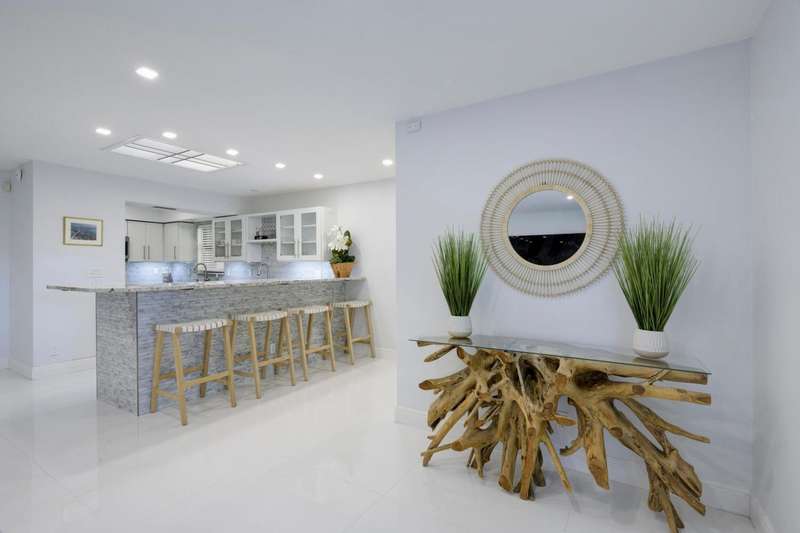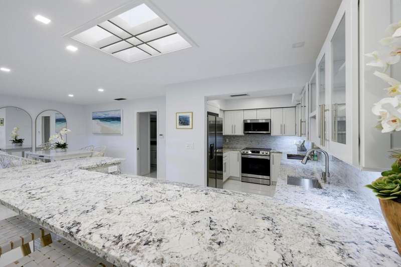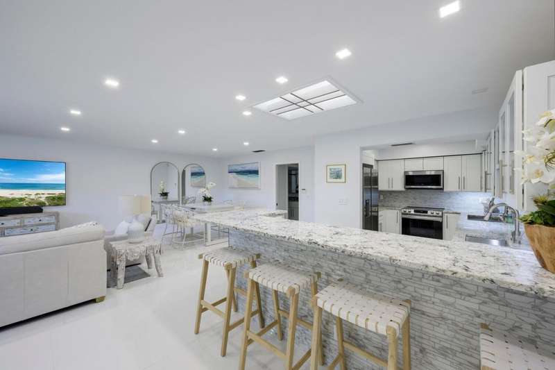 This beautiful home boasts two bedrooms and two baths, with the added luxury of an 80-foot dock available E-3. Step inside to discover a fully updated interior adorned with exquisite furnishings and ceramic tile floors throughout. The kitchen features white cabinetry, granite countertops with a full tile backsplash, and an oversized counter bar perfect for entertaining guests. The open floor plan is accentuated by a skylight, filling the space with natural light. Retreat to the master bedroom, which offers sliders to a private outdoor patio, a spacious walk-in closet, and a master bath featuring a vanity and tub/shower with a seamless glass door. Guests will feel right at home in the comfortable guest bedroom, complete with an en-suite bath and walk-in closet.