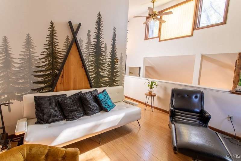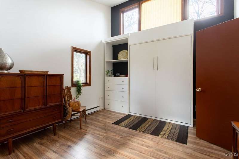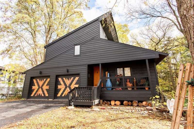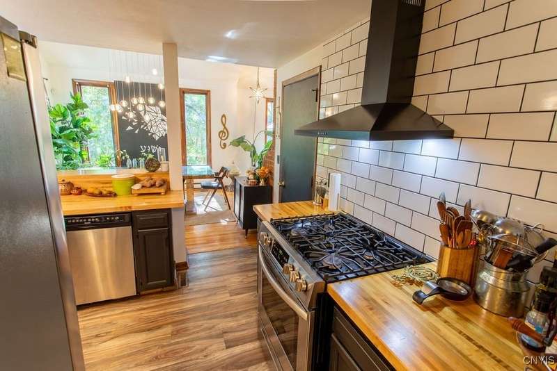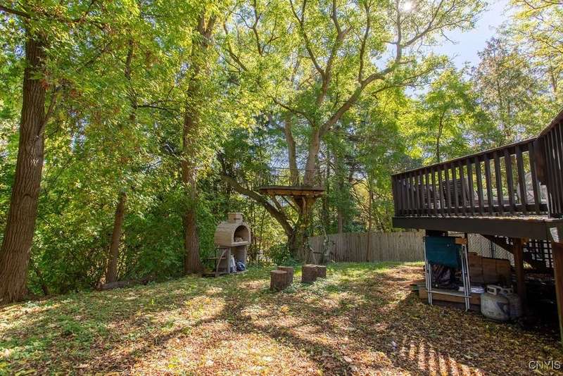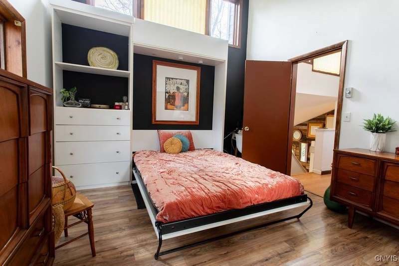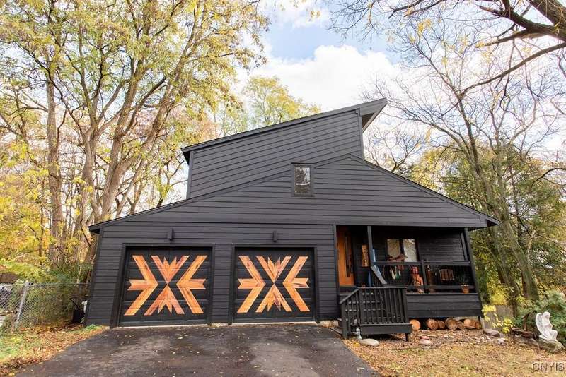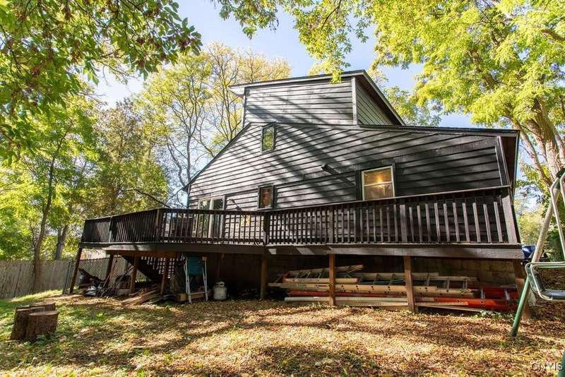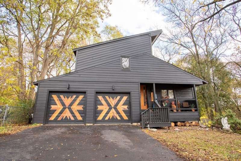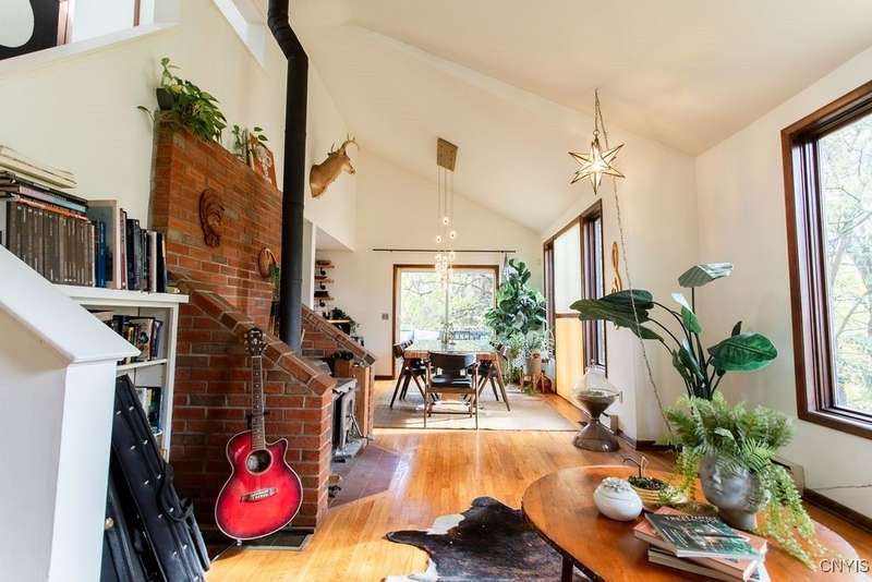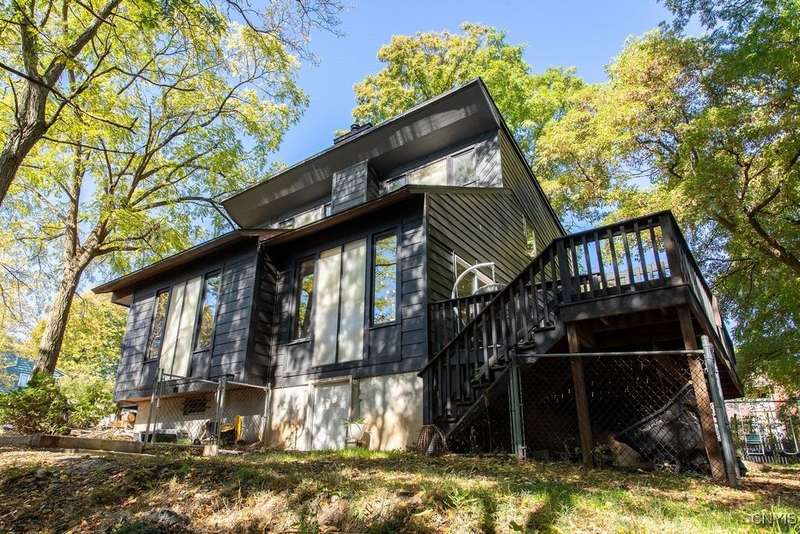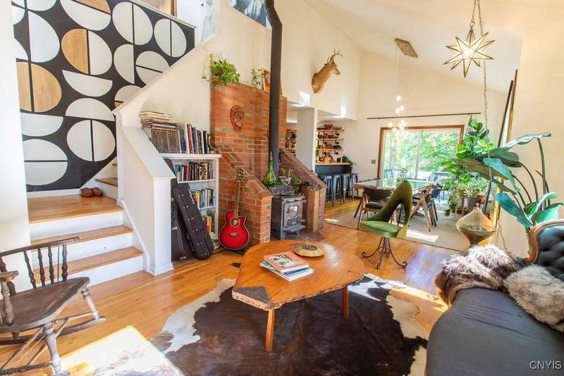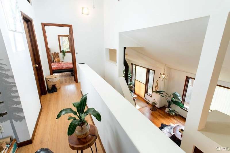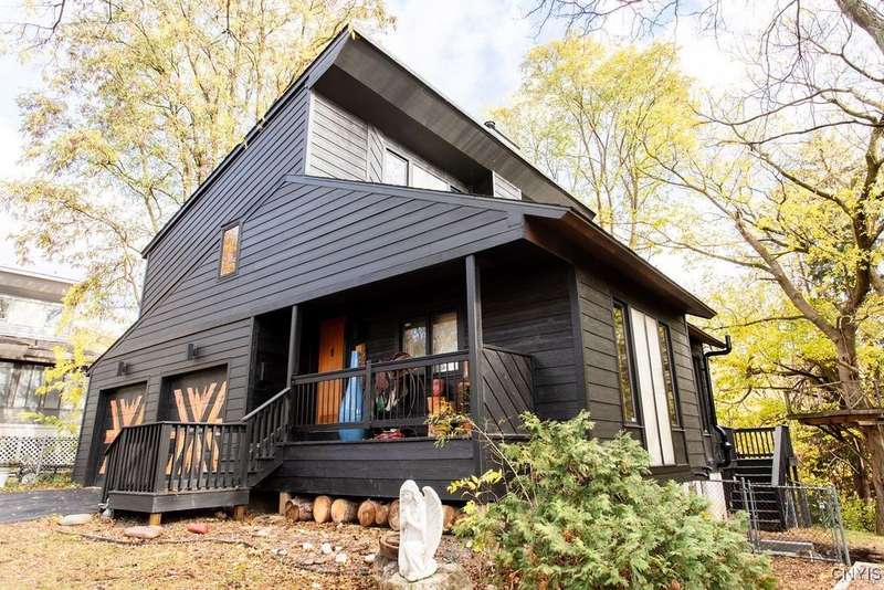 Welcome to this extraordinary, 1984 built Contemporary beauty nestled on a quiet, wooded lot at the end of a cul de sac, just minutes from downtown Syracuse. Prepare to be amazed from the moment you pull into the double-wide driveway and are met with custom painted garage doors, charming open front porch, and stunning composite siding recently installed and sure to last for many years to come! Upon entering the home you are greeted with vaulted ceilings and an abundance of natural light pouring in from the numerous windows and skylights. Immense love has been poured into every detail of this one-of-a-kind home, including the custom wood accent wall in the living room, gorgeously renovated kitchen with butcher block countertops, custom tile work, range hood, and even a built in vintage coffee grinder! This house exudes character at every turn, whether it be the hand painted accents in the loft and front entryway, the hidden Murphy bed in the upstairs primary bedroom, the modern elegance of the newly renovated upstairs bathroom, or the hand built treehouse in the backyard. Curl up in the living room with the charming wood burning stove in winter, or bask out on the expansive back deck and entertain guests overlooking your private wooded backyard in summer. Additional finished space in the basement could be used as an extra bedroom or family room, with secondary walkout egress already in place. Also featured is One Design's Waterwall system of solar-heated radiators built into several walls and windows throughout the home, and a sizable two-car attached garage boasts plenty of space for work projects or storage. Do not miss out on your chance to own this incredible home? book your showing today!
