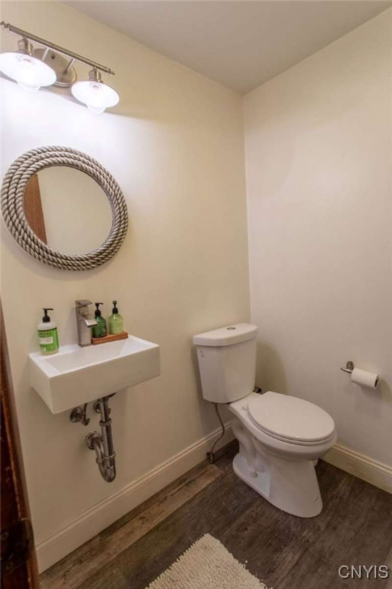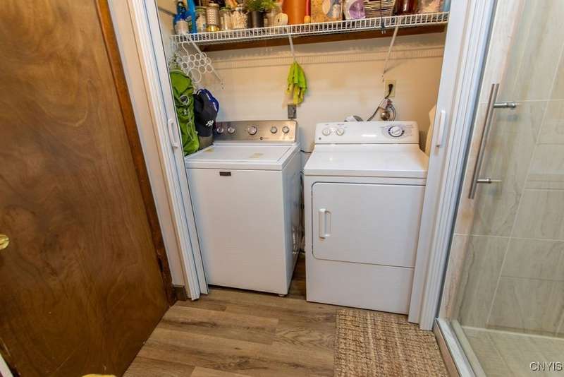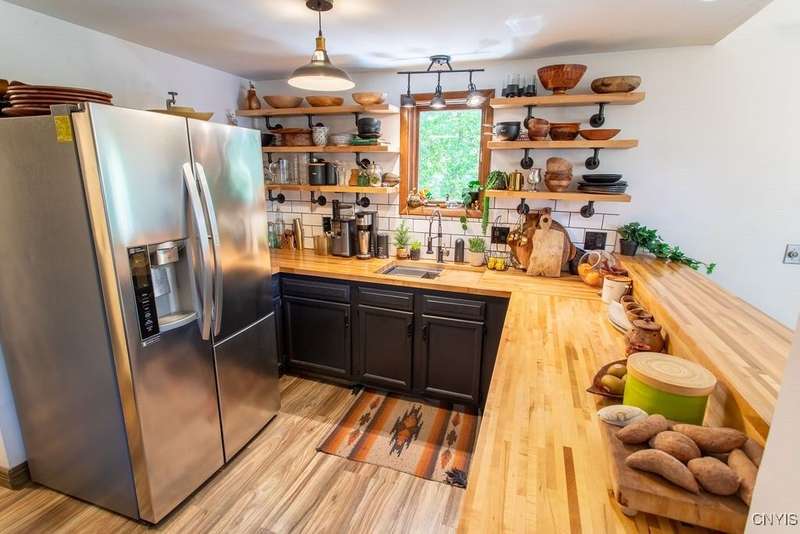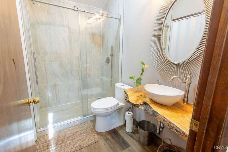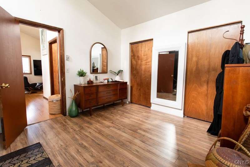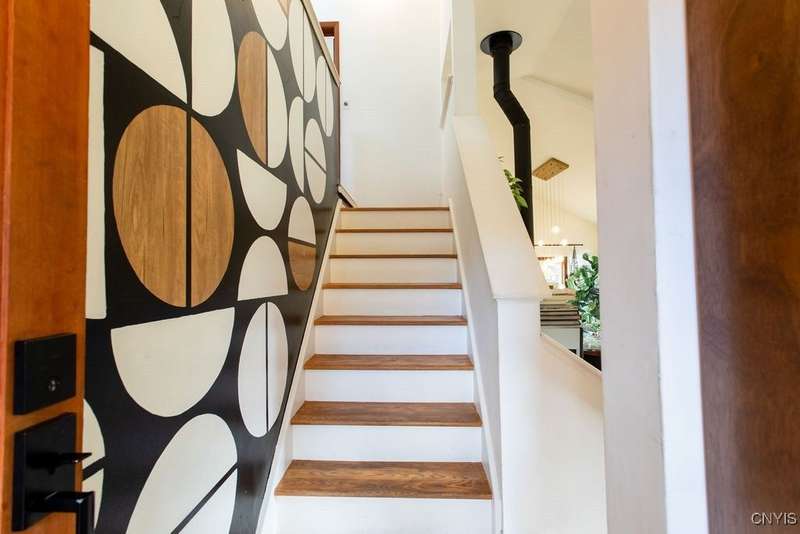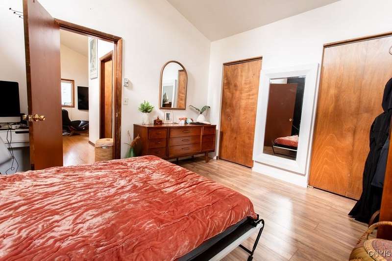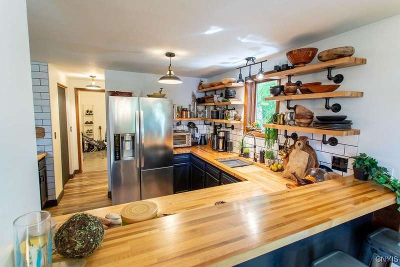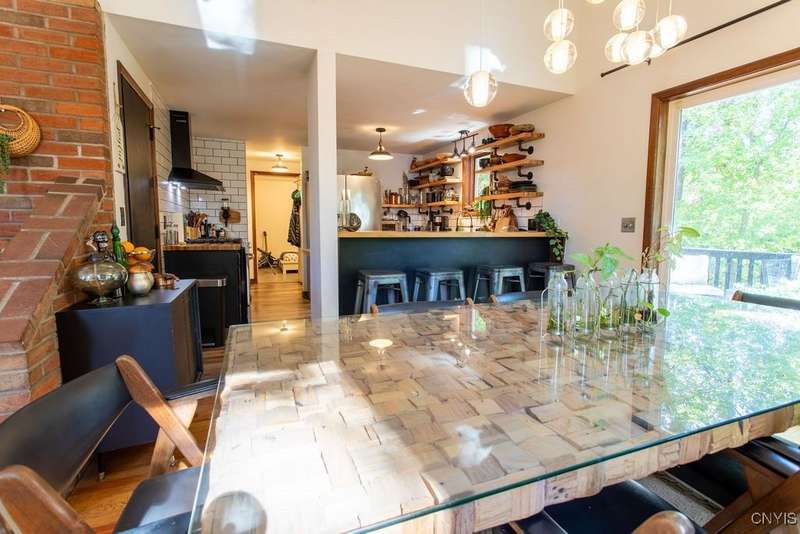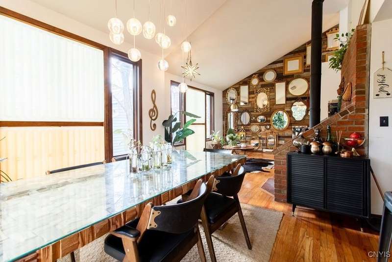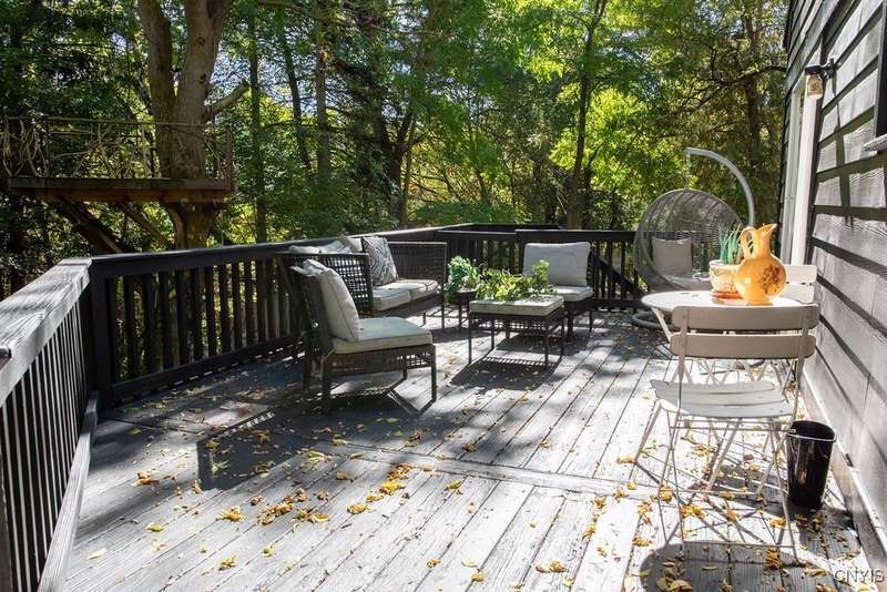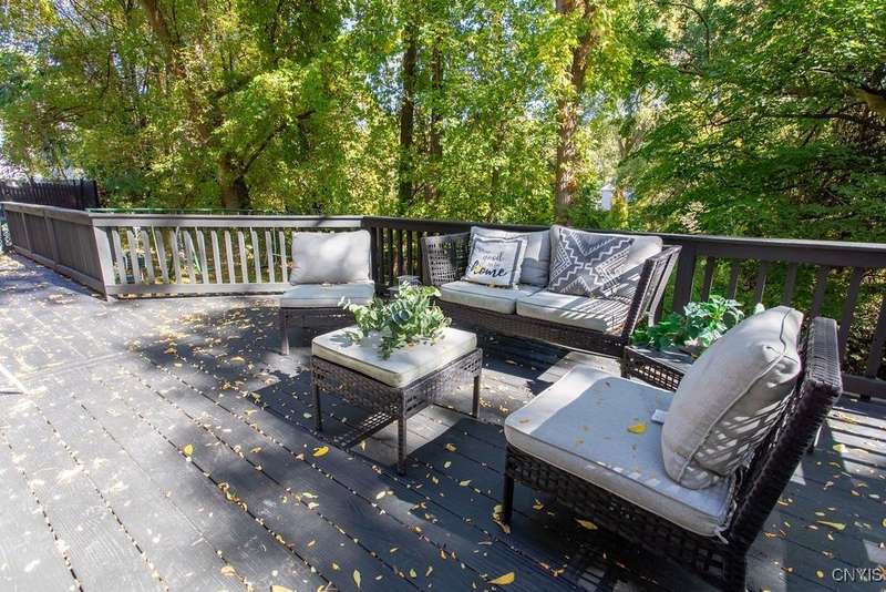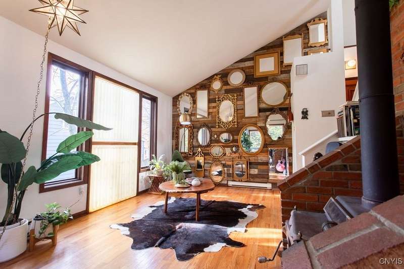 Welcome to this extraordinary, 1984 built Contemporary beauty nestled on a quiet, wooded lot at the end of a cul de sac, just minutes from downtown Syracuse. Prepare to be amazed from the moment you pull into the double-wide driveway and are met with custom painted garage doors, charming open front porch, and stunning composite siding recently installed and sure to last for many years to come! Upon entering the home you are greeted with vaulted ceilings and an abundance of natural light pouring in from the numerous windows and skylights. Immense love has been poured into every detail of this one-of-a-kind home, including the custom wood accent wall in the living room, gorgeously renovated kitchen with butcher block countertops, custom tile work, range hood, and even a built in vintage coffee grinder! This house exudes character at every turn, whether it be the hand painted accents in the loft and front entryway, the hidden Murphy bed in the upstairs primary bedroom, the modern elegance of the newly renovated upstairs bathroom, or the hand built treehouse in the backyard. Curl up in the living room with the charming wood burning stove in winter, or bask out on the expansive back deck and entertain guests overlooking your private wooded backyard in summer. Additional finished space in the basement could be used as an extra bedroom or family room, with secondary walkout egress already in place. Also featured is One Design's Waterwall system of solar-heated radiators built into several walls and windows throughout the home, and a sizable two-car attached garage boasts plenty of space for work projects or storage. Do not miss out on your chance to own this incredible home? book your showing today!