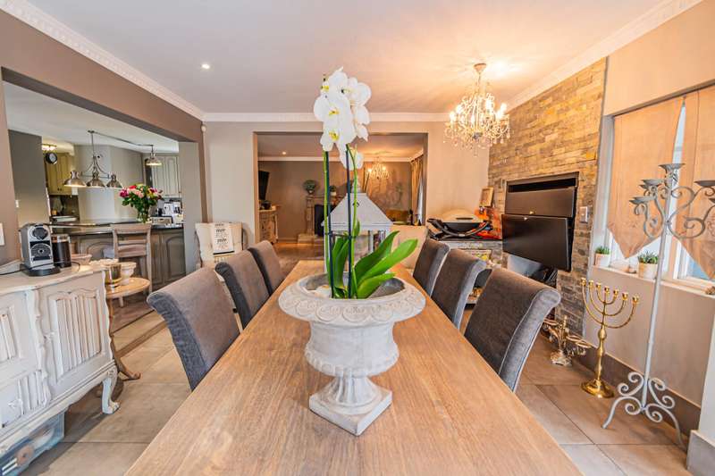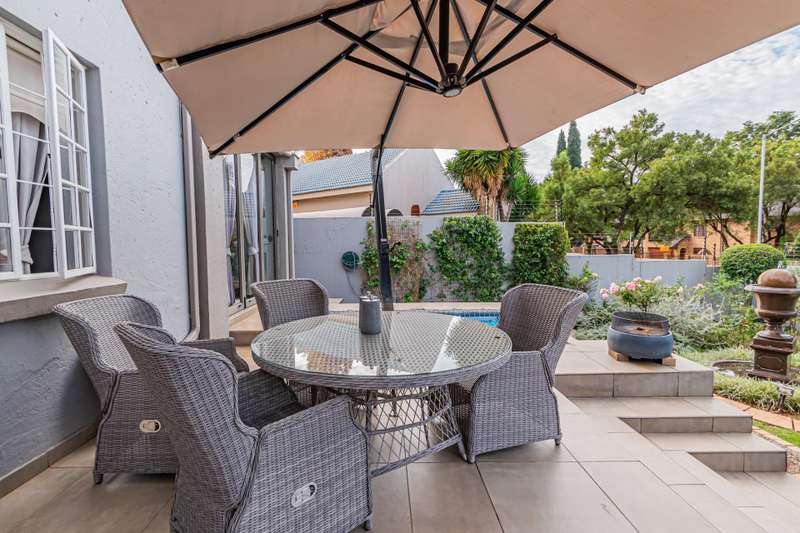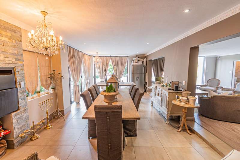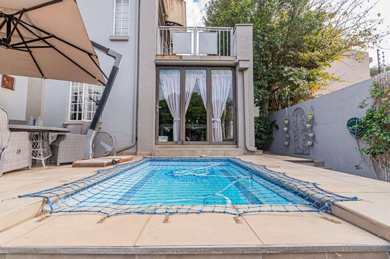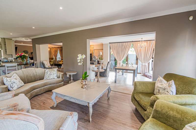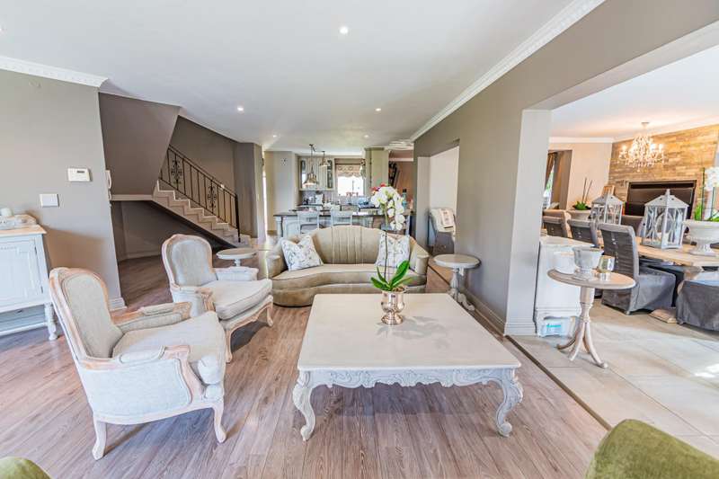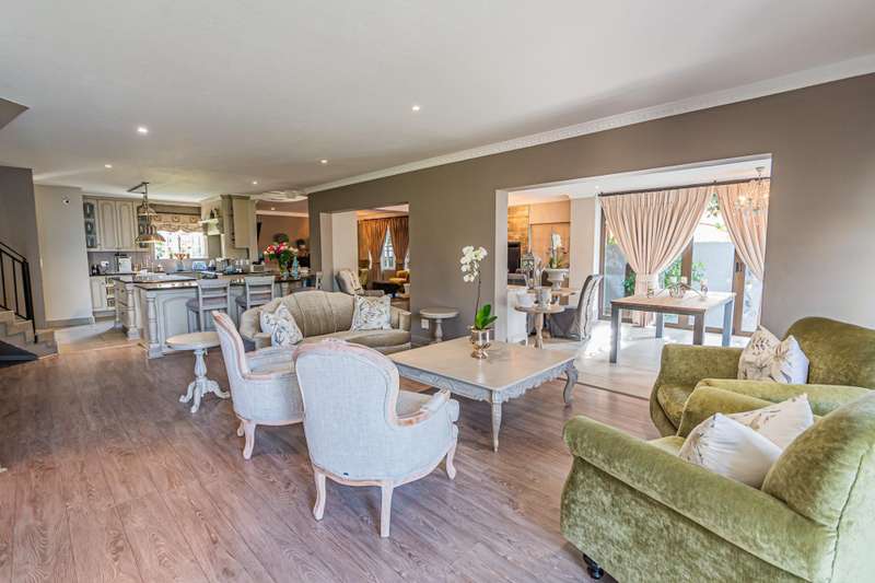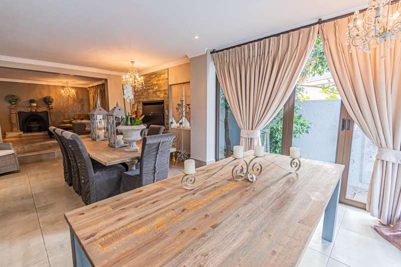 This sumptuous and elegant French Proven?ºal inspired home offers the discerning owner a luxurious and comfortable lifestyle. Attention to detail in the quality finishes is evident in every room. The impressive entrance hall leads to a beautiful entertainment room with built-in braai and glass stacking doors leading out to the pool. The formal double volume lounge with fireplace is perfect for gracious entertaining and flows effortlessly into the entertainment room. A third reception room/TV lounge also with fireplace and guest toilet adds to the versality of this home. The stunningly appointed chef?ÇÖs solid wood and granite kitchen features a breakfast table, gas stove and ample cupboard space and separate scullery and laundry. The upper level features 3 bedrooms (main en-suite) and 2 gorgeous bathrooms. All of the bedrooms lead out to a private balcony overlooking the manicured garden and sparkling pool. The master suite has a cosy reading corner with fireplace and an airy bathroom. A 4th bedroom/study with built-in cupboards complete this section of the house. Accommodation is further complemented by a private guest cottage (5th bedroom) with a gorgeous lounge area, spacious en-suite bedroom and kitchenette. The cottage has it's own separate entrance. Enjoy beautiful summer evenings entertaining in the dining/entertainment room with a built-in braai that leads out to the patio. Additional features include: 2 automated garages Double undercover parking bay and extra visitors parking outside. Double staff accommodation with bathroom and small kitchen. Irrigation throughout the garden. Water cooling system through the entire house. Alarm system with 11 cameras and outside beams. Inverter with solar panels. 4 Back-up water tanks. Close to top schools, trendy restaurants, shopping malls and with easy access to highways, it's a home that caters for the whole family.