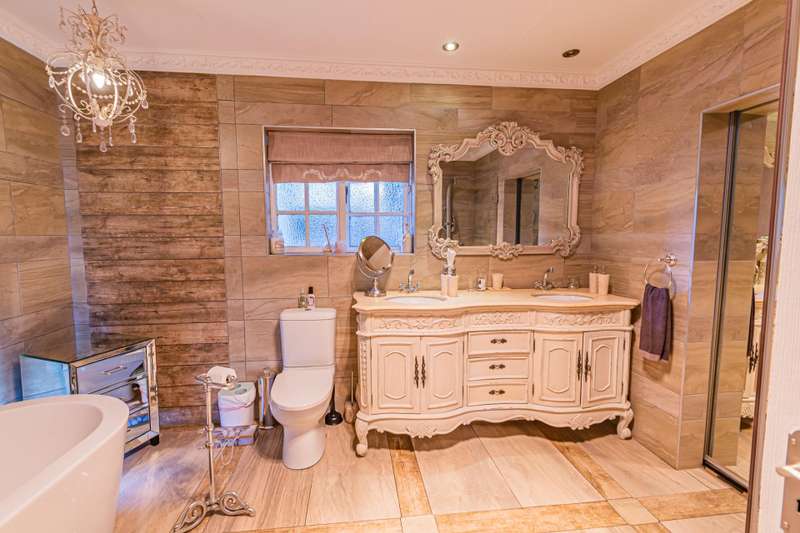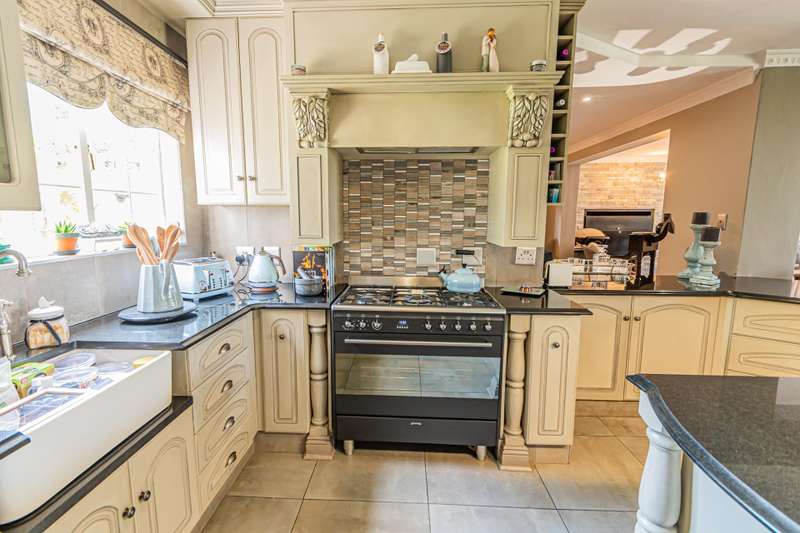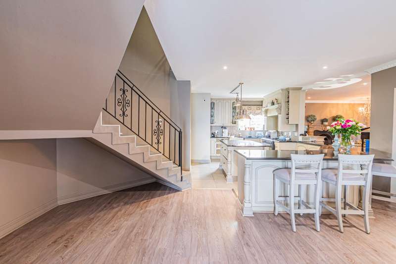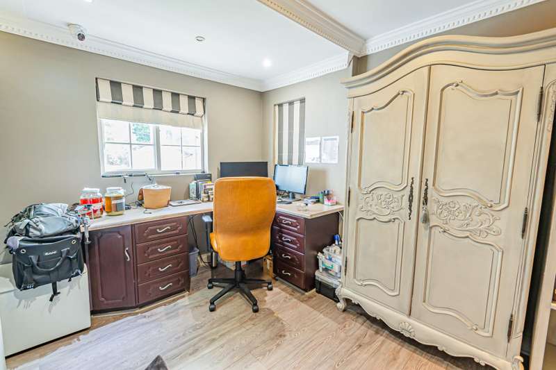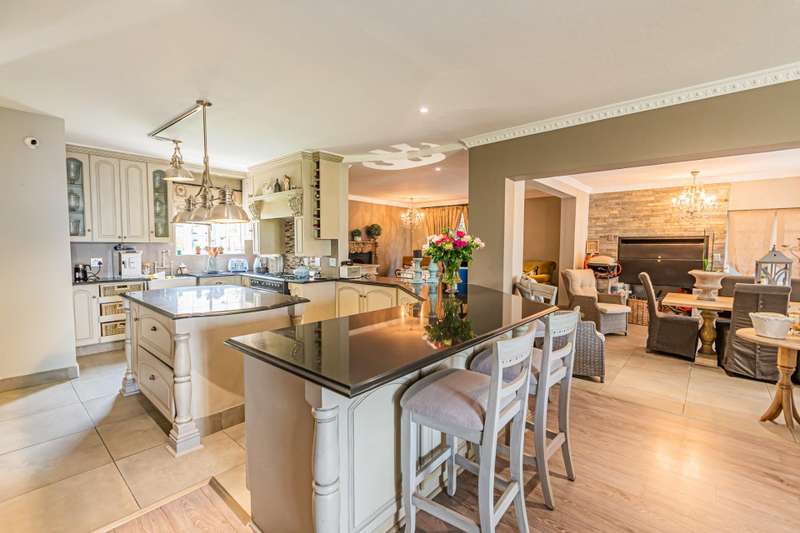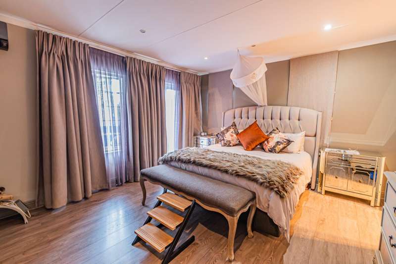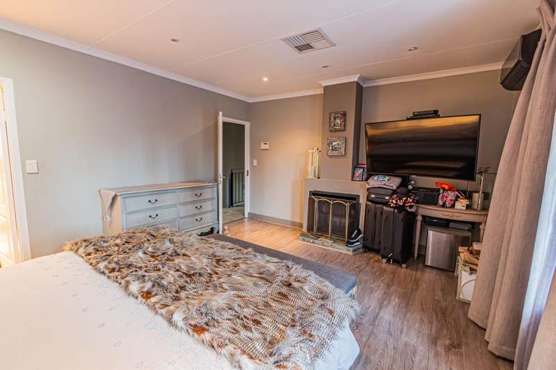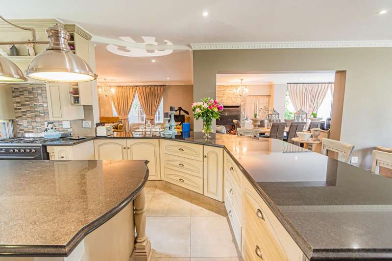 This sumptuous and elegant French Proven?ºal inspired home offers the discerning owner a luxurious and comfortable lifestyle. Attention to detail in the quality finishes is evident in every room. The impressive entrance hall leads to a beautiful entertainment room with built-in braai and glass stacking doors leading out to the pool. The formal double volume lounge with fireplace is perfect for gracious entertaining and flows effortlessly into the entertainment room. A third reception room/TV lounge also with fireplace and guest toilet adds to the versality of this home. The stunningly appointed chef?ÇÖs solid wood and granite kitchen features a breakfast table, gas stove and ample cupboard space and separate scullery and laundry. The upper level features 3 bedrooms (main en-suite) and 2 gorgeous bathrooms. All of the bedrooms lead out to a private balcony overlooking the manicured garden and sparkling pool. The master suite has a cosy reading corner with fireplace and an airy bathroom. A 4th bedroom/study with built-in cupboards complete this section of the house. Accommodation is further complemented by a private guest cottage (5th bedroom) with a gorgeous lounge area, spacious en-suite bedroom and kitchenette. The cottage has it's own separate entrance. Enjoy beautiful summer evenings entertaining in the dining/entertainment room with a built-in braai that leads out to the patio. Additional features include: 2 automated garages Double undercover parking bay and extra visitors parking outside. Double staff accommodation with bathroom and small kitchen. Irrigation throughout the garden. Water cooling system through the entire house. Alarm system with 11 cameras and outside beams. Inverter with solar panels. 4 Back-up water tanks. Close to top schools, trendy restaurants, shopping malls and with easy access to highways, it's a home that caters for the whole family.