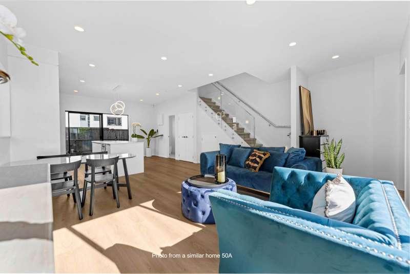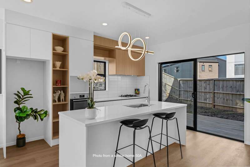 Set in a peaceful, fast-growing neighbourhood, this brand-new home combines charm, style, and everyday practicality—perfect for young families, couples, or anyone wanting an easy-care lifestyle. A line of colourful camellias welcomes you at the front, leading to a fully fenced, beautifully paved section. Inside, enjoy open-plan living with a crisp white kitchen, gas cooking, breakfast bar, and seamless flow to sunny front and back decks—great for entertaining or relaxing. Upstairs offers 3 generous bedrooms and 2 modern bathrooms, including a light-filled master with a large en-suite and full wall shower. The main bathroom is tiled to the ceiling and fitted with smart storage, LED mirror, and quality finishes. There’s also a guest toilet downstairs, a separate laundry, and a Rinnai Infinity hot water system for constant comfort. Built with durable, low-maintenance materials, this is a true lock-up-and-leave home—ideal for busy lifestyles. Close to the motorway, train station, Massey Park Pool, and Bruce Pulman Park, you're perfectly positioned for both convenience and community living. Let the camellias lead you to your sweet new home!
