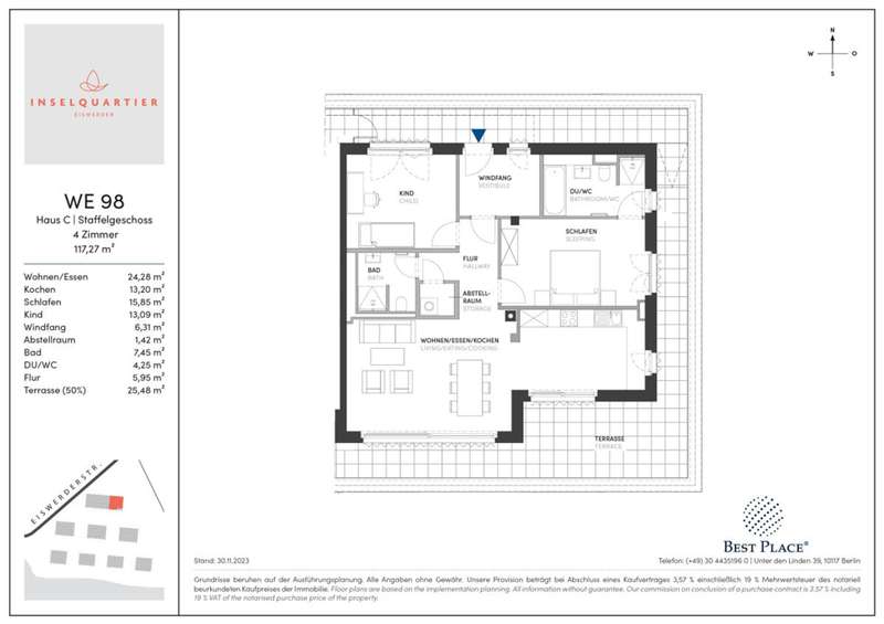 Penthouse living on a new level: move into your TOP-equipped new-build penthouse in the Inselquartier Eiswerder soon. This light-flooded penthouse apartment impresses with its exquisite furnishings and timeless elegance. The heart of the apartment is the open-plan living area: it offers enough space for a dining table where you can get together with family and friends for a delicious dinner and for a cozy seating area where you can relax at the end of the day. The penthouse also has a device for a fireplace. Floor-to-ceiling windows open up a spectacular view of the water, providing fascinating impressions at any time of day. Another highlight is the wrap-around terrace: here you can enjoy breakfast with the family with breathtaking views or treat yourself to a glass of wine while watching picturesque sunsets and enjoying life to the full. In the two spacious bathrooms, you will find high-quality brand-name products, a rain shower and a bathtub that promises pure wellness. An elevator takes you conveniently to your apartment door, and the penthouse also has an underground parking space. Here you can live in an exclusive and peaceful environment while enjoying the amenities of the Berlin metropolis. An ideal retreat for couples and families!