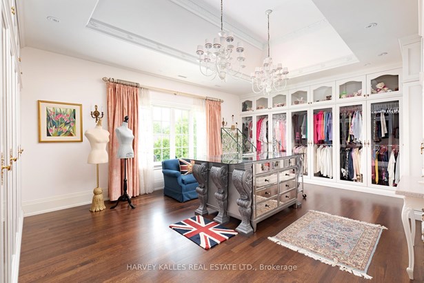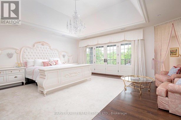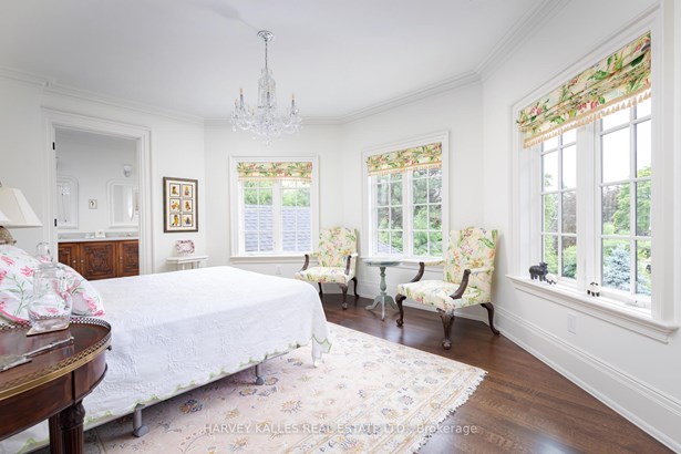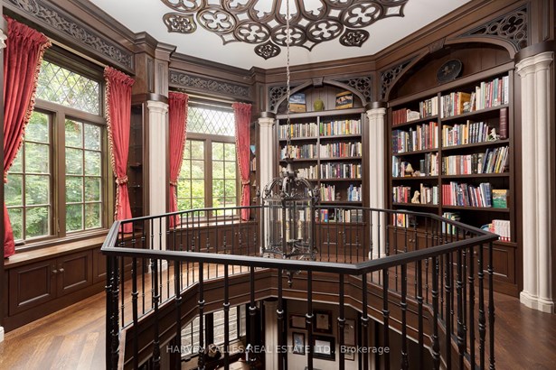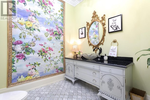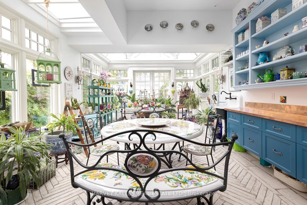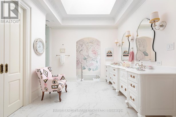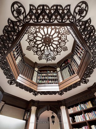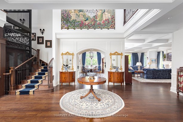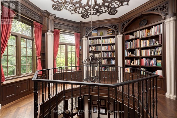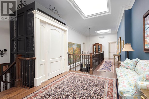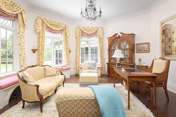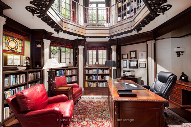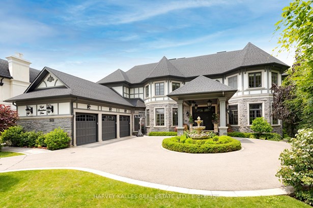 From vision to fruition, 8 Swansdown Drive stands as a truly unique and masterfully built residence. Every element was carefully chosen with intention, resulting in a home that exudes sophistication, comfort, and timeless beauty.Set on a secluded, lush lot in one of Torontos most prestigious neighbourhoods, the property offers unmatched privacy. A grand circular heated driveway welcomes you and your guests with ease, while a three-car garage securely houses your most prized possessions. The striking freestanding waterfall and manicured gardens create an instant sense of calm and retreat from the city.Inside, the double solid-oak doors open to a breathtaking two-storey foyer with soaring ceilings and open sightlines to the stunning rear gardens. The elegant living room features a wood-burning fireplace and retractable Floridian-style glass doors that open to a stone patio for al fresco dining. The sun-drenched kitchen and breakfast room overlook the lush grounds, while the formal dining room connects via a butlers pantry.The garden solarium is perfect for nurturing plants year-round. Additional main floor highlights include a cheerful office, art studio with water access, and a one-of-a-kind octagonal library with handcrafted detailing, a ceiling medallion, and hidden staircase.The second floor is accessed by a sweeping staircase or a wrought-iron Parisian-style elevator. A skylit hallway leads to four generous bedrooms, each with its own ensuite. A separate two-piece bath, laundry room, and pet spa complete this level.The lower level offers an impressive array of spaces: gym, yoga room, sauna, rec room, large storage, study, soundproof music room, guest suite, and more.Outdoors, enjoy over a million dollars in landscaping, a chlorine pool, fire pit, two covered pavilions (one with bar and bath), and stone pathways weaving through a magical setting.A rare offering. Welcome home. (id:6370)