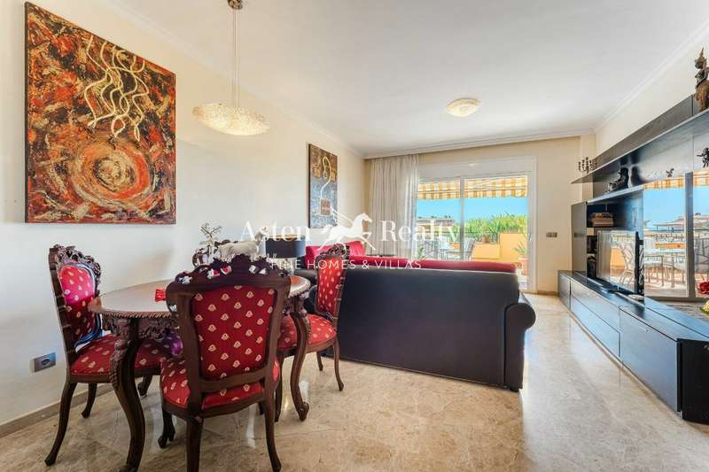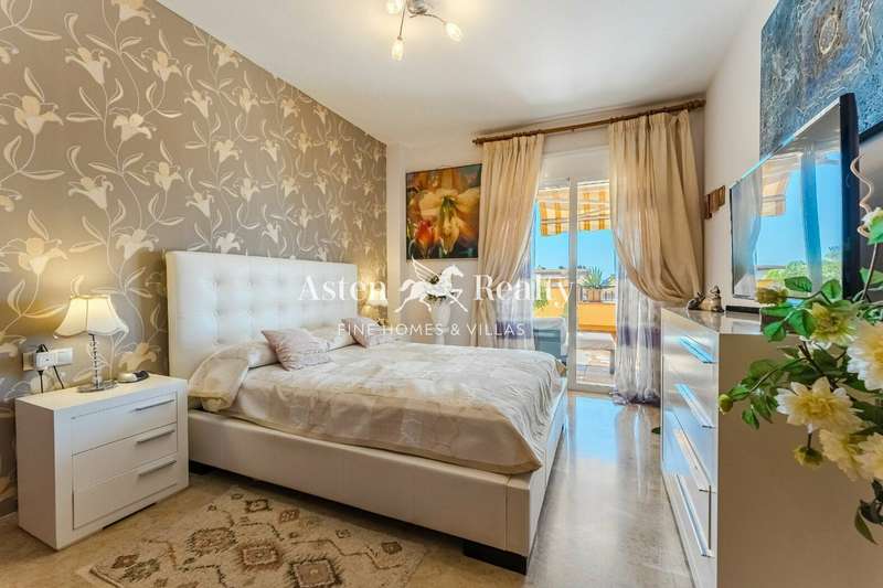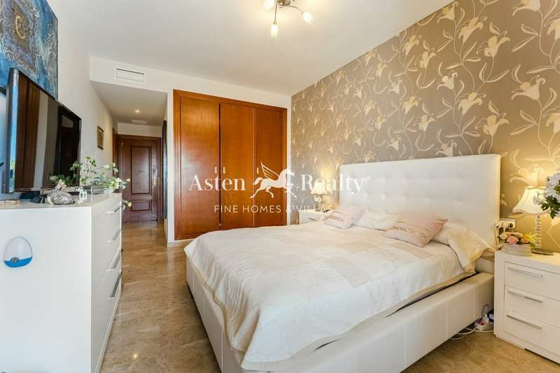 The apartment consists of a spacious living room, a separate fully equipped kitchen with access to a small garden terrace, two comfortable bedrooms, and two bathrooms. The living room and one of the bedrooms open onto a spacious terrace with magnificent views of the complex’s gardens, swimming pool, partial ocean views, and breathtaking sunsets.