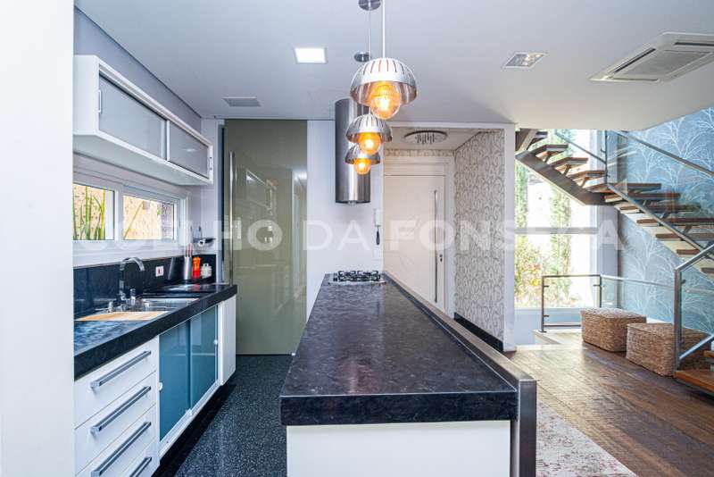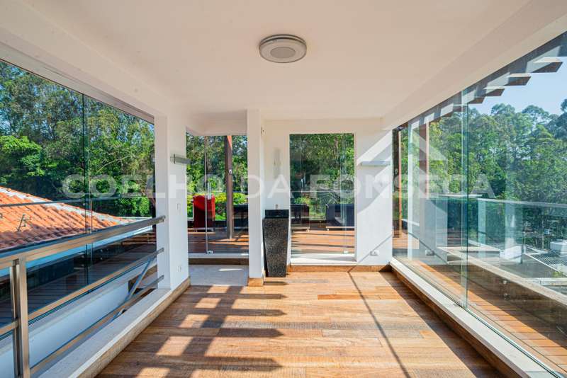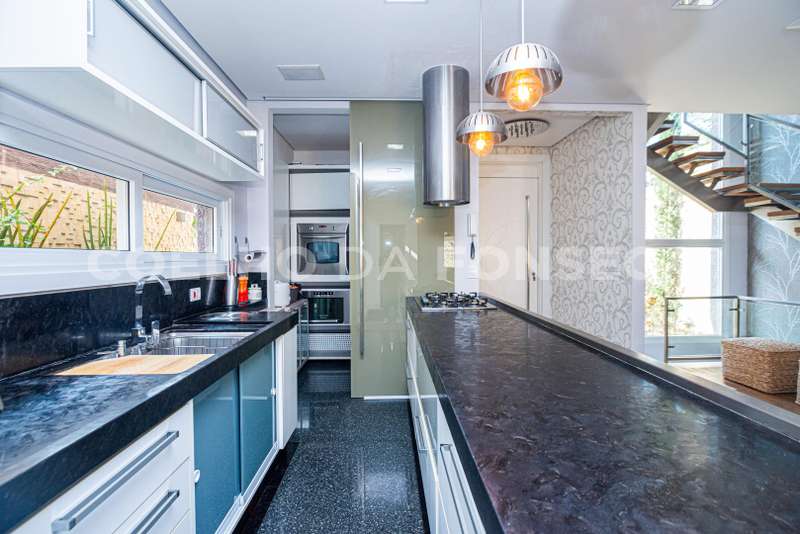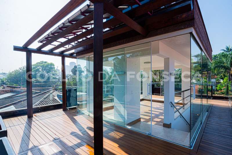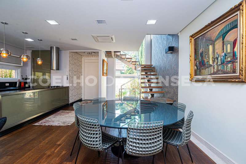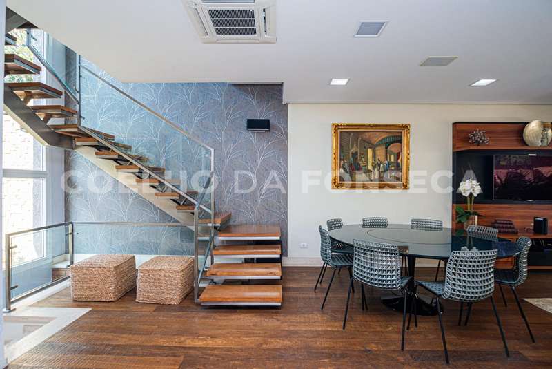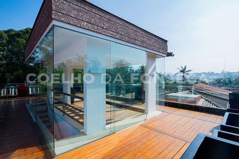 Garagem subterrânea para até seis veículos, depósito e banheiro. No primeiro piso, há um living, cozinha americana integrada, lavabo, terraço com pergolado elaborado com madeira nobre de demolição, área gourmet com churrasqueira, deck em madeira com chuveiro, piscina aquecida com iluminação em LED e hidro. Além disso, uma área de serviço com lavanderia. O segundo piso possui uma área íntima com três suítes, com destaque para a suíte master com vista privilegiada para o verde preservado da Granja Julieta e um amplo closet. O quarto e último piso apresenta um rooftop envidraçado e terraço para contemplar o pôr do sol.