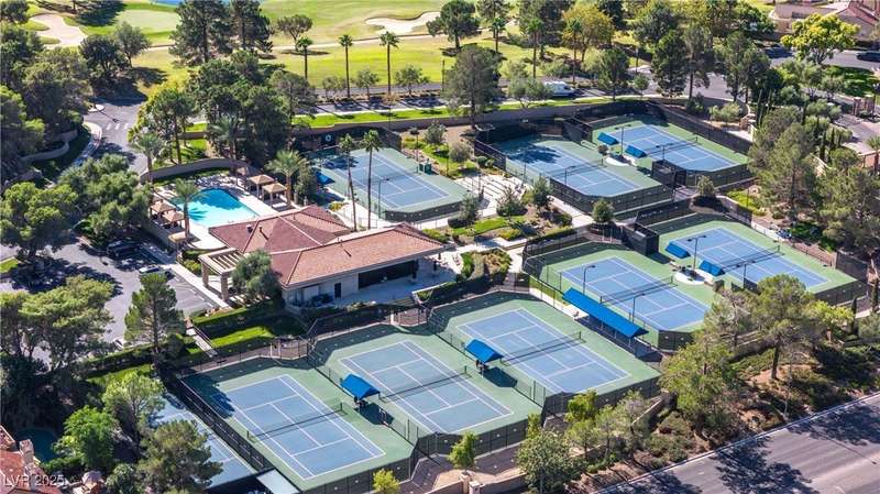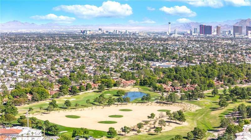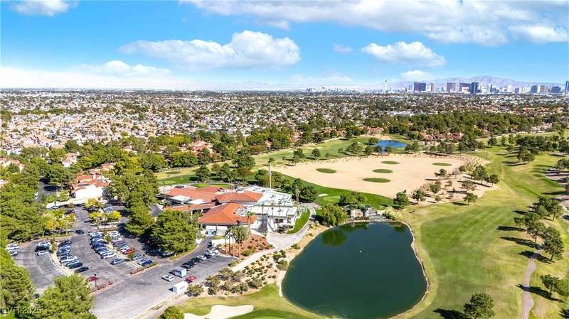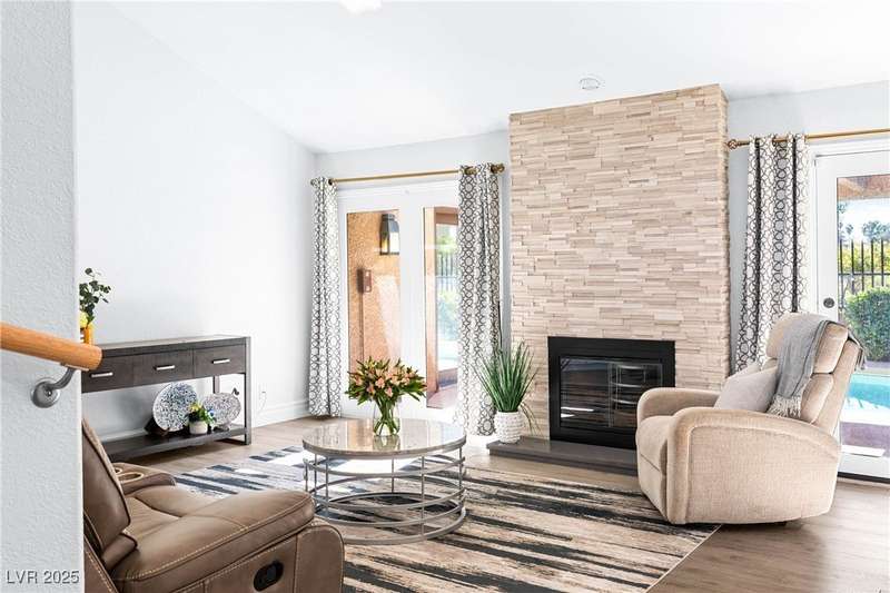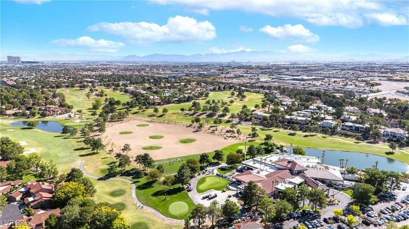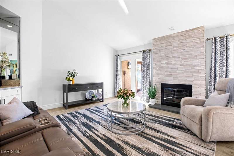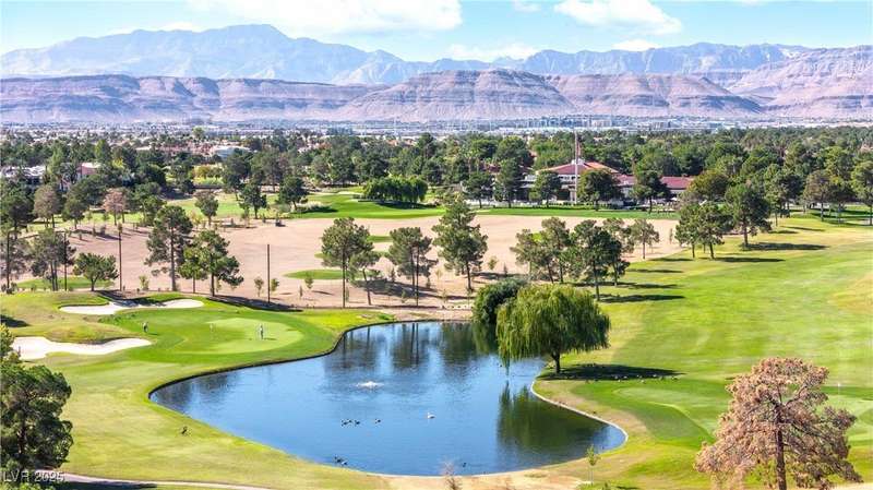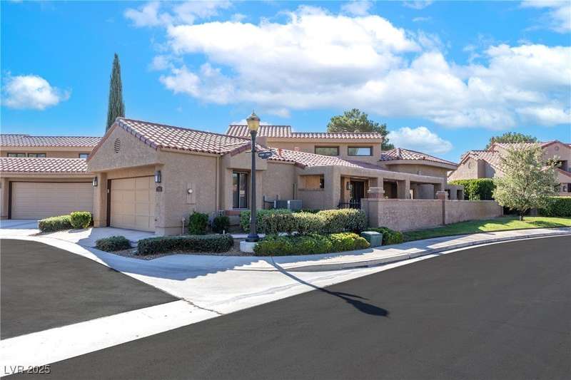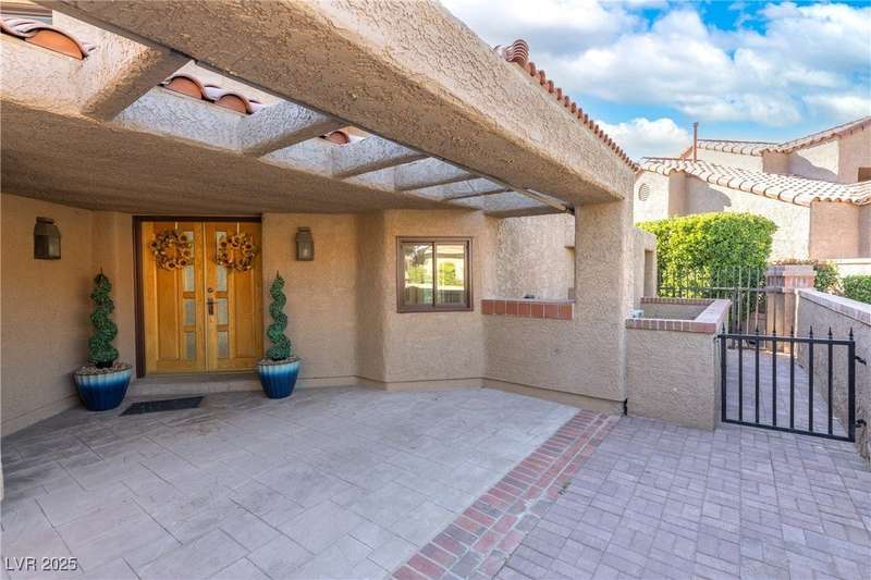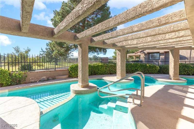 Rare chance to own one of only two homes in this subdivision with a private pool directly on the golf course in guard-gated Spanish Trail. Situated on a corner lot, this bright and airy home welcomes you through a quaint courtyard entry into a spacious living area with vaulted ceilings, raised windows, and a stacked stone fireplace. The modern kitchen features white cabinets, granite countertops with an undermount sink, stainless steel appliances, and a designer backsplash. The breakfast area offers bay windows that open to the exterior & bring in natural light. All bedrooms have direct access to the exterior or courtyard. Bathrooms are upgraded with full tile surrounds, & the laundry room includes upper cabinets. The primary suite features a walk-in closet and a luxurious bath with a separate tub and shower. The backyard has a sparkling pool framed by a dramatic architectural pergola, mature hedges for privacy, & golf course views, creating a resort-like setting ideal for relaxation.