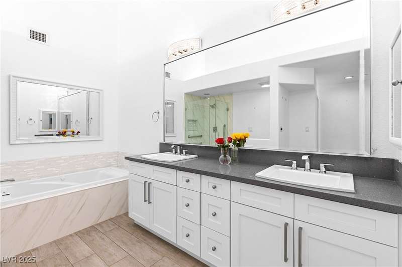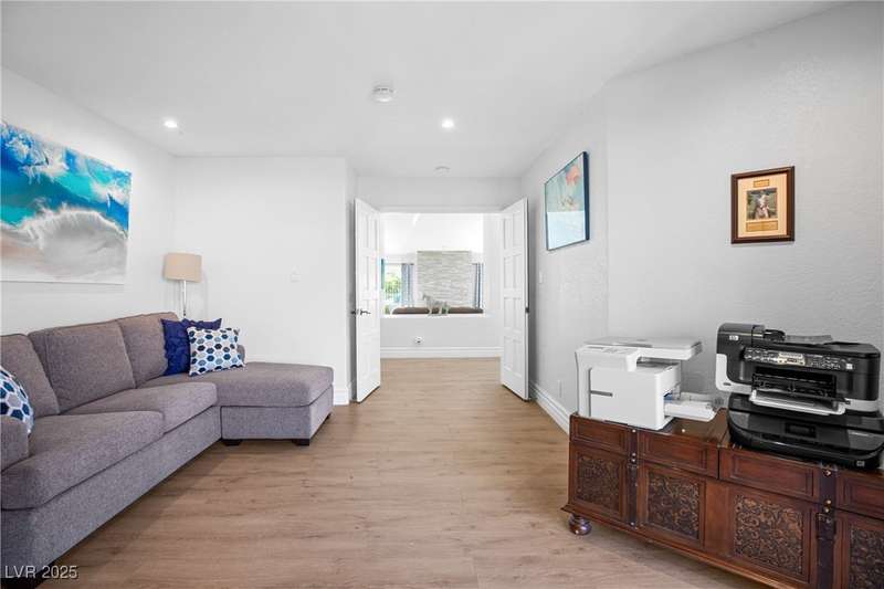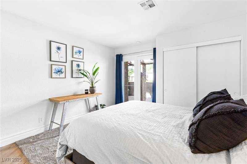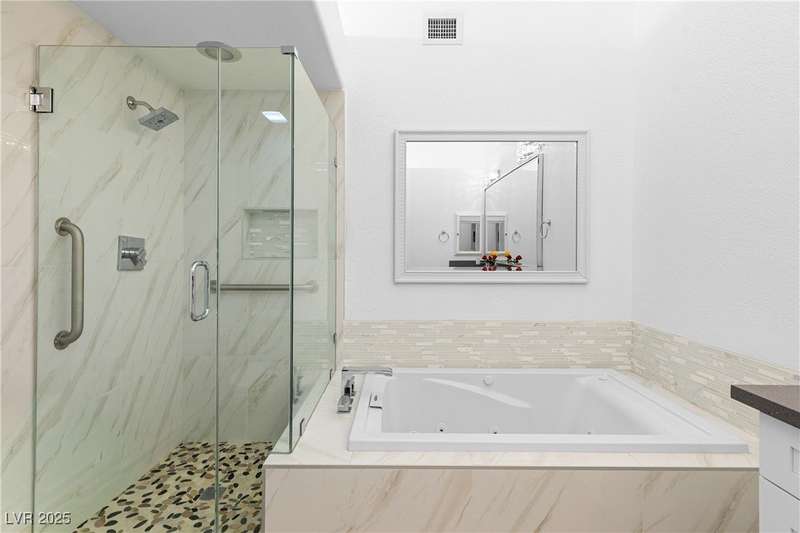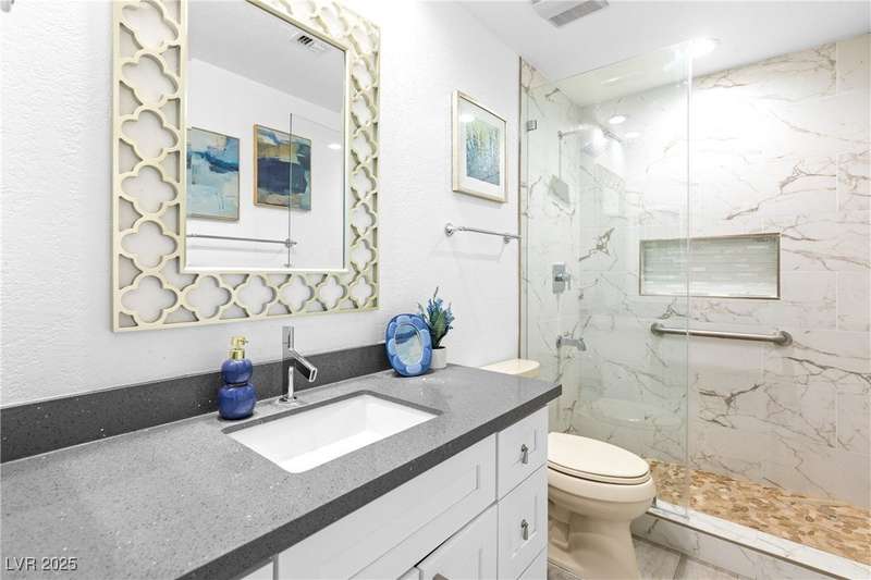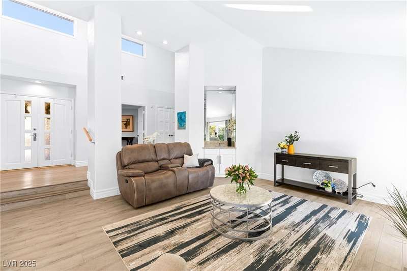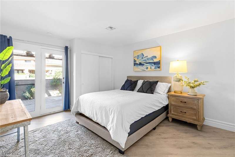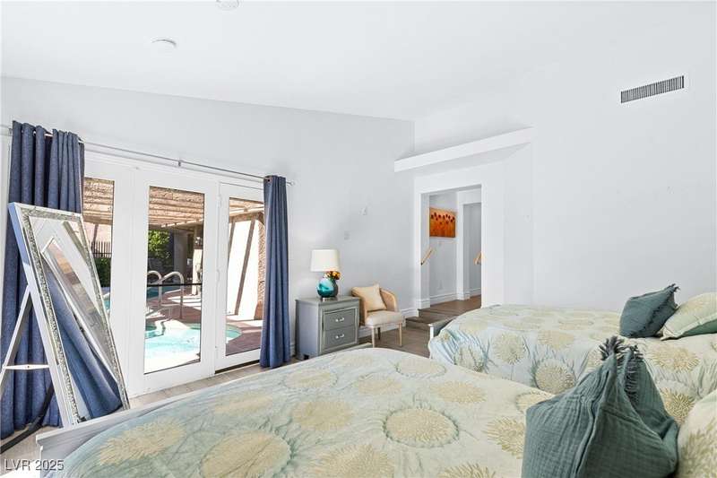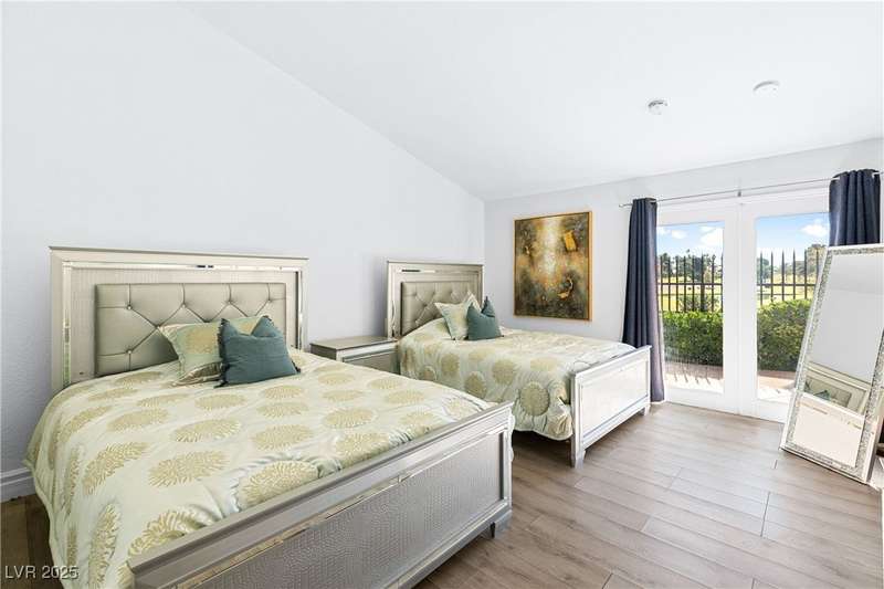 Rare chance to own one of only two homes in this subdivision with a private pool directly on the golf course in guard-gated Spanish Trail. Situated on a corner lot, this bright and airy home welcomes you through a quaint courtyard entry into a spacious living area with vaulted ceilings, raised windows, and a stacked stone fireplace. The modern kitchen features white cabinets, granite countertops with an undermount sink, stainless steel appliances, and a designer backsplash. The breakfast area offers bay windows that open to the exterior & bring in natural light. All bedrooms have direct access to the exterior or courtyard. Bathrooms are upgraded with full tile surrounds, & the laundry room includes upper cabinets. The primary suite features a walk-in closet and a luxurious bath with a separate tub and shower. The backyard has a sparkling pool framed by a dramatic architectural pergola, mature hedges for privacy, & golf course views, creating a resort-like setting ideal for relaxation.