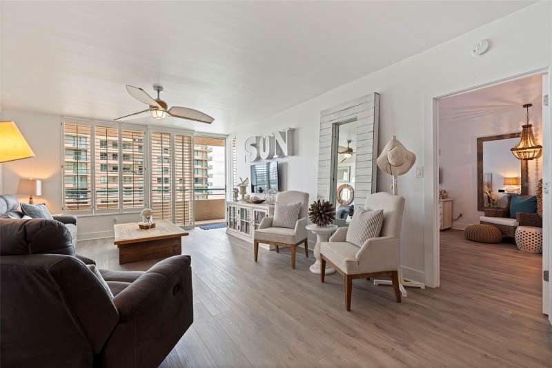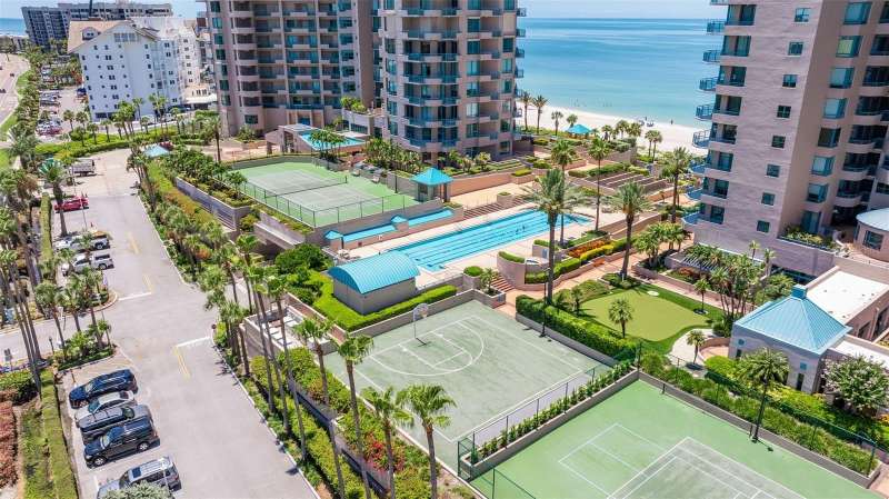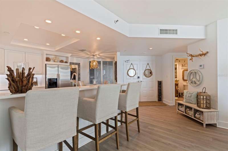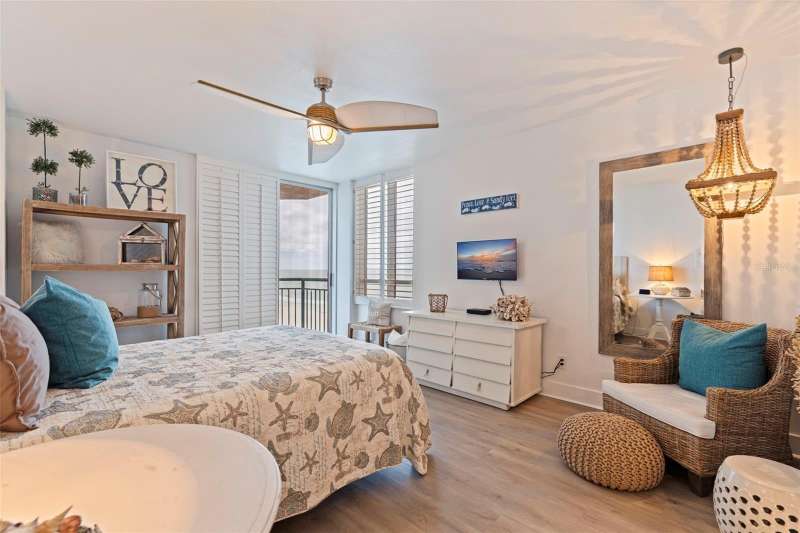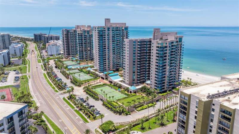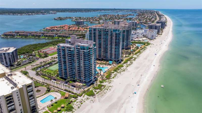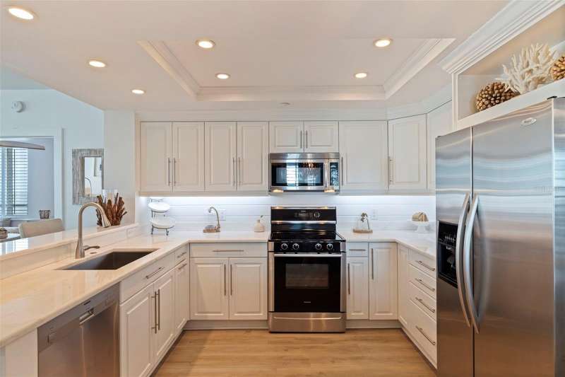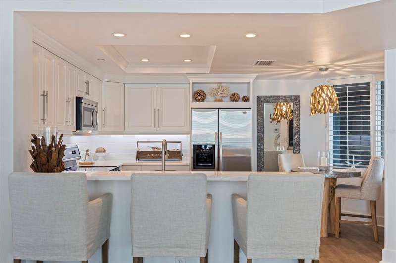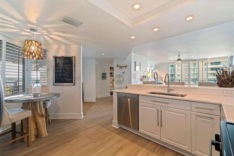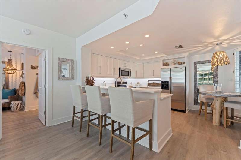 Under contract-accepting backup offers. Welcome to Coastal Chic!! This beautiful fully updated condo with southwest exposure has stunning sunsets everyday & views all the way down the beach. Luxury vinyl planking throughout makes for easy maintenance. Gourmet's delight eat-in kitchen has white shaker cabinets with marble tops & under cabinet lighting. Siemen's SS range, microwave & dishwasher with Whirlpool refrigerator. Breakfast bar opens to the living/dining room. Living room has shiplap accent wall. Popcorn removed from all ceilings. Designer fans & lighting throughout. Plantation shutters at every window & door. All interior doors replaced & updated trim with wide baseboards.. This split bedroom plan affords everyone their privacy. Guest bedroom has a shiplap accent wall along with large walk-in closet. Guest bath also has big tile -in shower. Both baths have custom wood vanities. Primary bedroom & lviing room have sliders that open to spacious balcony. Great for having a cool drink & watching the dolphin at play. Primary bathroom has wood vanity with double sinks, large jetted tub & nice tile shower. Huge walk-in closet. Designer furniture & furnishings included in sale. Fully turnkey. Just bring your toothbrush, bathing suit & flip flops. Coveted DEEDED PRIVATE GARAGE #18 in parking garage. A/C 2023 & water heater 2024. The Ultimar is a world class condo complex on Sand Key of famous Clearwater Beach. Miles of pure white sand. Lush tropical landscaped grounds are expertly maintained. 24 hr guard gated. True Resort Style complex has 3 geo thermal heated pools w/spas, 3 tennis courts, pickle ball, basketball ct, putting green, croquet lawn, grill area, firepit area, shuffleboard, corn hole, gym, steam & sauna, billiards rm, media rm, social rm with catering kitchen and baby grand piano. Walk to great restaurants & shops or catch the Beach Trolley right out in front of the building. A short drive to Tampa & the airport plus all of the sports venues of our championship teams. START LIVING THE FLORIDA BEACH LIFESTYLE TODAY!! Buyer to verify room dimensions. See Video. Call to make an appointment for your private viewing today!