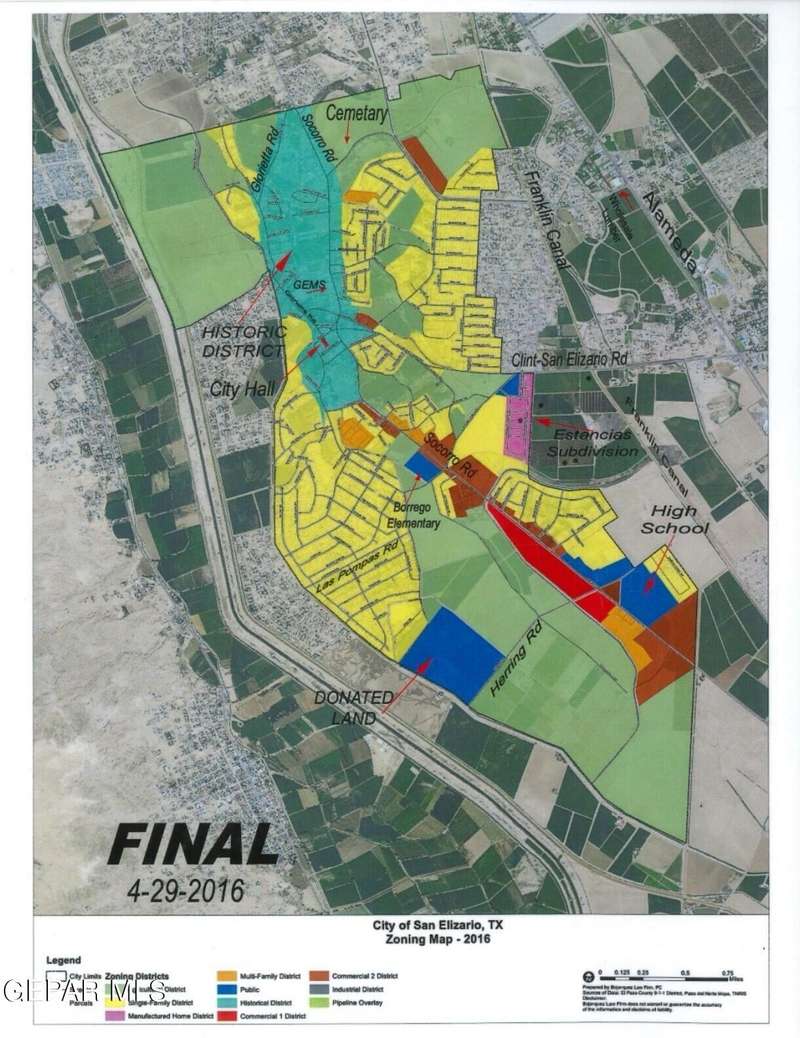 Right past the Historic Mission Trail. Great COMMERCIAL (C-2) lot with gas, electricity, and water/city sewer AT the property. Fenced all around. Cuadrilla (Socorro Rd.) Frontage; within a prime location off of Socorro Road, just past the historic district in the growing town of San Elizario, Texas. This piece of land with great exposure to main roads has endless possibilities! Information deemed reliable, but Buyer must verify zoning and permits details with San Elizario city.
