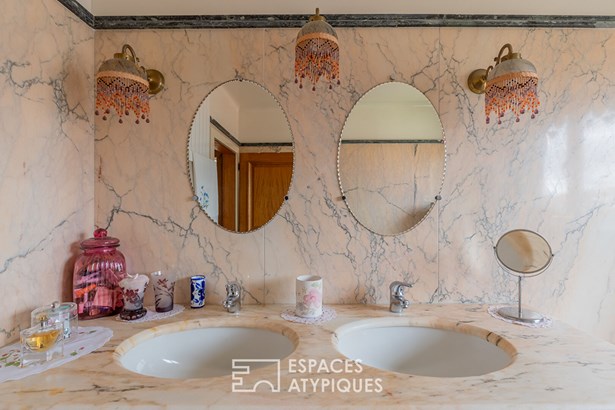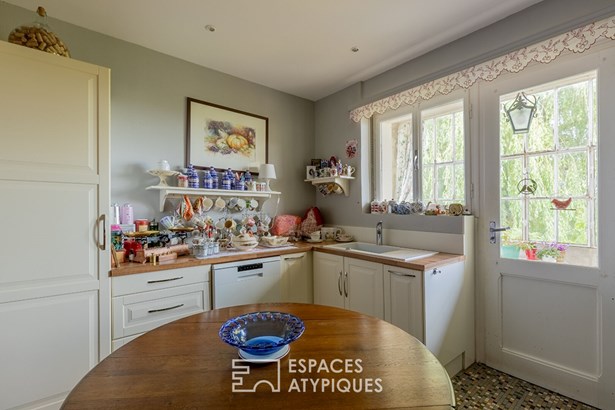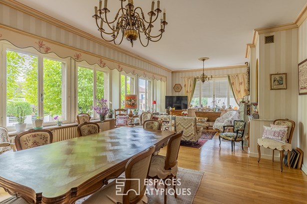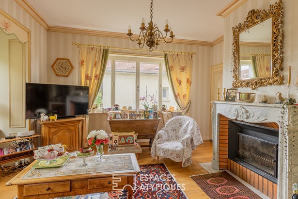 L'entree s'ouvre sur un hall en marbre beige-rose, distribuant les espaces du rez-de-chaussee. Le salon-sejour profite d'une belle luminosite grace a ses nombreuses ouvertures. Le parquet massif apporte chaleur et authenticite, tandis que la cheminee en marbre structure l'espace avec elegance. La cuisine independante, fonctionnelle et equipee s'ouvre sur une loggia couverte permettant d'acceder au jardin. Une piece attenante, a usage modulable, peut accueillir un bureau, une chambre ou une salle a manger selon les envies.