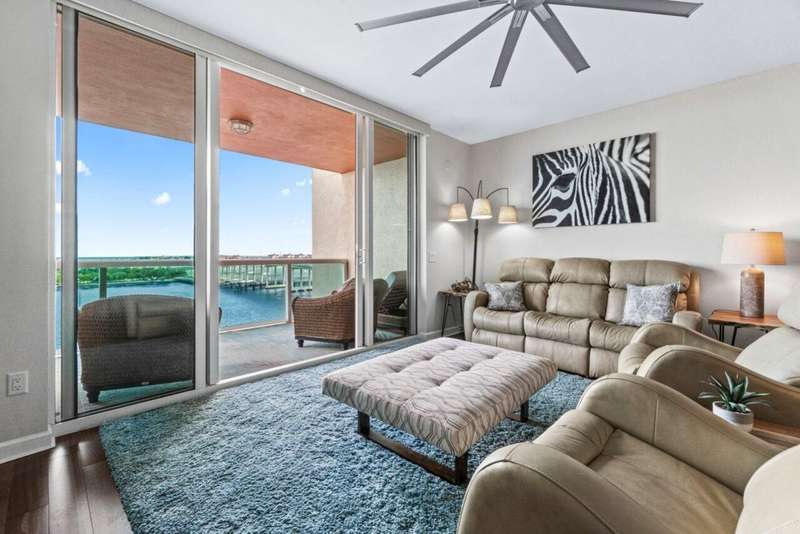 Pristine 9th floor 2BR+den/3BA unit overlooking the Intracoastal & ocean, impact glass, semi-private elevator access. Open concept, split floor plan with Den that can easily convert into a 3rd bedroom. Main living areas with engineered wood floors! Spacious owners suite w/his & her walk-in closets. Primary bath w/double vanity, jetted bath & water closet. Stainless steel appliances in the open kitchen. Assigned garage parking & climate-controlled storage unit. 24/7 manned gate, valet, NEW tennis, NEW pickleball and bocce, walking path w/gazebo, Newly renovated rooftop oasis w/pool, spa, BBQ areas, clubhouse, billiard room & fitness center. Marina w/dry docks available. Pet Friendly Community. Ready for you to enjoy and watch the sunrise every morning - Immaculate Condo!