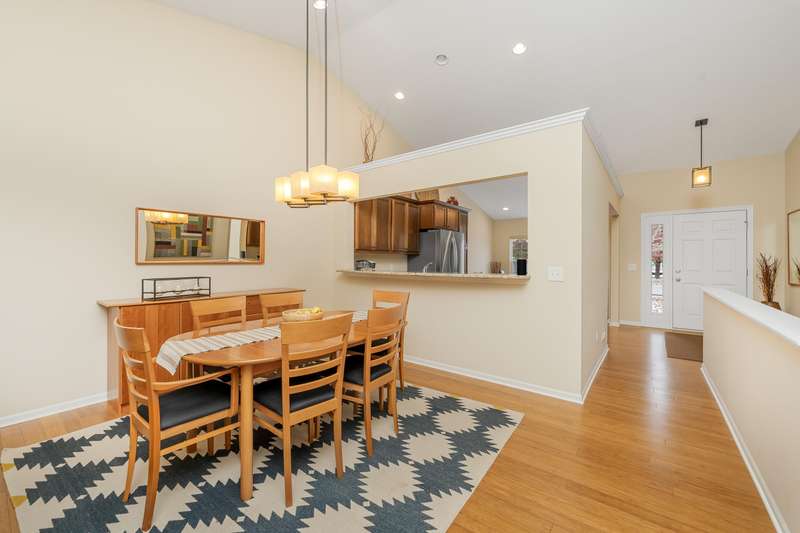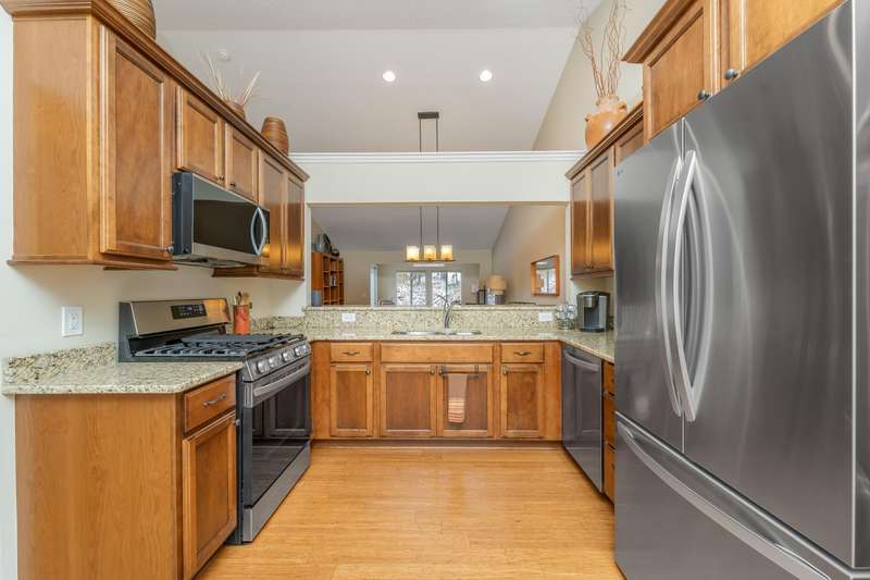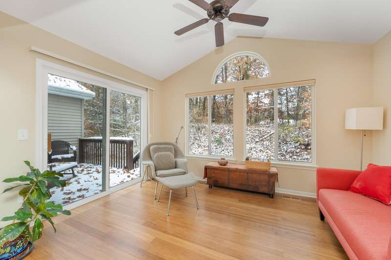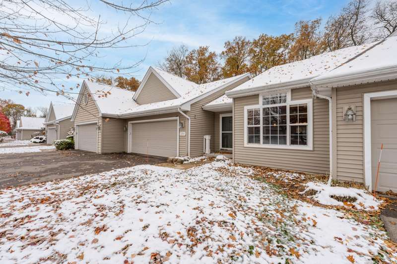 Welcome to this larger than typical Quail Meadows condo! It features include a much larger owner's suite w/tray ceiling, large walk-in closet, separate laundry room, and extended dining area in kitchen. Secluded location and wooded view add to the ambiance. The sunroom has slider to private deck w/stairs to the ground level. The finishes include bamboo floors in the foyer and kitchen, great room and four season's room, granite kitchen counters, maple cabinetry, custom ceramic shower and ceramic tile floors. Lower level includes huge family room, guest bedroom and guest bathroom, all with great natural light. The community includes a beautiful boulevard entry, guest parking, street lighting, landscaped islands and cul-de-sacs. Don't miss out on this beautiful place!