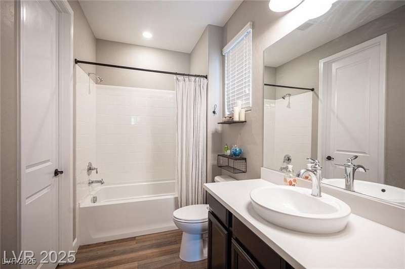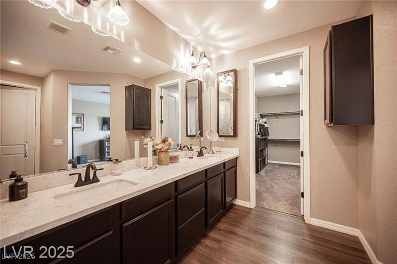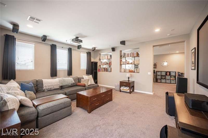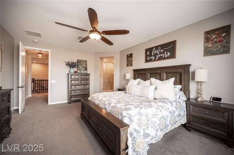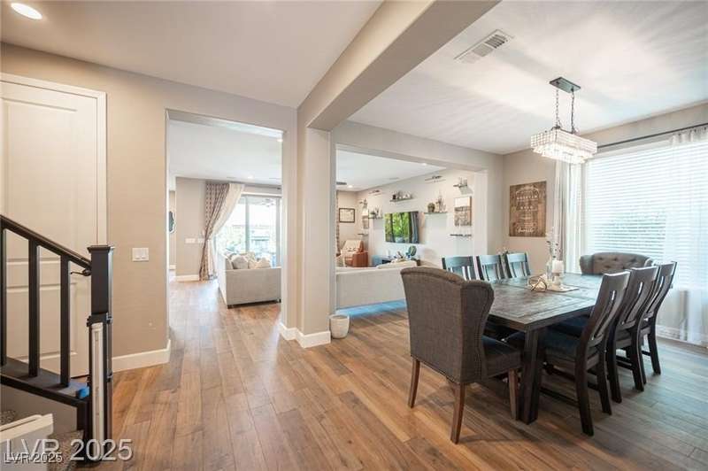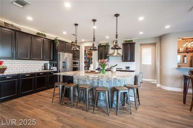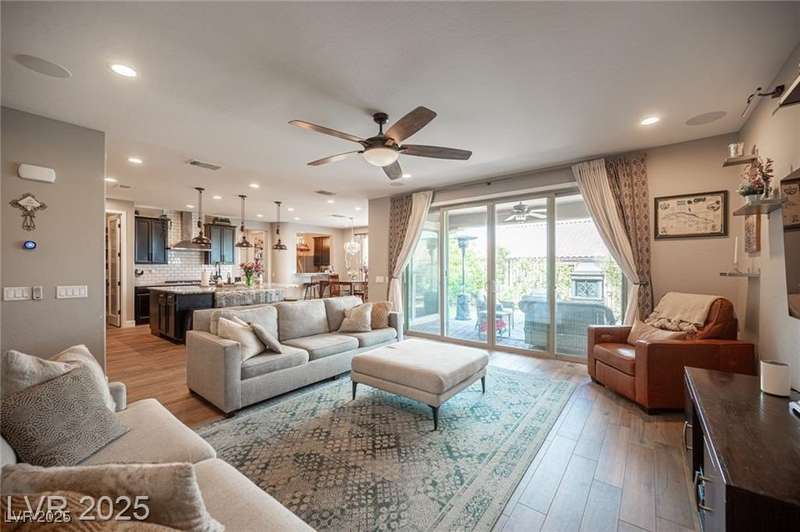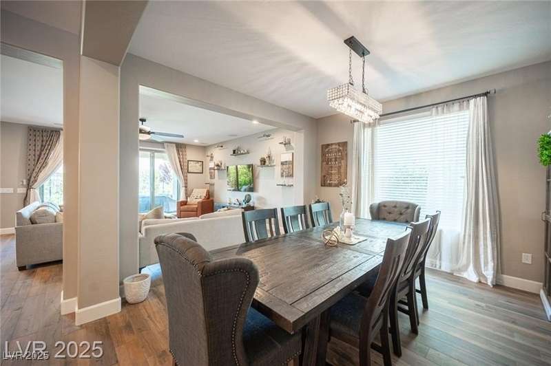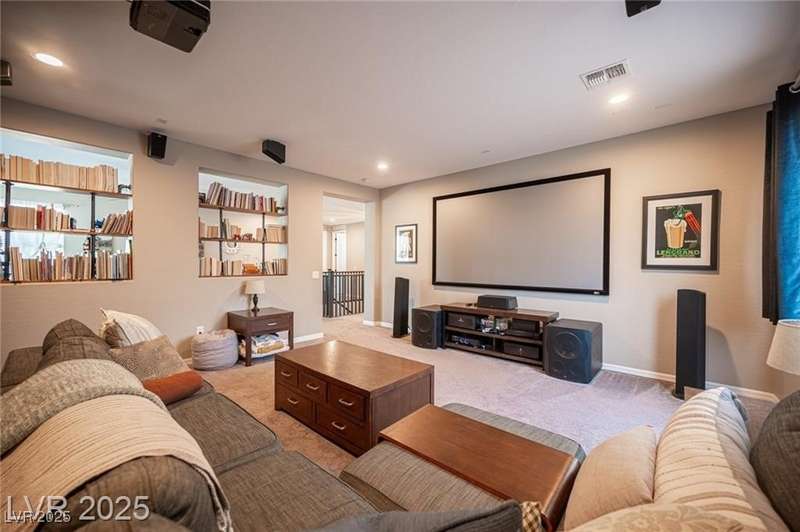 This stunning home offers the perfect blend of luxury and functionality, nestled next to mountains, yet with easy freeway access. The gourmet kitchen features granite countertops, a double oven, a huge walk-in pantry, and a wraparound breakfast bar island with stone accents and recessed lighting. The open floor plan flows seamlessly into the living area, where huge sliding doors bring in natural light, complete with breakfast nook & dining room. A double loft upstairs provides incredible versatility-perfect for a second living area, home office, or play space. The primary suite boasts a large walk-in closet and spa-like bath, while a junior suite downstairs offers privacy with its own en-suite bath and walk-in closet. For entertainment lovers, the movie room with a projector, screen, and Mountain Views (wired for 11.2 surround sound) is a standout feature. A 3-car tandem garage and high-end finishes, including marble and wood-look porcelain flooring, complete this exceptional home.