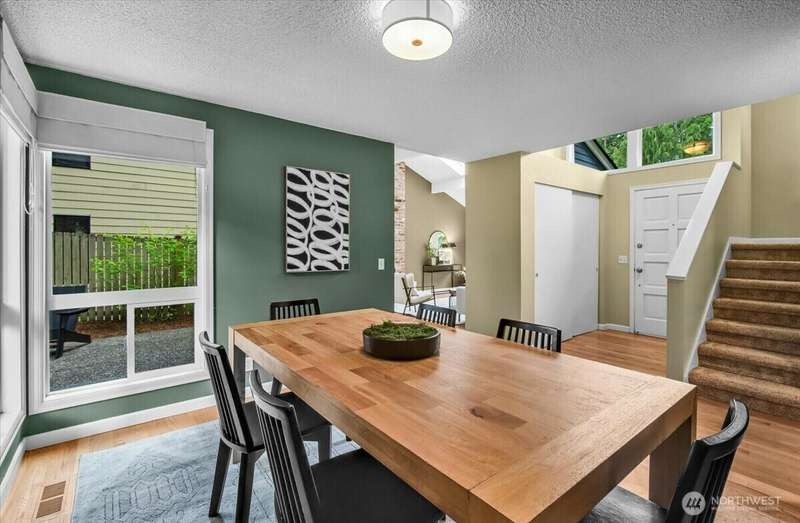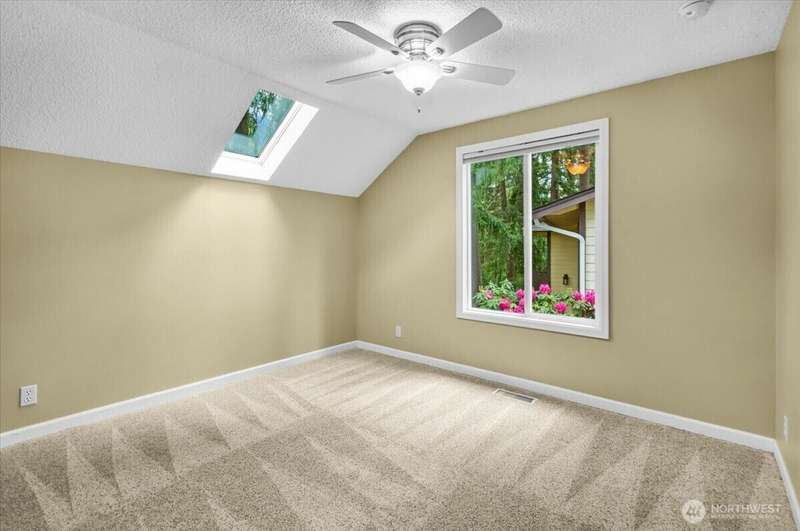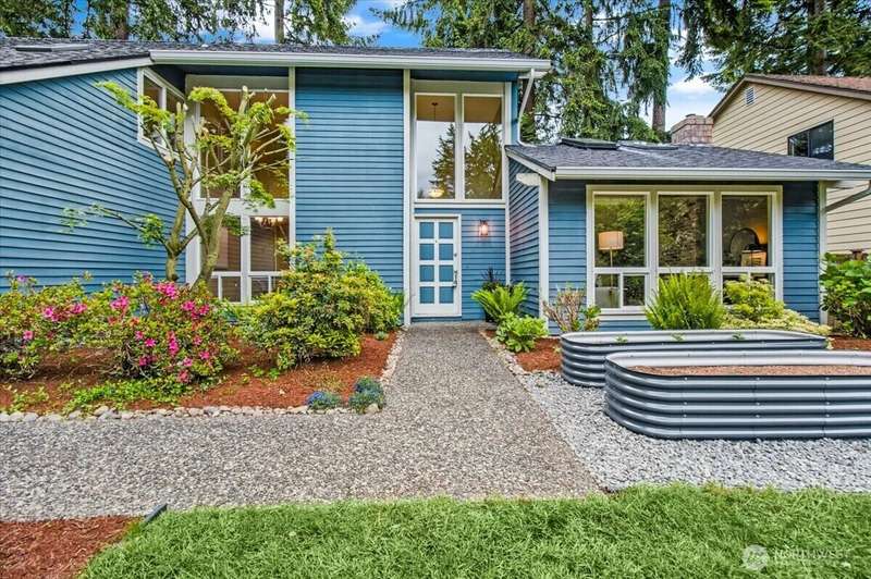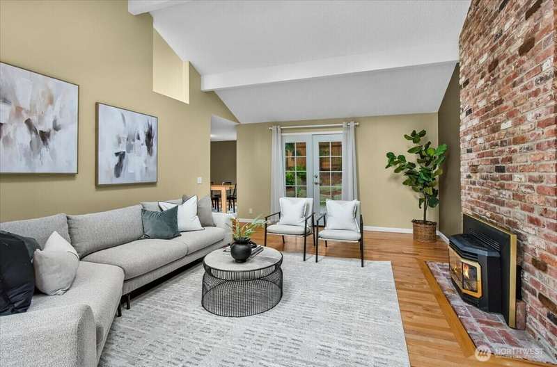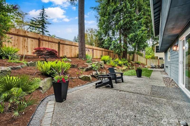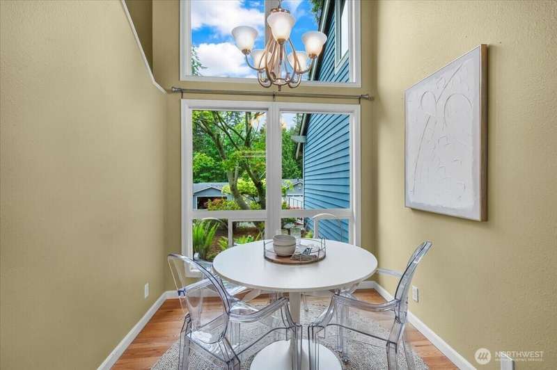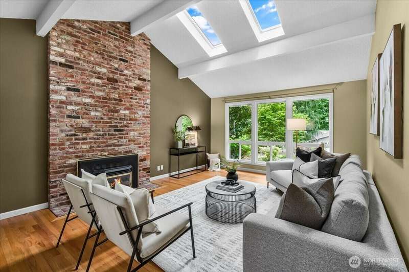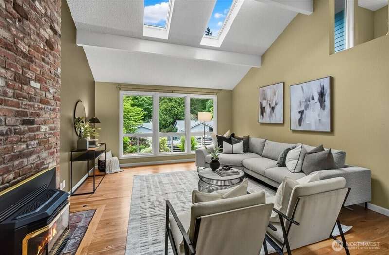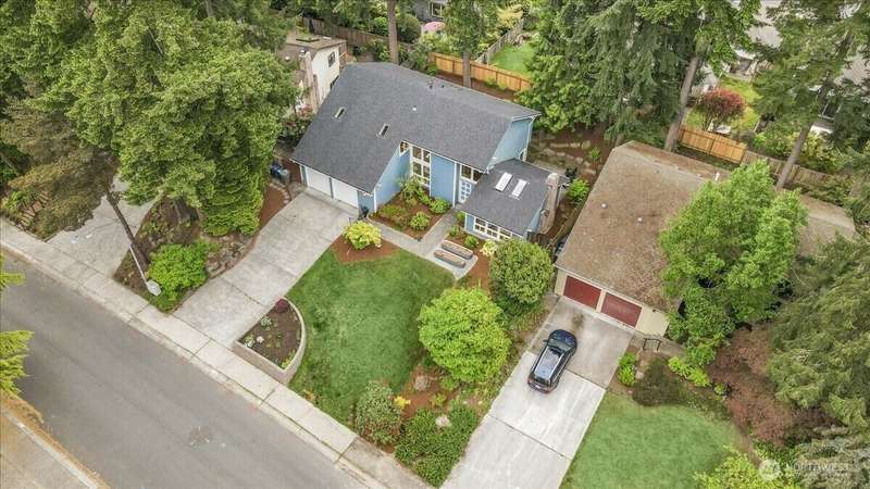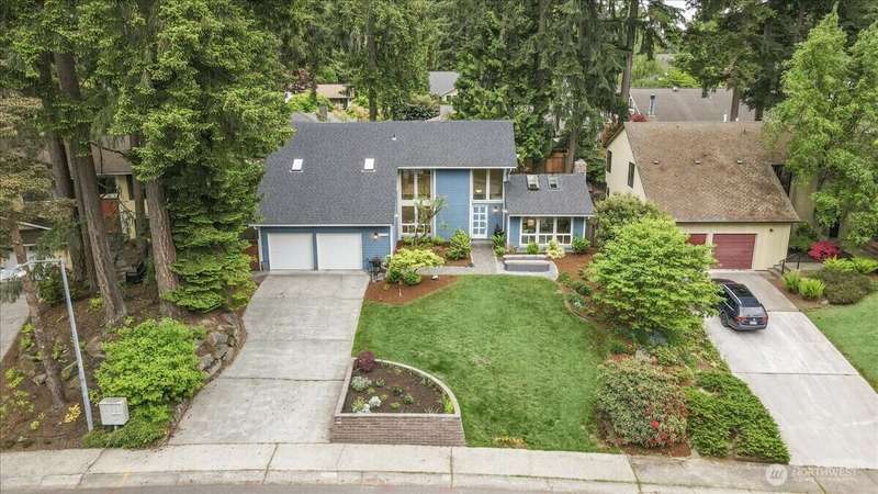Fantastic 4 bedroom home on a quiet, dead end street in Kirkland’s sought-after community of High Woodlands. Vaulted ceilings with walls of windows and skylights flood this floorplan with natural lighting. Hardwood flooring throughout main floor featuring gracious Living and Dining rooms plus unique eating space off kitchen. French doors with level walk out to rear patio. 4 bedrooms up including primary suite with walk-in closet. 2 car attached garage w craft/flex rm. New roof in 2024. Fully fenced with private, low maintenance yard. Trail leads to private neighborhood pool, park, & tennis courts. Close to Wineries, Totem Lake Mall, Evergreen hospital, and easy freeway access.