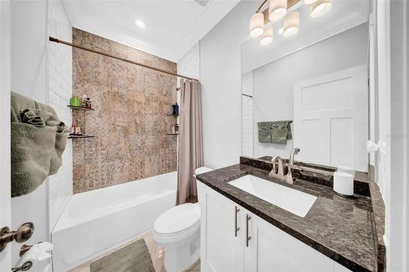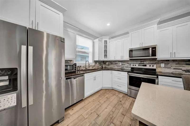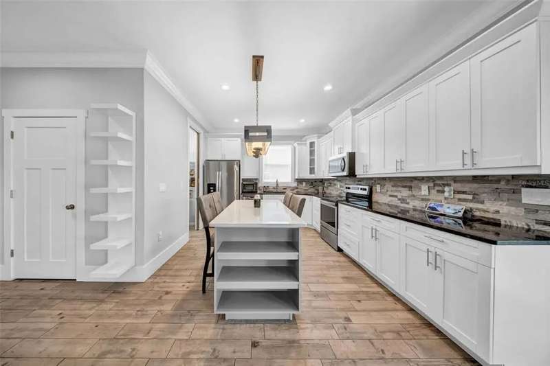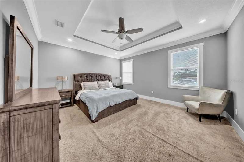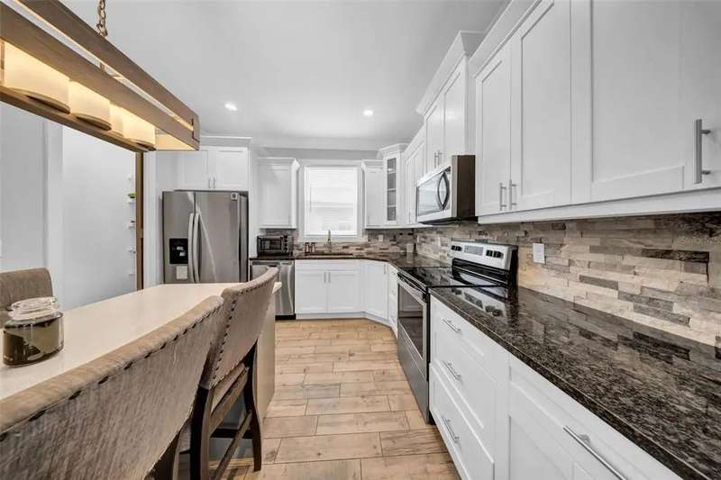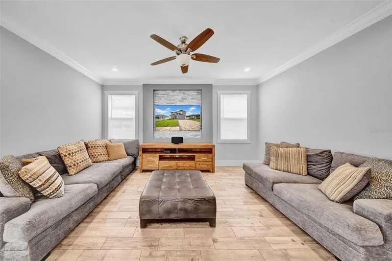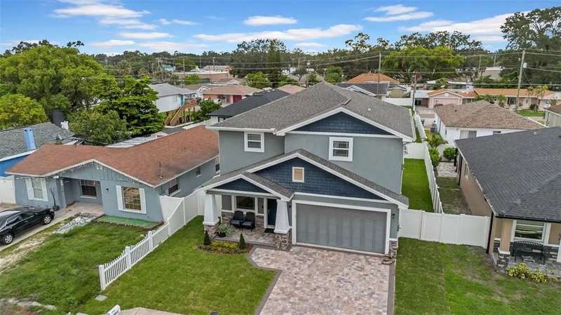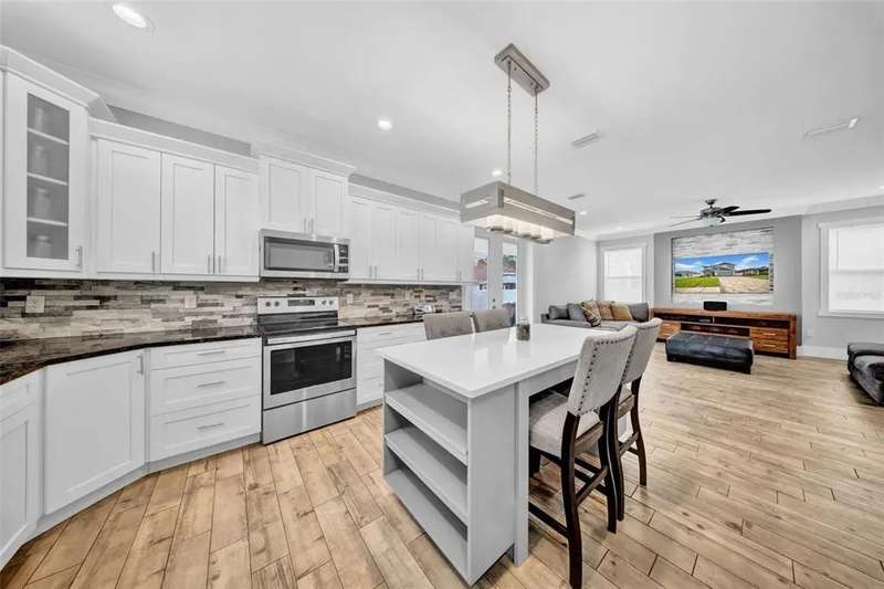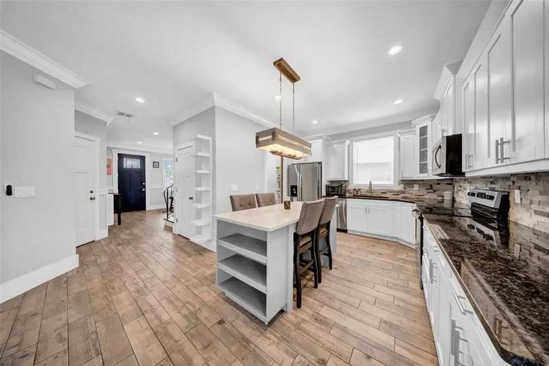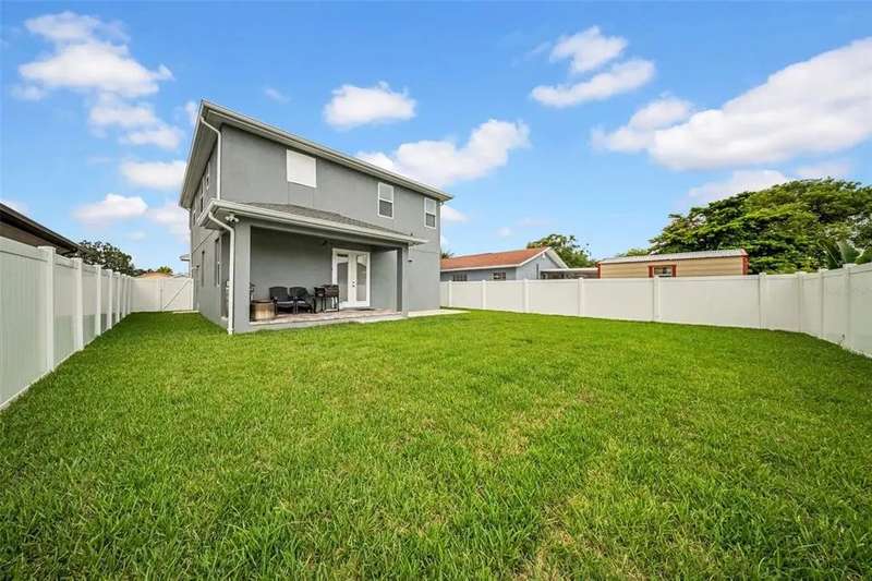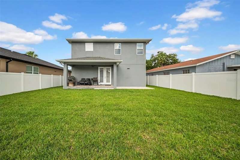 Discover this beautifully upgraded two-story home featuring 4 spacious bedrooms and 2.5 bathrooms. From the moment you step inside, youâ??ll notice the attention to detail and high-end finishes throughout. The main living areas showcase elegant porcelain wood-look tile, 9'4" ceilings, crown molding, and oversized 8" baseboards, creating a refined and cohesive atmosphere. The gourmet kitchen is a true centerpiece, complete with soft-close white wood cabinetry, granite countertops, a barn door pantry, and a large quartz island perfect for entertaining. The adjacent living room features a custom media niche with built-in HDMI, while the striking wrought iron staircase adds a sophisticated touch. Upstairs, the luxurious primary suite offers a tray ceiling, dual walk-in closets, and a spa-inspired en-suite bath with an expansive stand-up shower featuring dual showerheads, a freestanding soaking tub, dual vessel sinks with granite countertops, and timeless subway tile walls. Built with efficiency in mind, this home includes energy-saving LED lighting, a tankless water heater, and an insulated garage door with a WiFi-enabled LED opener. Exterior highlights include a brick paver driveway, a covered back patio ideal for outdoor gatherings, and white vinyl fencing surrounding the private backyard. Ideally located just 15 minutes from Downtown Tampa, 10 minutes from Tampa International Airport, and only an hour from Floridaâ??s world-renowned Gulf Coast beaches, this home offers both luxury and convenience.