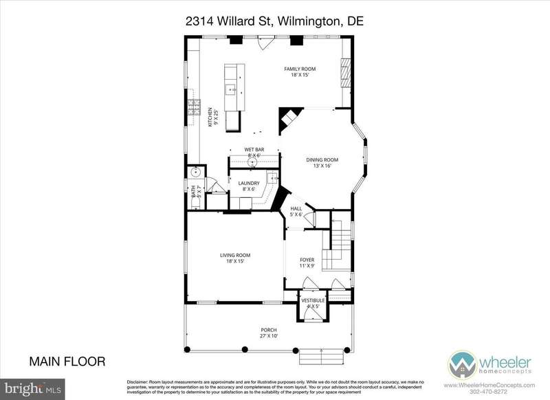 Welcome to 2314 Willard Street - a timeless 1920s detached brick Colonial nestled in the heart of the coveted Highlands neighborhood! Just blocks from Rockford Park and within walking distance to Trolley Square, the Delaware Art Museum, and a variety of local restaurants and shops, this home offers the perfect blend of charm, convenience, and character. Lovingly maintained and thoughtfully updated by the current owners for the past 47 years, this residence exudes warmth and pride of ownership throughout. Step inside to a stunning first floor featuring a welcoming front porch, a classic vestibule, and a grand foyer with a charming stair seat. The traditional living and dining rooms showcase original details, including elegant moldings and a built-in corner cabinet. A beautifully designed kitchen and family room addition (2003) brings modern comfort with black granite countertops, custom cabinetry with pull-out drawers, a Thermador 5-burner gas range and double oven, Sub-Zero refrigerator, and a custom wet bar with undercabinet lighting. The adjacent family room features built-ins and a cozy gas fireplace. Enjoy the convenience of a first-floor laundry room with extra cabinetry and a built-in ironing board, a large pantry with built-in shelving, and a powder room for guests. Glass doors open to a fully fenced, beautifully landscaped rear yard with a brick patio-perfect for entertaining. Mature landscaping surrounds the property, adding privacy and curb appeal. Upstairs, the second floor offers three spacious bedrooms, a dressing room, and a 2nd floor Den. The third floor includes a fourth bedroom, a second full bath, and generous storage space-ready for your personal touch and renovation vision. Additional highlights include a just-renovated main bathroom with a gorgeous tile shower, a detached one-car garage, and driveway parking-an exceptional bonus for city living. Systems and upgrades include 2-zone central air and gas furnace, a 50-year architectural roof with transferrable warranty (installed in 2013), and all-new Pella Architectural Series windows installed in 2003 (57 windows with vinyl exterior and wood interior). Don't miss this rare opportunity to own a piece of history in one of Wilmington's most desirable neighborhoods!