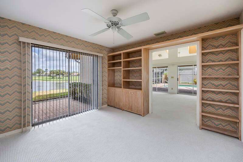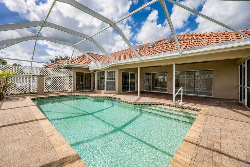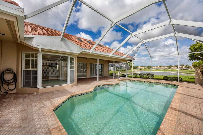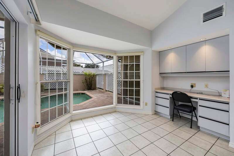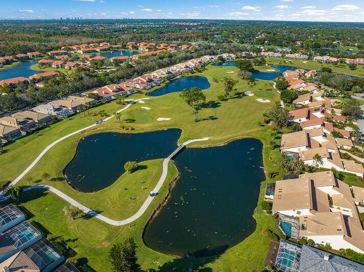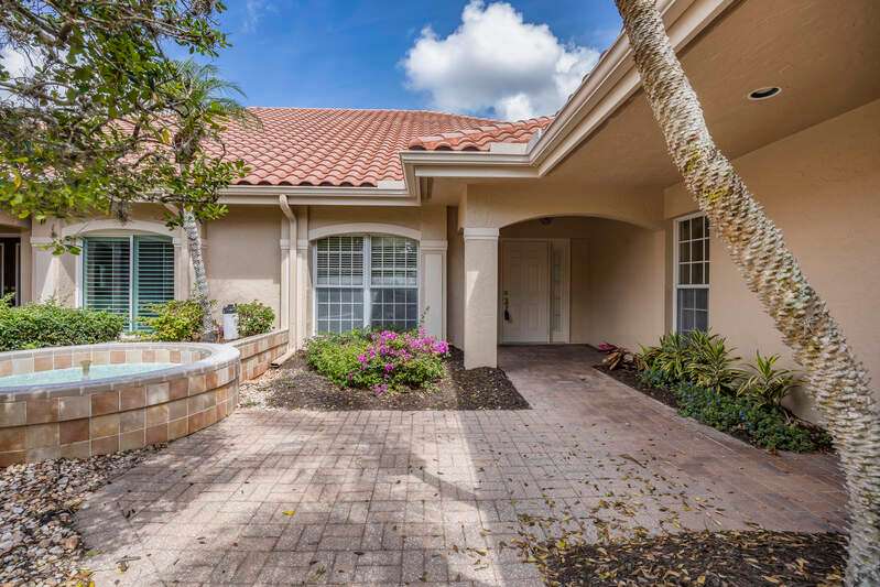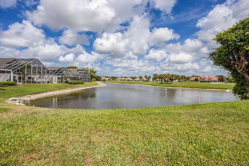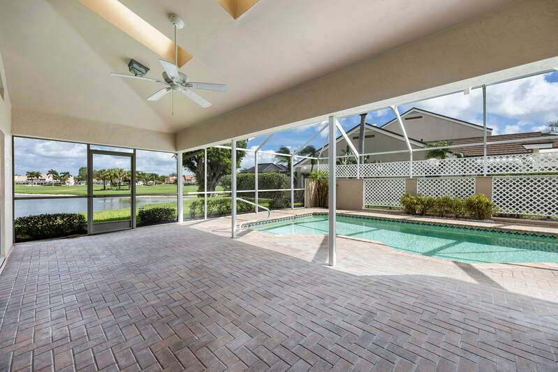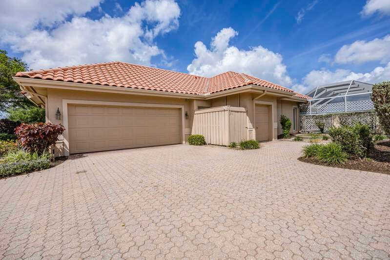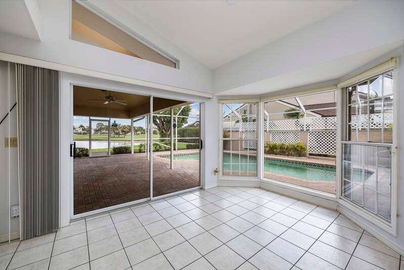 A short Walk to Club House, Golf Course, Tennis Courts. Attached 2 unit Villa with fountain in courtyard entry.Beautiful views of back lawn/lake/golf course (16th hole). Open spacious floor plan with views from kitchen to great room for entertainment plus screened Lanai with in ground Pool for enjoyment. Two full baths, 2.5 attached car garage, large primary bedroom with tub, shower and walk in closet. Wake up to views to your pool/backyard/lake/golf course. Plus two large bedrooms with shared bath/shower area. Possible Contractors and Investors ready for your ideas. Golf membership is Optional but Social membership included. Great location and convenient to Main Club House. Vacant and ready to move in, sellers want it SOLD, make us an offer. Great buy, won't last.