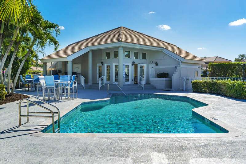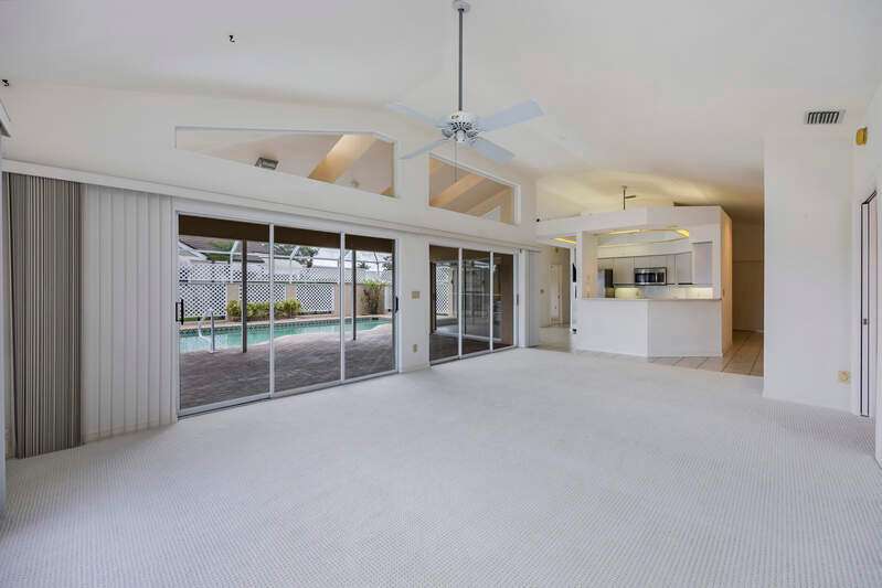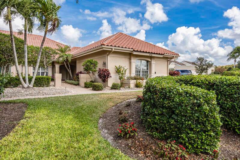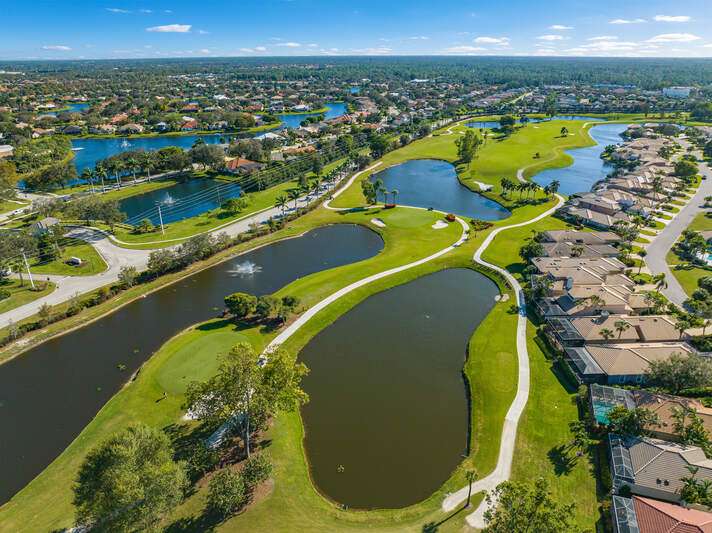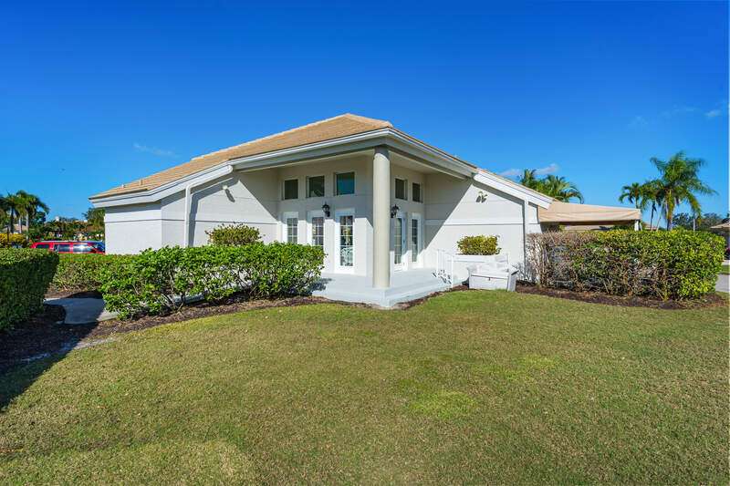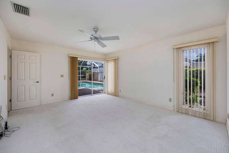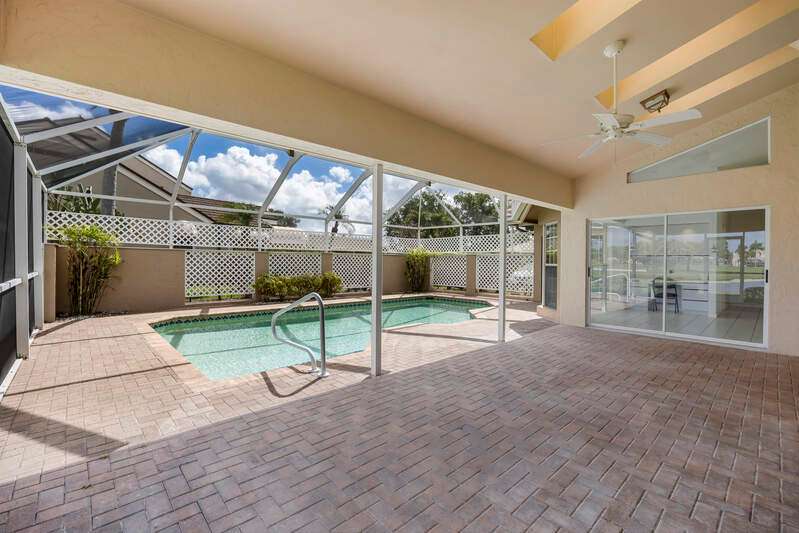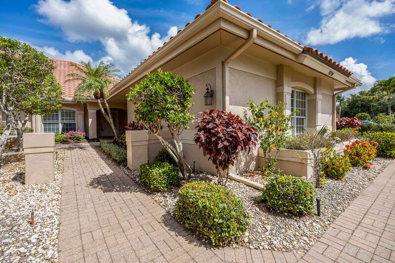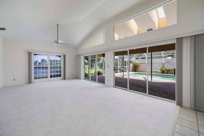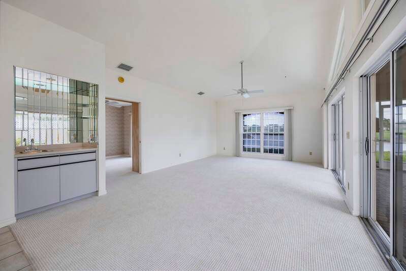 A short Walk to Club House, Golf Course, Tennis Courts. Attached 2 unit Villa with fountain in courtyard entry.Beautiful views of back lawn/lake/golf course (16th hole). Open spacious floor plan with views from kitchen to great room for entertainment plus screened Lanai with in ground Pool for enjoyment. Two full baths, 2.5 attached car garage, large primary bedroom with tub, shower and walk in closet. Wake up to views to your pool/backyard/lake/golf course. Plus two large bedrooms with shared bath/shower area. Possible Contractors and Investors ready for your ideas. Golf membership is Optional but Social membership included. Great location and convenient to Main Club House. Vacant and ready to move in, sellers want it SOLD, make us an offer. Great buy, won't last.