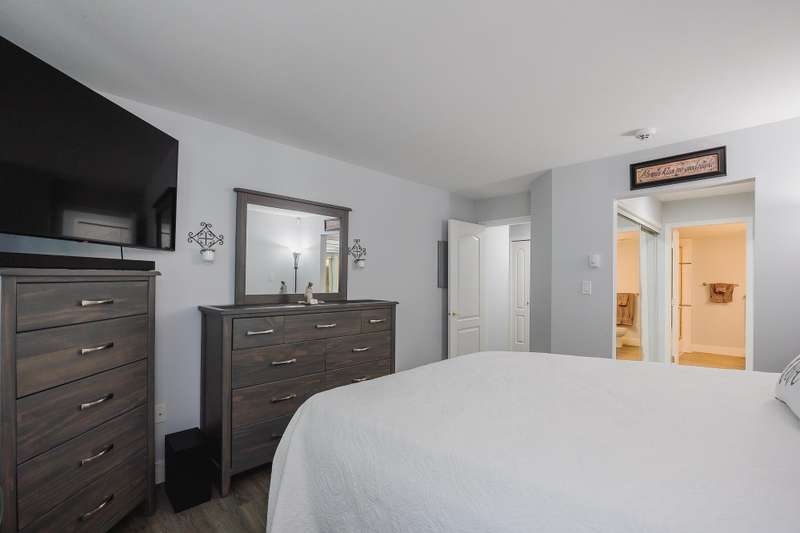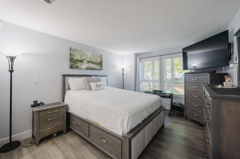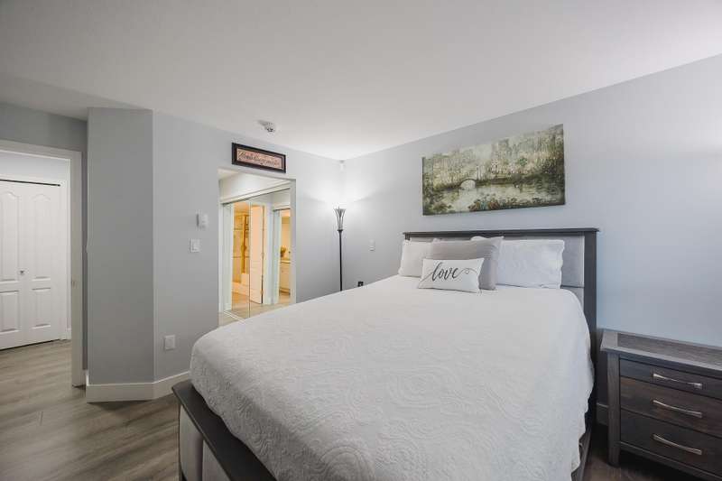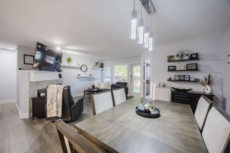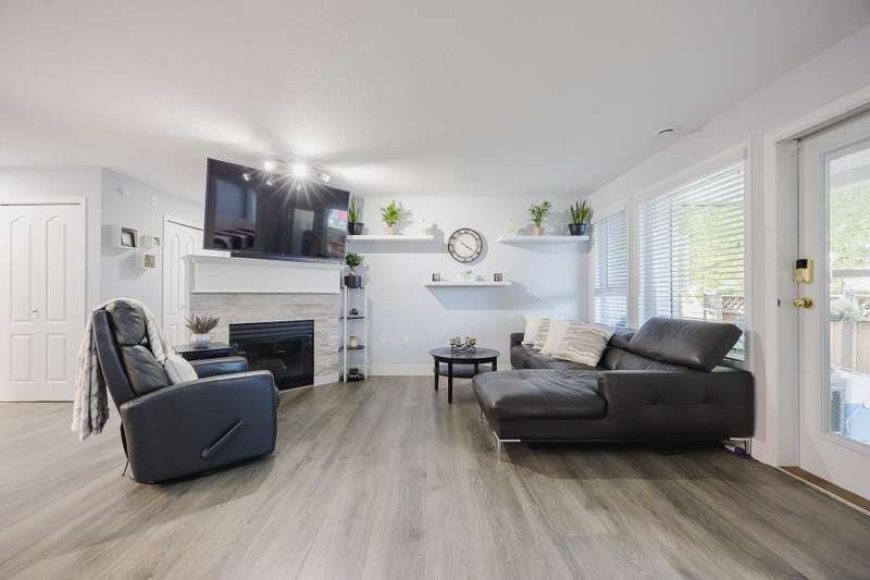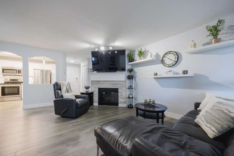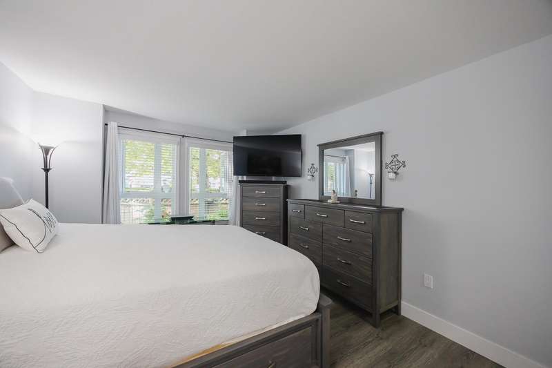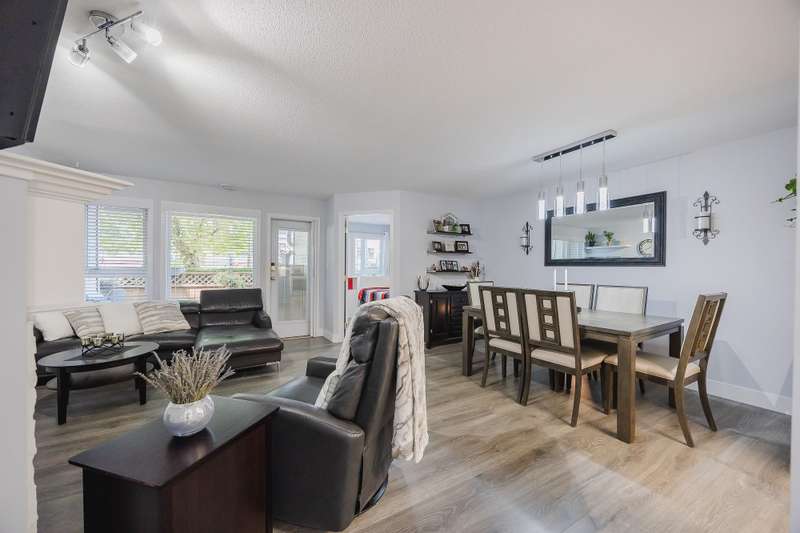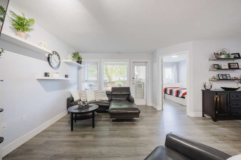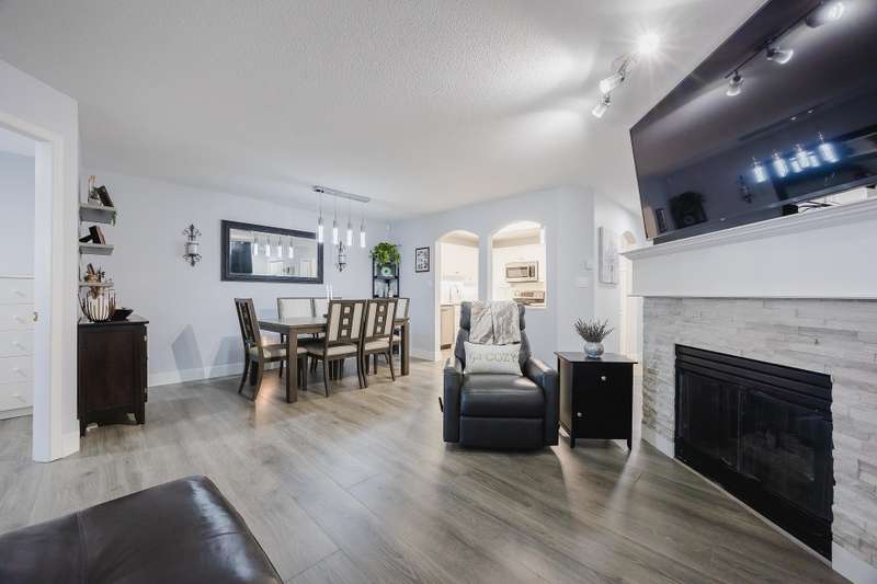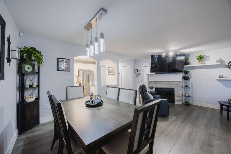 Welcome to Derby Downs! South-facing 2-bed, 1.5-bath offers 986 sq ft of stylish living. Updates include SS appliances, flooring, lighting, paint, and blinds. A spacious primary bedroom fits a full king set. In-suite laundry. Fully fenced private yard with gate offers walk-in access. Strata fee includes in-floor radiant heat, hot water, and gas. Amenities: guest suite, amenity room, gym, workshop, EV stations. Walk to shops, dining, schools, and the future Cloverdale Hospital. Owner-loved for 19 years! Wonderful ammenities room with a full kitchen, pool table and outdoor patio, parking is right next to elevator and a large storage locker!