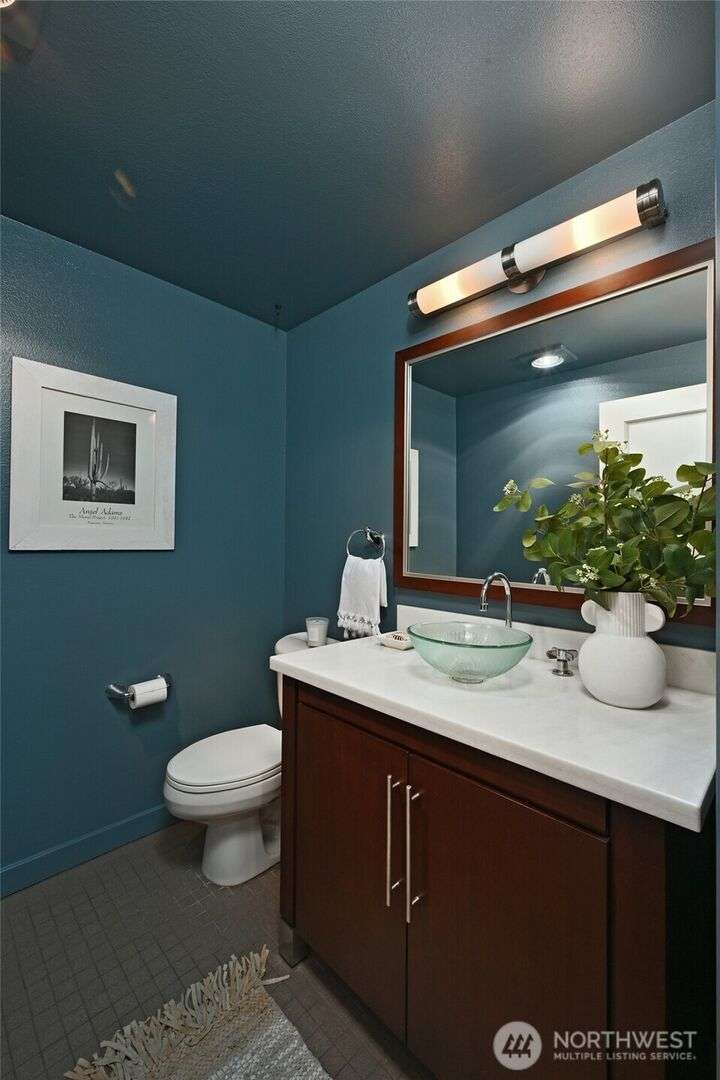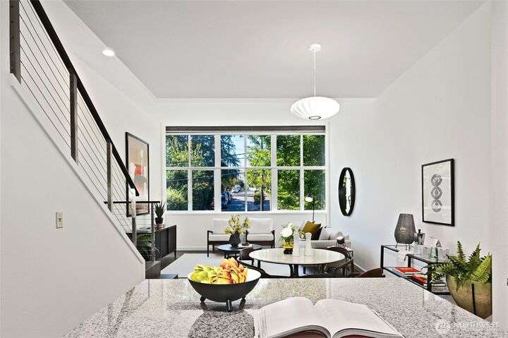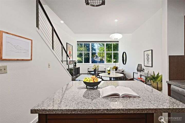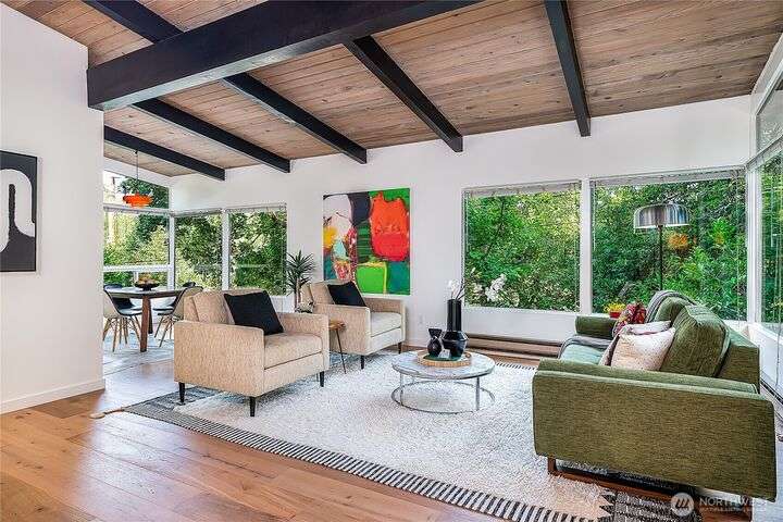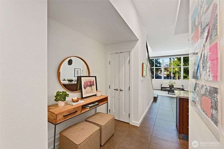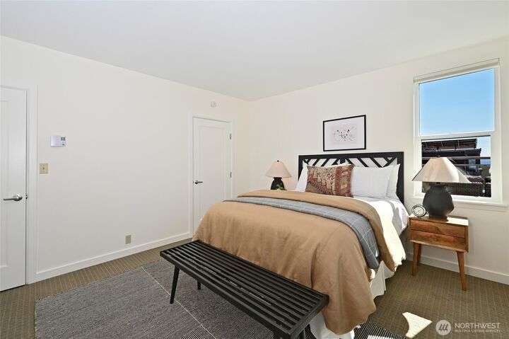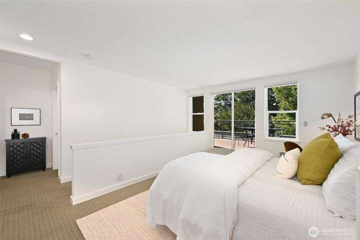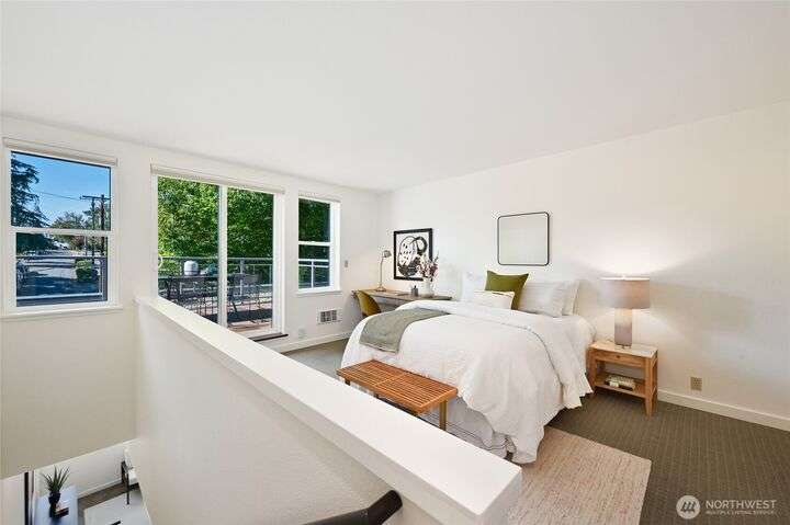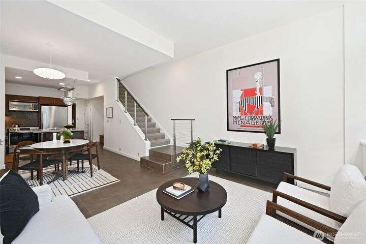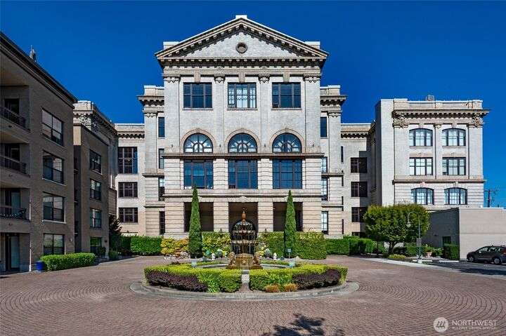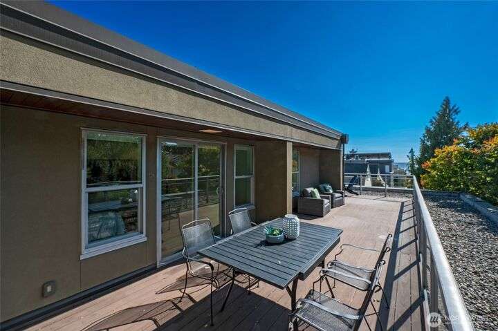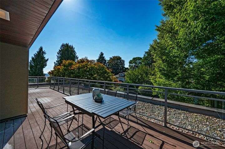 Stunning & light filled top floor townhome style condo perched perfectly w/in the Queen Anne High School Industrial Arts Bldg, a true mid-century modern gem. Breathtaking windows in the lofted main flood the space w/westerly light & leafy green views. Open kitchen, dining, living + 1/2 bath make for an entertainer’s dream. Upstairs: 2 spacious & bright bedrooms, full bath, large closets, full-size laundry & a SPECTACULAR 400 sq ft wraparound deck w/sweeping territorial, mountain & sound VIEWS for yr-round indoor-outdoor living. TWO secure garage spots + storage unit complete this home. Steps to Queen Anne’s shopping, dining & parks w/easy access to SLU. No rental cap & pets OK. Perfect full-time residence or peaceful in-city pied-à-terre.