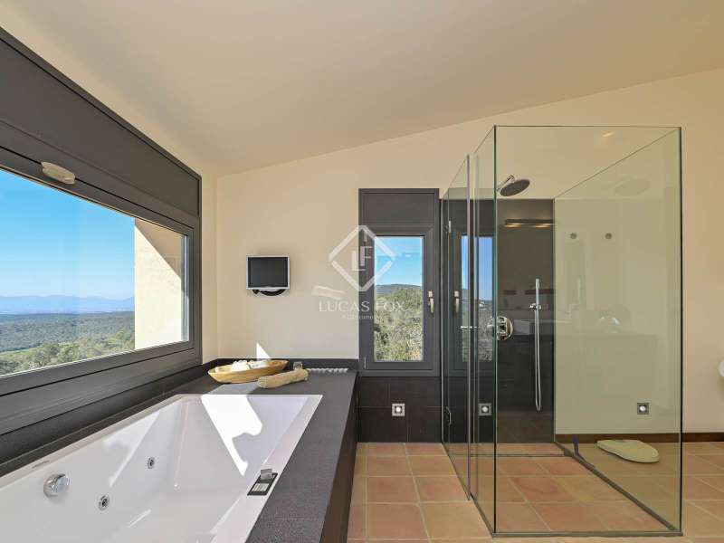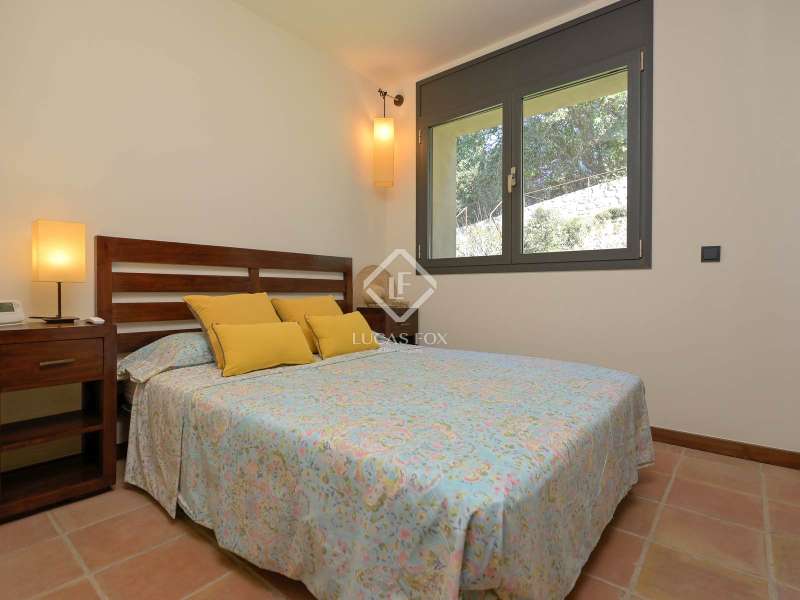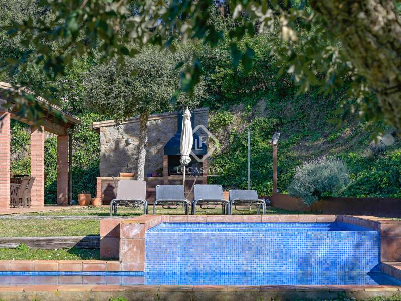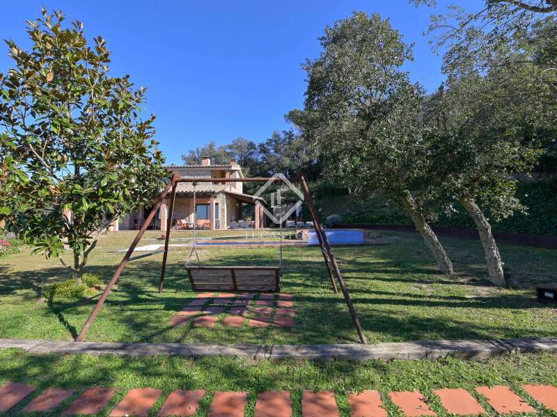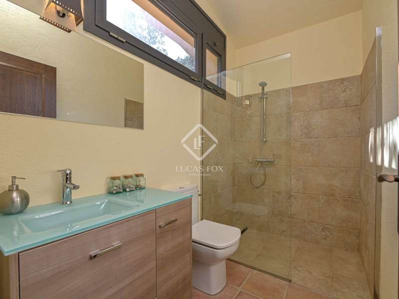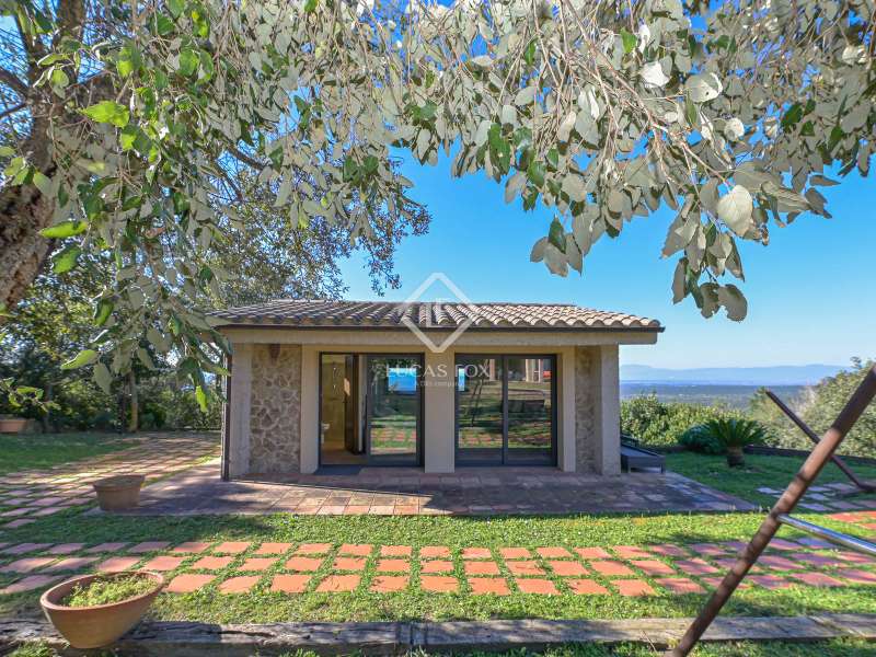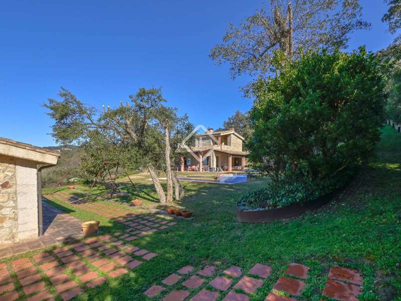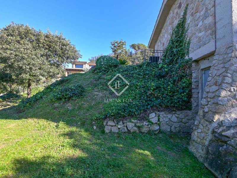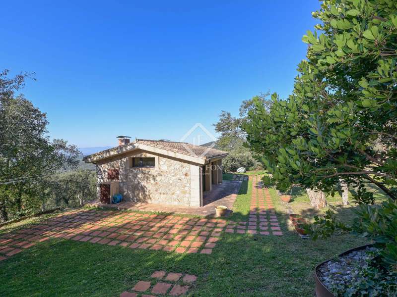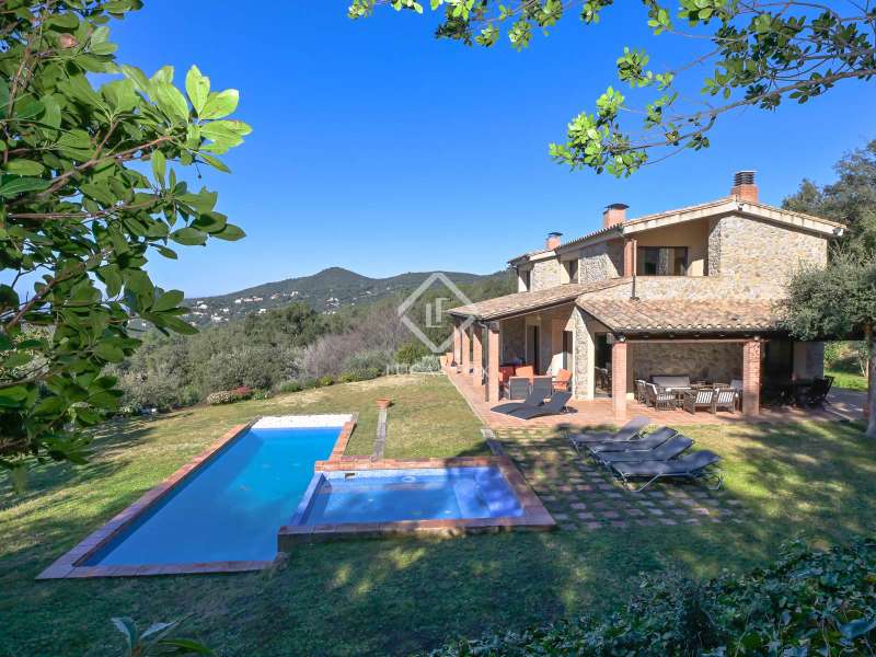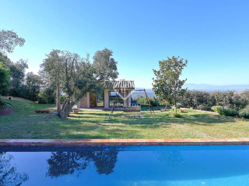 Lucas Fox is pleased to present this unique and characterful villa in Romanyà de la Selva, one of the most exclusive and peaceful areas of Santa Cristina d'Aro, on the Costa Brava. It is located in a protected natural setting, with unparalleled mountain views, just 15 minutes from the area's most idyllic beaches and coves. This 2008 property sits on a generous, sunny plot of 2,881 m². It consists of the main villa and a charming guest house, both designed in a meticulous and elegant rustic style. The Mediterranean garden extends over several levels and includes chill-out areas , fruit trees, and a spectacular saltwater pool. The main villa faces southwest, allowing for exceptional light throughout the day and unforgettable sunsets. The main floor offers a large open space with high wooden ceilings and warm finishes that houses the living room with a fireplace, the dining room , and a designer kitchen with a central island and high-end equipment. From here, there is direct access to a spacious porch with a summer dining room , a chill-out area , and a barbecue, ideal for celebrations or relaxing with the views. On this same level are two double bedrooms with built-in wardrobes, one of them with direct access to the garden, and a full bathroom . The upper floor is dedicated exclusively to the main bedroom suite, with a fireplace, dressing area, private study , and a balcony with panoramic mountain views. An elegant bathroom with a bathtub, shower, and floor-to-ceiling windows completes the bedroom. On the basement floor , the villa features a large garage for several vehicles, a gym with a Jacuzzi, a utility room , and a utility room. It also has a separate for staff apartment with a living room, kitchen, and full bathroom . This villa stands out for its noble materials, such as floors and porches of artisanal tuff and solid wood, as well as for its high-level equipment: underfloor heating, central air conditioning by heat pump, security shutters, water softener, preparation for installation of an elevator The guest house has a spacious double bedroom and full bathroom , with the possibility of expansion according to the buyer's needs. This villa offers an incomparable lifestyle in a setting of great natural beauty, with complete privacy and tranquility, just minutes from the Costa Brava's best beaches, golf courses, and city centre amenities . For more information or to arrange a private viewing, please do not hesitate to contact us.