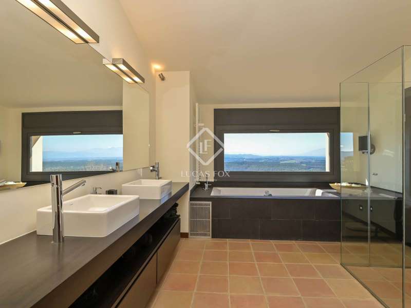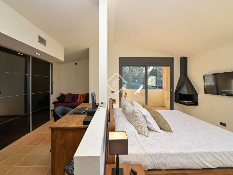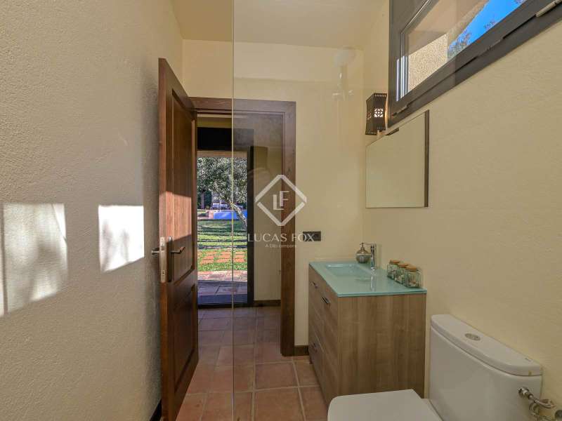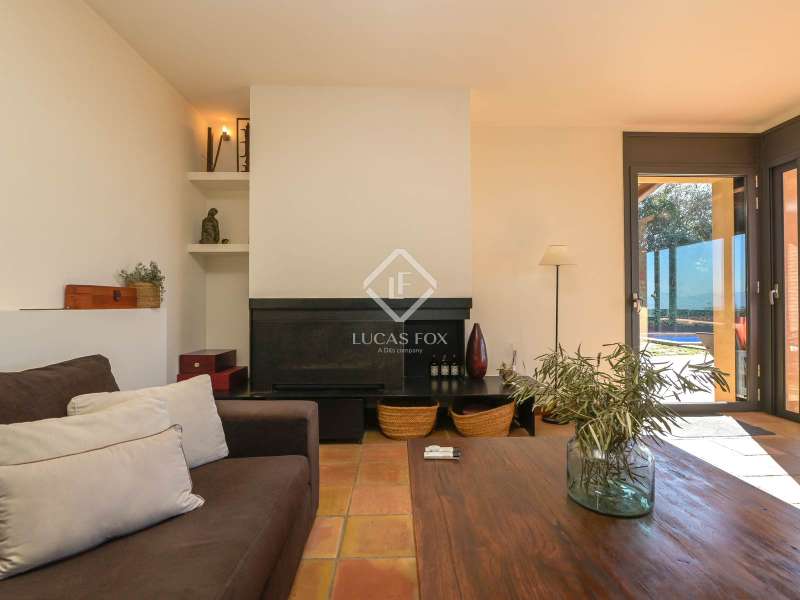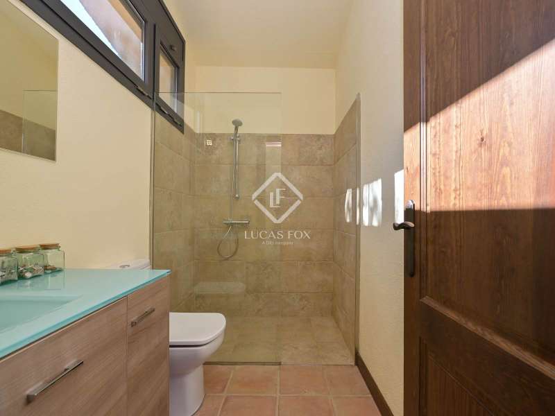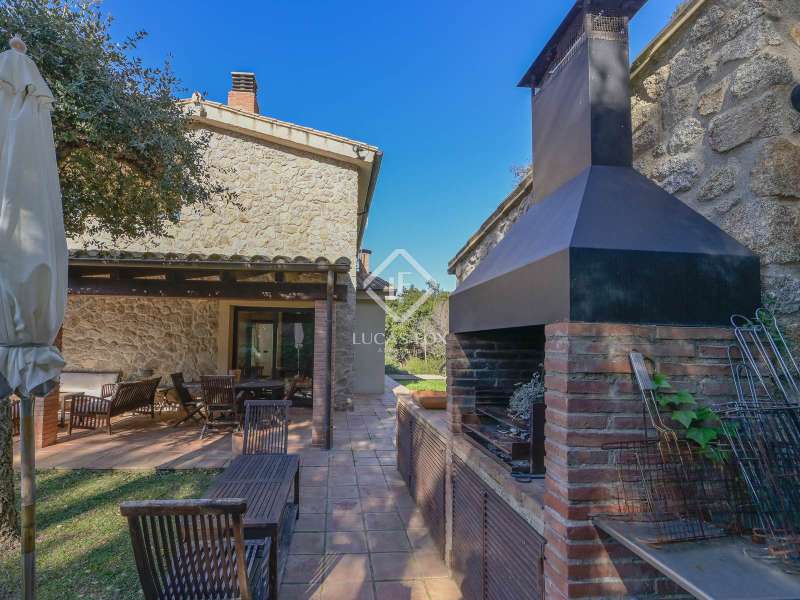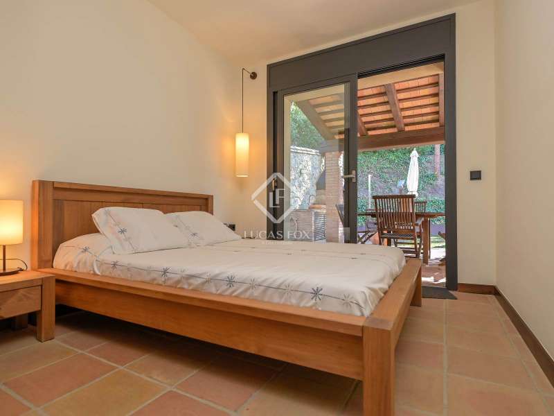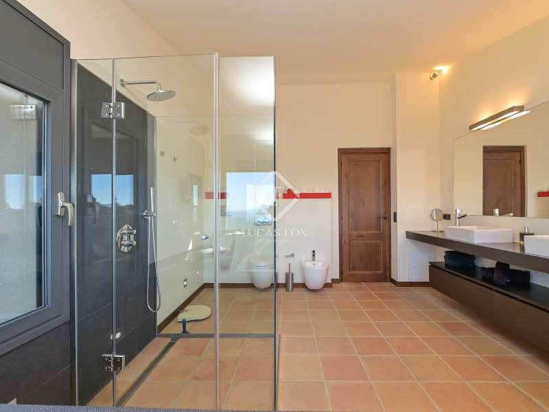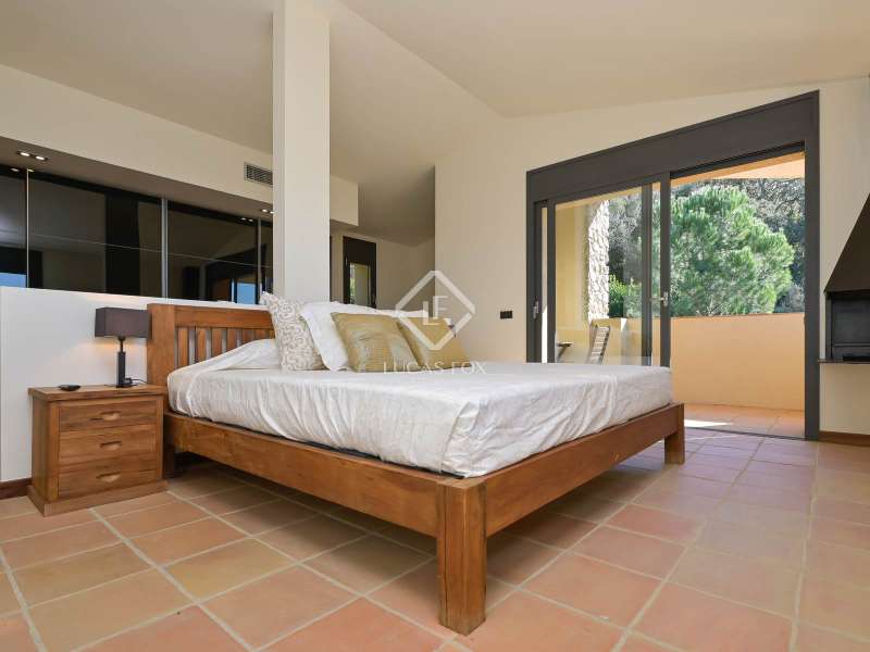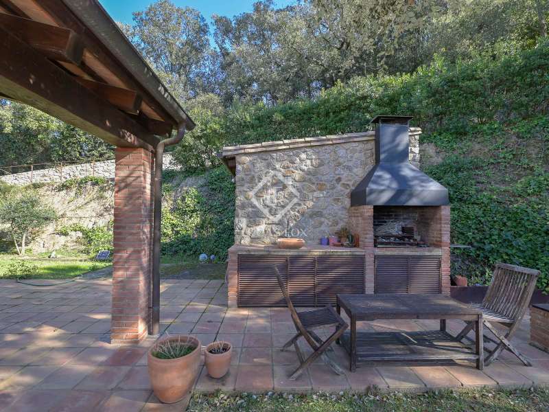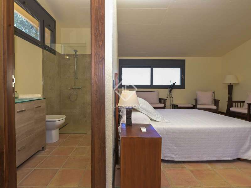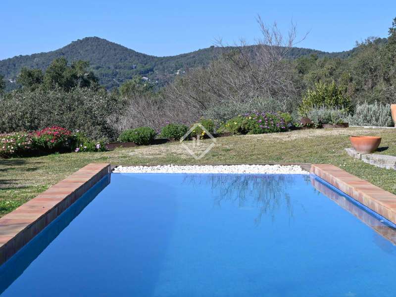 Lucas Fox is pleased to present this unique and characterful villa in Romanyà de la Selva, one of the most exclusive and peaceful areas of Santa Cristina d'Aro, on the Costa Brava. It is located in a protected natural setting, with unparalleled mountain views, just 15 minutes from the area's most idyllic beaches and coves. This 2008 property sits on a generous, sunny plot of 2,881 m². It consists of the main villa and a charming guest house, both designed in a meticulous and elegant rustic style. The Mediterranean garden extends over several levels and includes chill-out areas , fruit trees, and a spectacular saltwater pool. The main villa faces southwest, allowing for exceptional light throughout the day and unforgettable sunsets. The main floor offers a large open space with high wooden ceilings and warm finishes that houses the living room with a fireplace, the dining room , and a designer kitchen with a central island and high-end equipment. From here, there is direct access to a spacious porch with a summer dining room , a chill-out area , and a barbecue, ideal for celebrations or relaxing with the views. On this same level are two double bedrooms with built-in wardrobes, one of them with direct access to the garden, and a full bathroom . The upper floor is dedicated exclusively to the main bedroom suite, with a fireplace, dressing area, private study , and a balcony with panoramic mountain views. An elegant bathroom with a bathtub, shower, and floor-to-ceiling windows completes the bedroom. On the basement floor , the villa features a large garage for several vehicles, a gym with a Jacuzzi, a utility room , and a utility room. It also has a separate for staff apartment with a living room, kitchen, and full bathroom . This villa stands out for its noble materials, such as floors and porches of artisanal tuff and solid wood, as well as for its high-level equipment: underfloor heating, central air conditioning by heat pump, security shutters, water softener, preparation for installation of an elevator The guest house has a spacious double bedroom and full bathroom , with the possibility of expansion according to the buyer's needs. This villa offers an incomparable lifestyle in a setting of great natural beauty, with complete privacy and tranquility, just minutes from the Costa Brava's best beaches, golf courses, and city centre amenities . For more information or to arrange a private viewing, please do not hesitate to contact us.