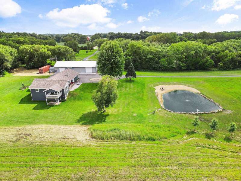 Discover your dream retreat! This 5 bedroom, 3.5 bath home sits on 12+ private acres with a secluded driveway, a peaceful pool/pond, and enjoy coffee in the morning with the three-season porch. Remodeled primary bathroom, new security gate, remodeled kitchen, new roof/siding, recent lower level addition with walk out to private yard. 80X40 HUGE outbuilding, insulated, heated, ready to go, PLUS 3 car garage. Complete privacy from all neighbors, in seclusion. Inside offers spacious living, while just across the street from Camrock Trails!