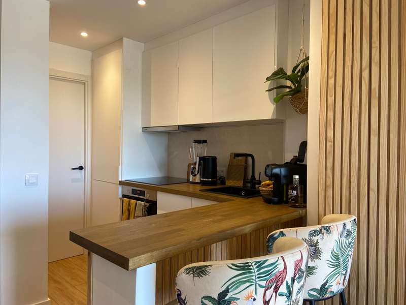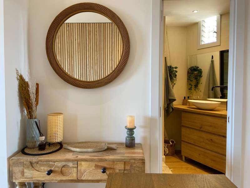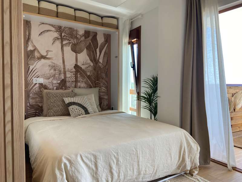 This bright studio in Sant Agustí perfectly blends modern functionality with Mediterranean charm. From the moment you enter, you are welcomed by an open-plan layout where the living area, kitchen, and sleeping space flow together with balance and warmth. Large windows invite natural light inside and frame beautiful sea views, creating a calm and inviting atmosphere. The interior has been carefully designed in a boho-Scandi style, combining soft tones, natural textures, and a sense of harmony throughout. A modern bathroom and an integrated workspace make the apartment ideal for both everyday living and remote work. The studio is sold fully furnished and equipped down to the last detail, so you can simply bring your suitcase and move in straight away. Located in a peaceful yet well-connected part of Palma, the property offers both tranquility and convenience. The beach is only a short stroll away, and residents enjoy access to a community swimming pool, perfect for relaxing under the
