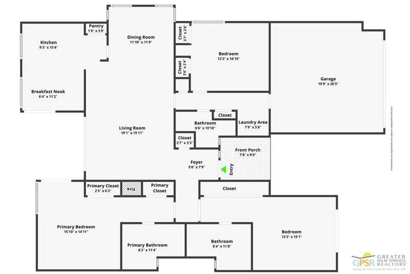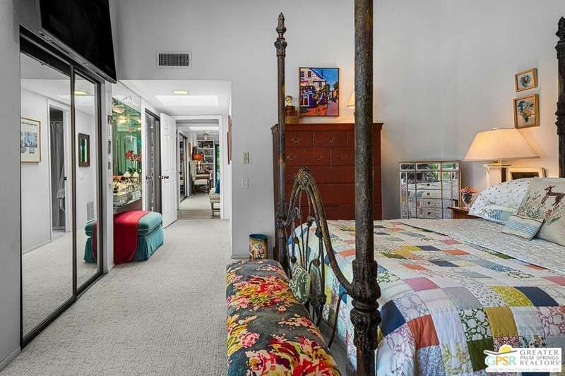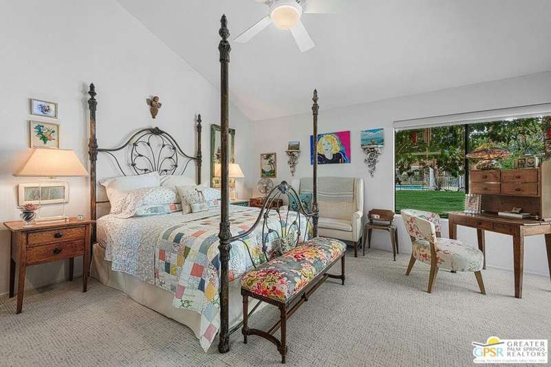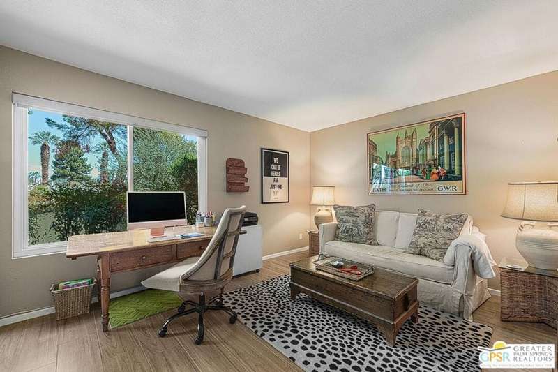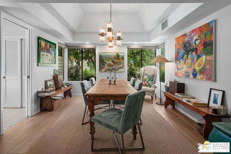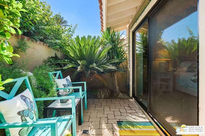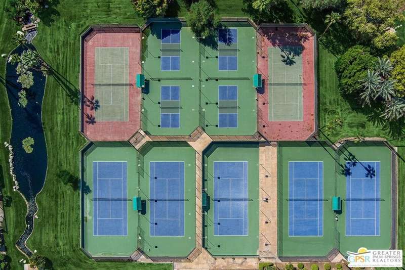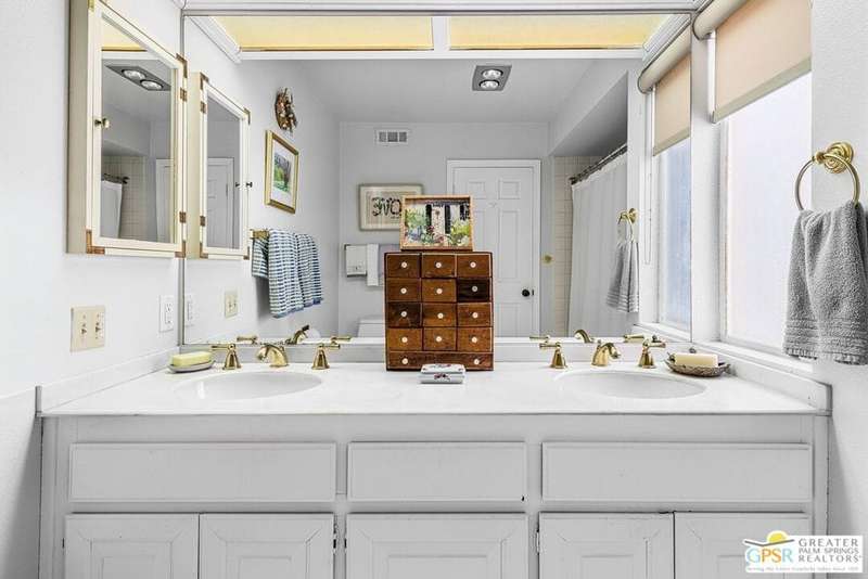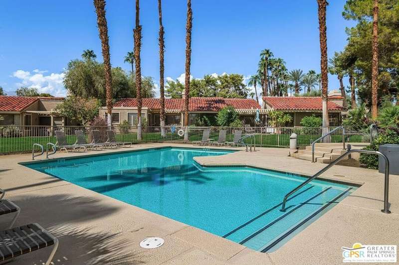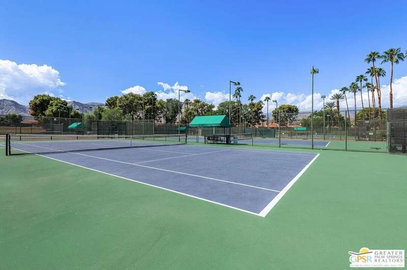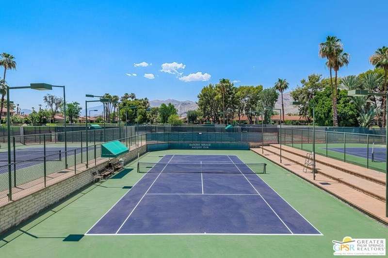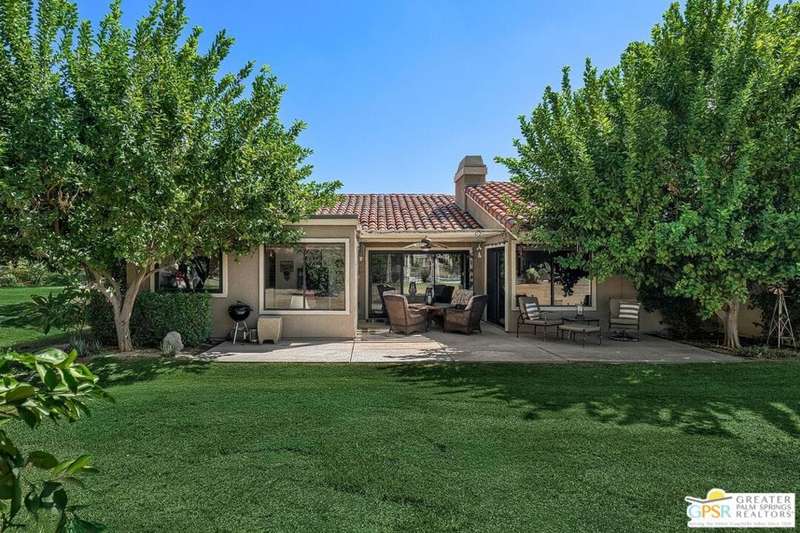 Located in the gated community of Rancho Mirage Racquet Club, this single-level home welcomes you with bright, open living spaces designed for both everyday comfort and entertaining. Vaulted ceilings, abundant natural light, and a fireplace create a sense of volume and warmth in the main living areas, while a wet bar off the kitchen makes gatherings effortless. The breakfast nook captures views across the community greenbelt, pool, and mountains, bringing the outdoors into daily life. Two primary suites offer privacy and convenience, each with its own ensuite bath. A third bedroom provides flexibility for guests or a home office, with an adjacent hall bath that also serves as a powder room. Outdoor living is equally inviting, with multiple patios that extend the interiors outside. A private walled courtyard offers an intimate retreat, while the south-facing patio is shaded by a pergola and framed by mature fruit trees, creating a lush and fragrant backdrop for dining or relaxation. Residents of Rancho Mirage Racquet Club enjoy five pools, five spas, tennis and pickleball courts, a fitness center, racquetball court, and a clubhouse with kitchen and bar. Landscaped grounds, lakes and walking paths complete the setting. Only minutes from Rancho Mirage dining, shopping, and recreation.