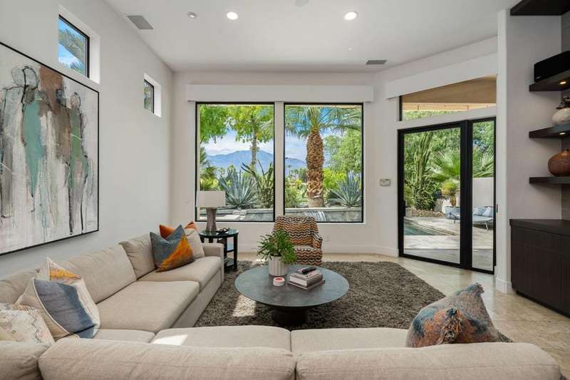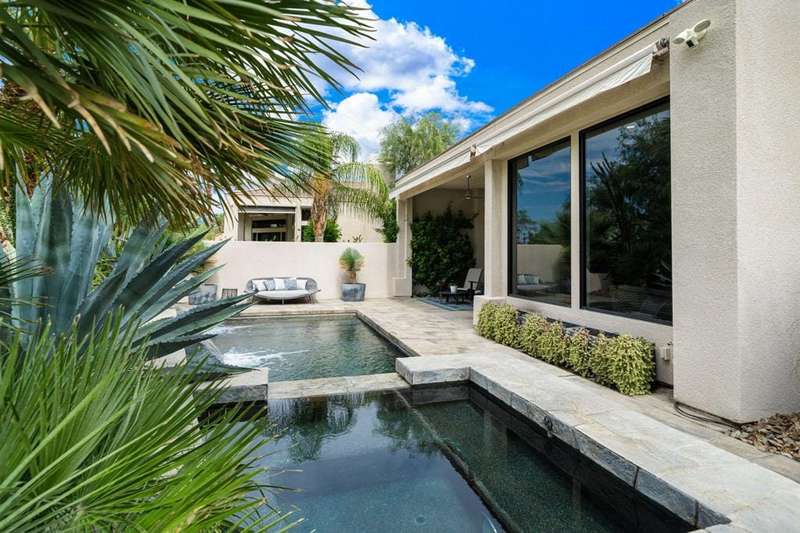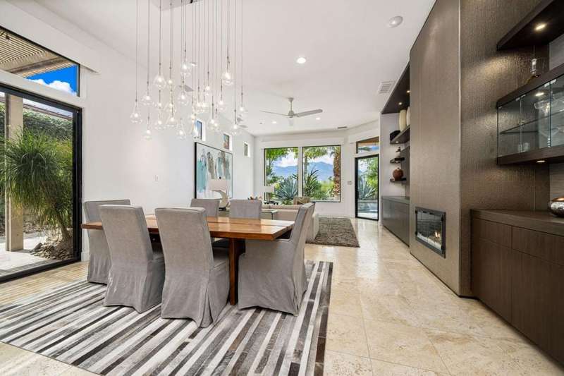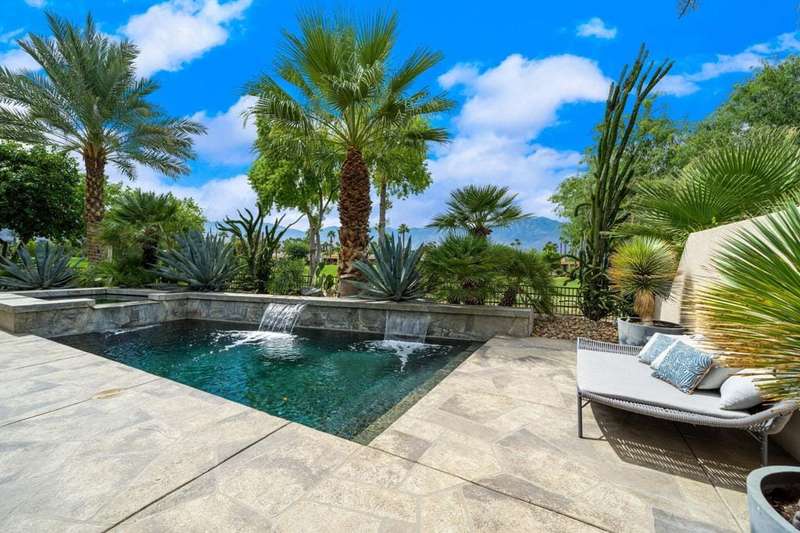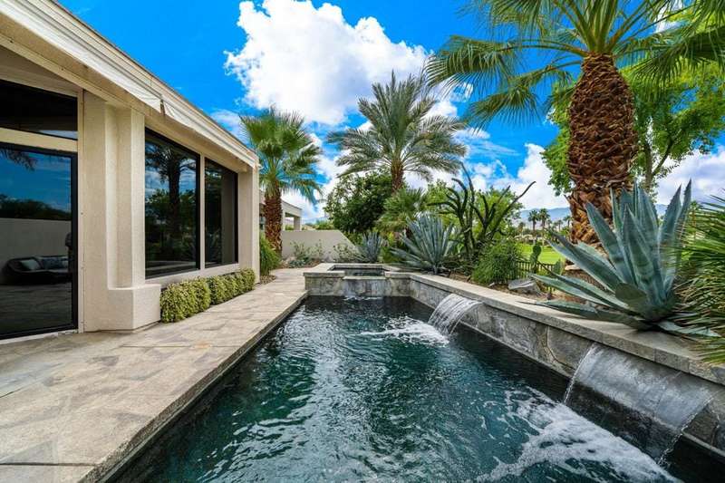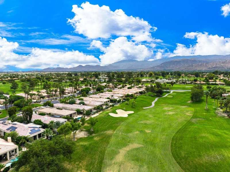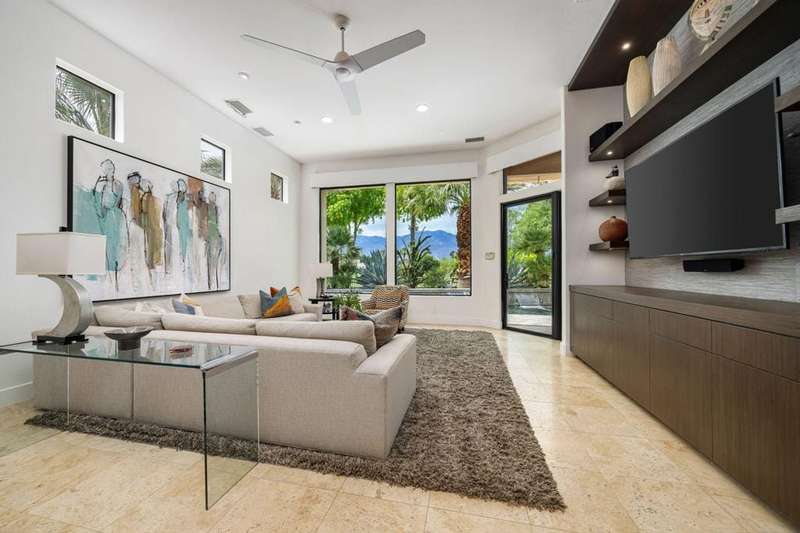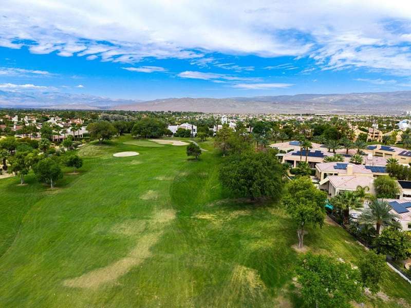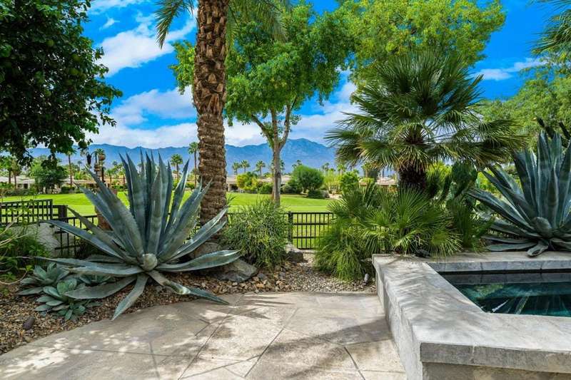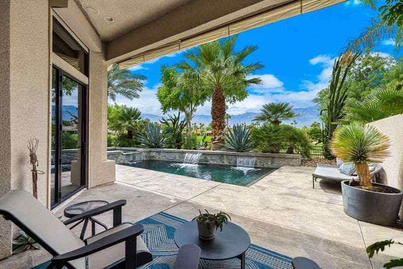 Experience expansive Western Mountain and fairway views from this beautifully updated, move in ready home in the prestigious Stoneridge Estates on the Pete Dye course. Be welcomed by lush landscaping and resort-like ambiance. Inside, the open-concept Great Room, Dining Area, and Gourmet Kitchen are designed for effortless entertaining. The Great Room showcases elegant travertine flooring, a custom-built-in entertainment center with fireplace and panoramic San Jacinto view. Chef's Kitchen has Sub-Zero, Dacor cooktop, quartz countertops, loads of storage and spacious eat-in area. Kitchen and dining areas open to patio with lounge area including fire pit, dining area, 2 built-in grills, and misters. Primary Suite offers stunning mountain views and completely remodeled, spa like bath with walk-in shower, soaking tub, and custom walk-in closet. Expanded Guest Suite features a custom mural and office/sitting area. Third bedroom--currently a den/office--boasts floor-to-ceiling built-in shelving and ensuite bath. Bonus room by laundry is ideal as home gym or office. Saltwater pool/spa and shaded living space overlook fairways and mountains, Owned solar with back up battery. Fee land with low HOA includes social/fitness membership to Mission Hills Country Club.