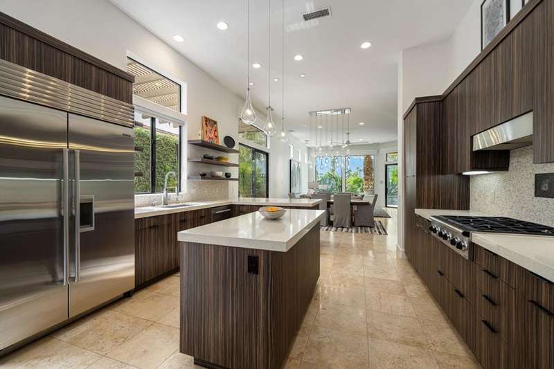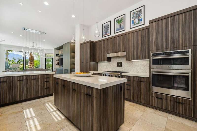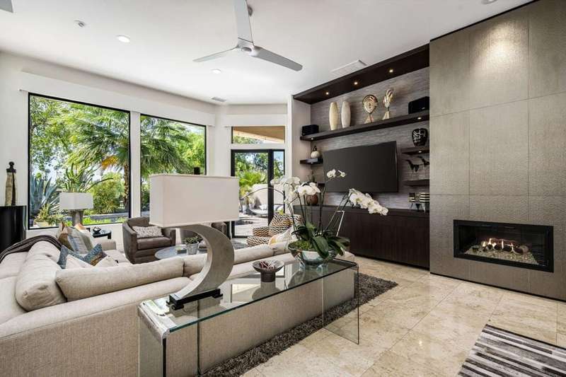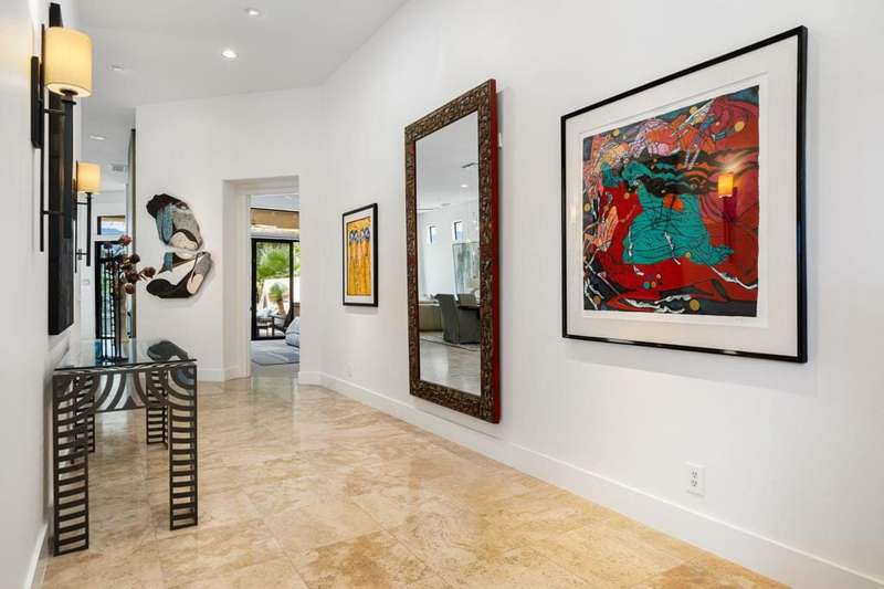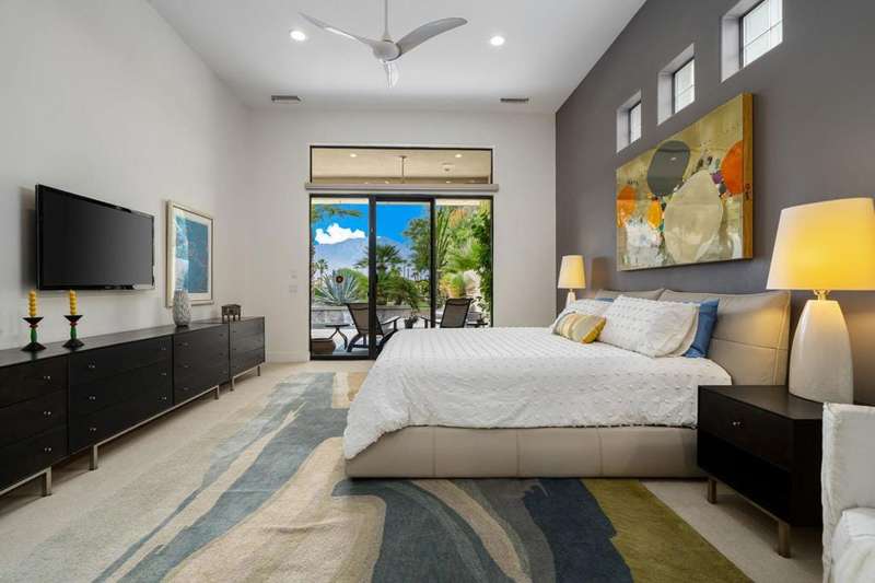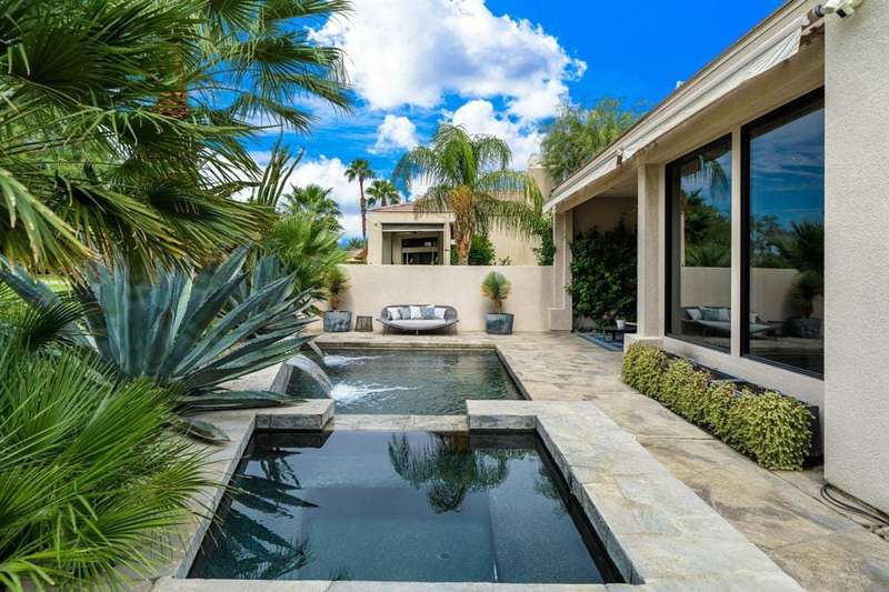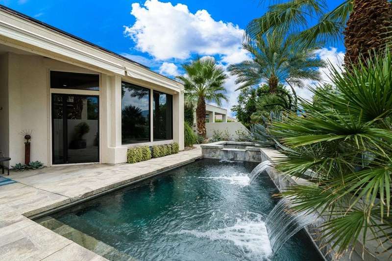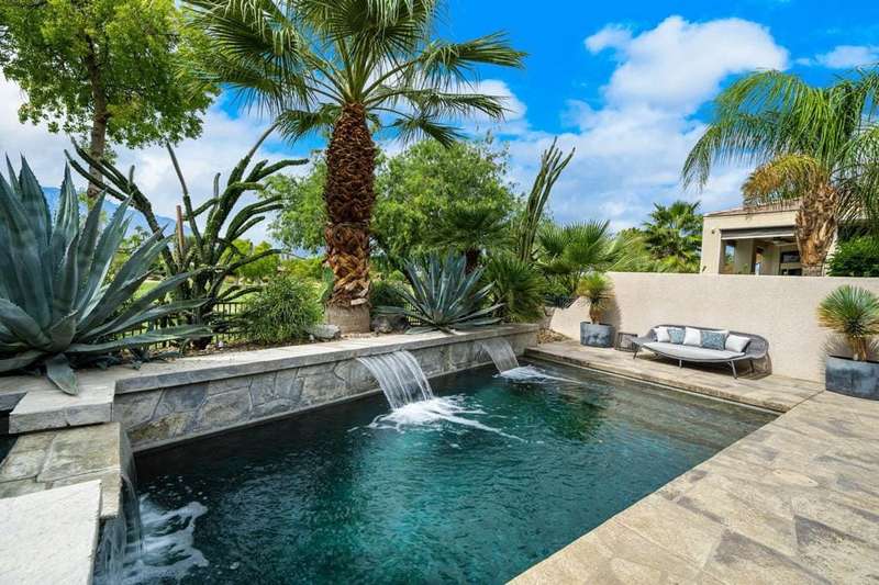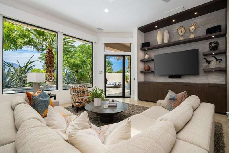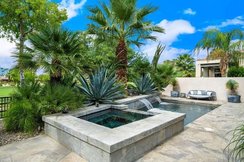 Experience expansive Western Mountain and fairway views from this beautifully updated, move in ready home in the prestigious Stoneridge Estates on the Pete Dye course. Be welcomed by lush landscaping and resort-like ambiance. Inside, the open-concept Great Room, Dining Area, and Gourmet Kitchen are designed for effortless entertaining. The Great Room showcases elegant travertine flooring, a custom-built-in entertainment center with fireplace and panoramic San Jacinto view. Chef's Kitchen has Sub-Zero, Dacor cooktop, quartz countertops, loads of storage and spacious eat-in area. Kitchen and dining areas open to patio with lounge area including fire pit, dining area, 2 built-in grills, and misters. Primary Suite offers stunning mountain views and completely remodeled, spa like bath with walk-in shower, soaking tub, and custom walk-in closet. Expanded Guest Suite features a custom mural and office/sitting area. Third bedroom--currently a den/office--boasts floor-to-ceiling built-in shelving and ensuite bath. Bonus room by laundry is ideal as home gym or office. Saltwater pool/spa and shaded living space overlook fairways and mountains, Owned solar with back up battery. Fee land with low HOA includes social/fitness membership to Mission Hills Country Club.